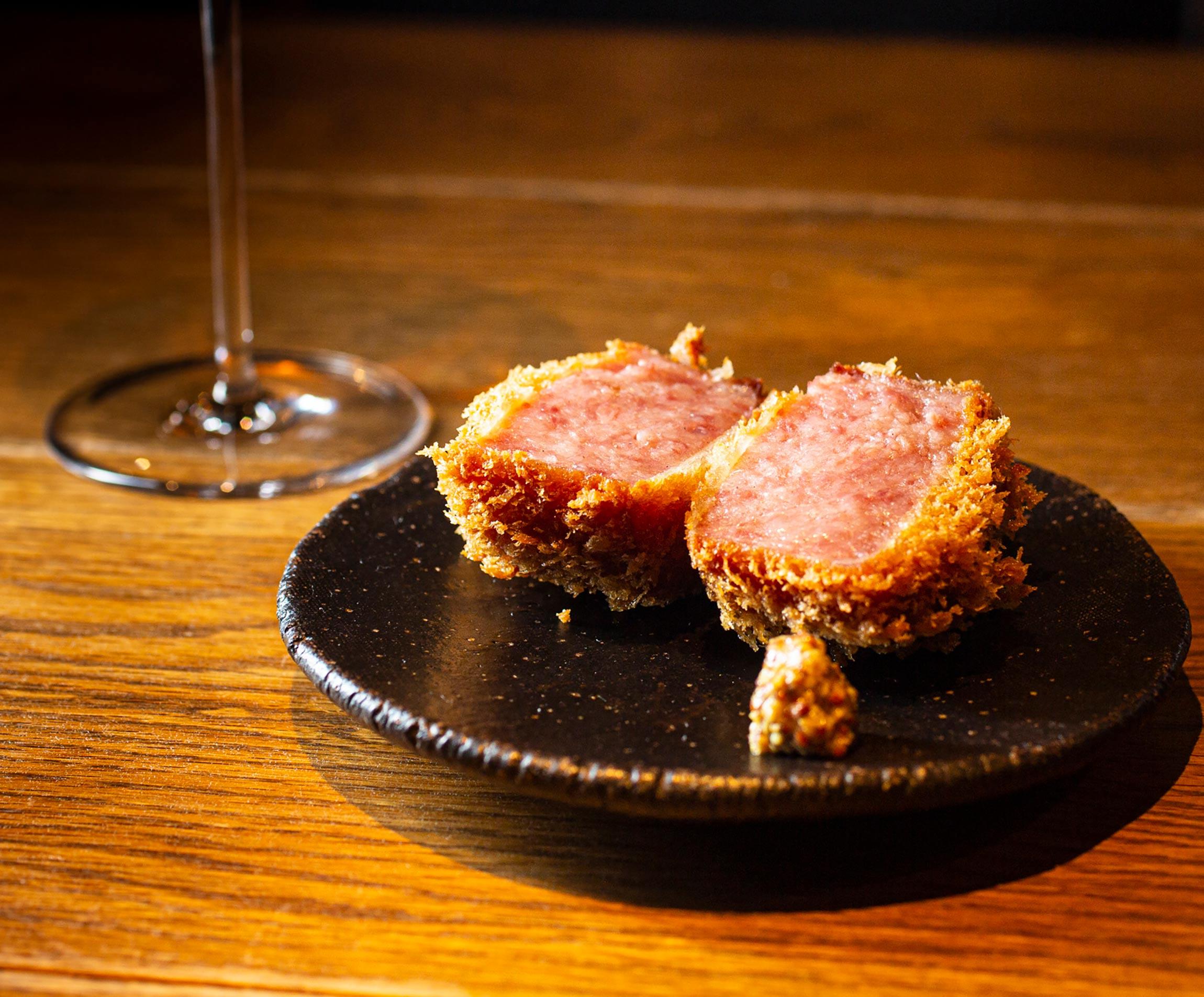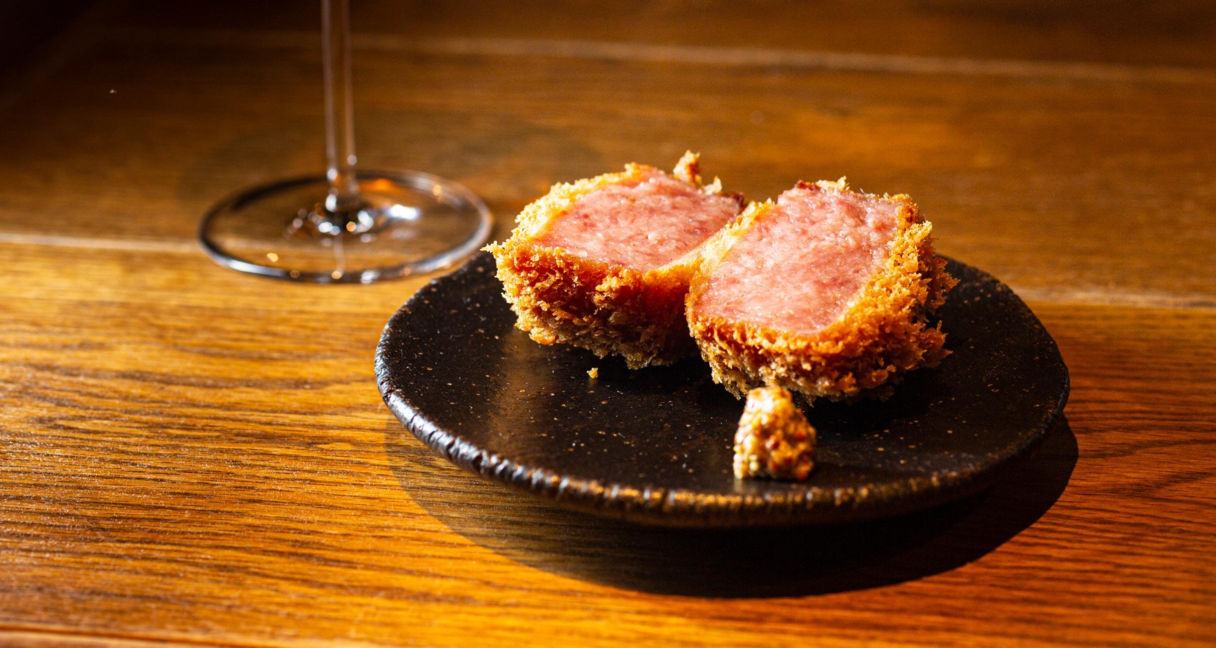私はコロッケには目がないが、ハムカツも大好物。大好きな揚げ物とジョージアワインのペアリングを試さないわけがない。