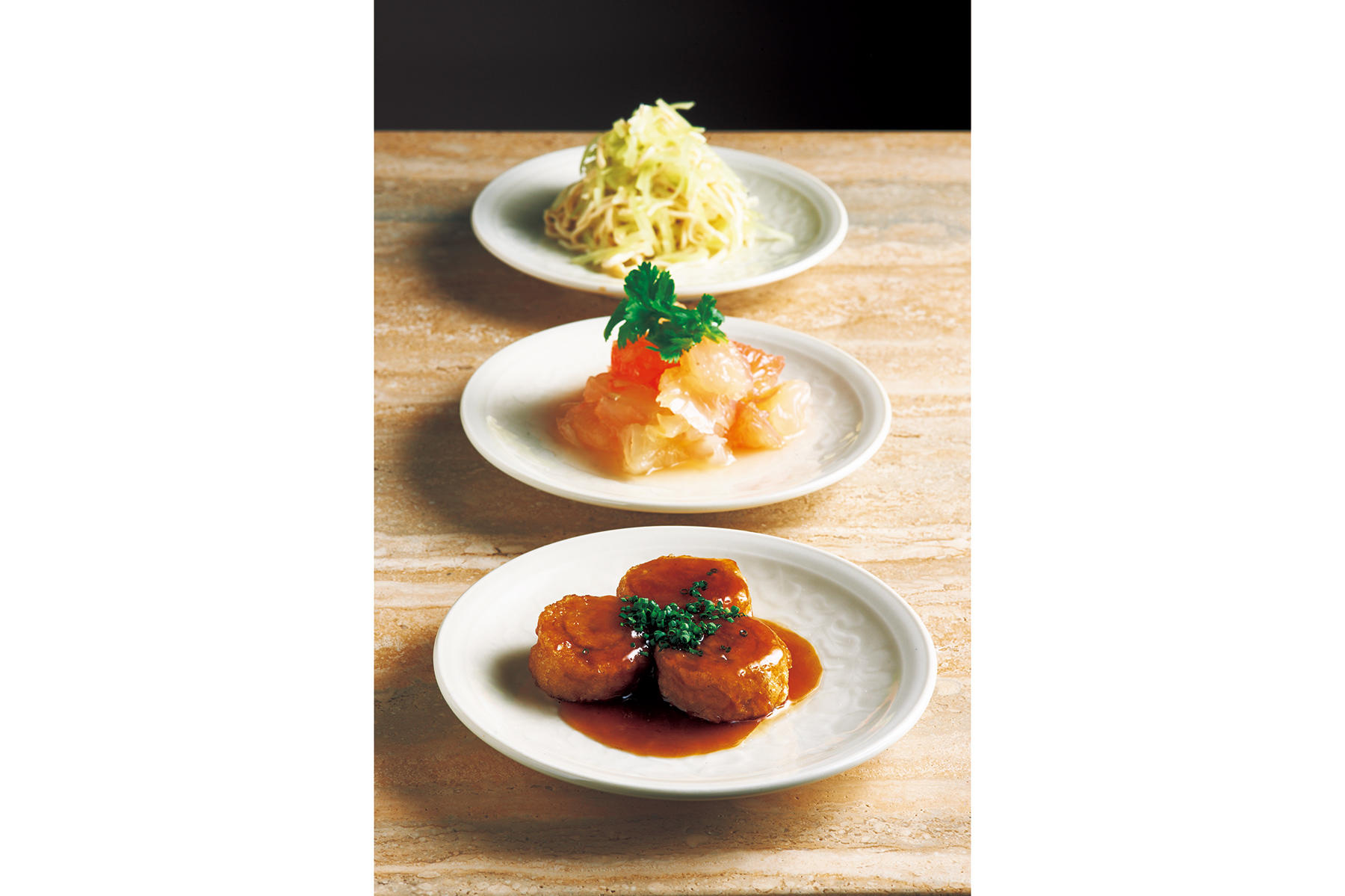 たとえばこの日の前菜は、薫りのマネジメントに唸る三品。茎レタスとも呼ばれるチシャトウ、クラゲ、中国湯葉に、それぞれ、葱油、木姜油(レモングラスの薫りがするオイル)、五香粉をまとわせ、奥行きと広がりをもたらしてみせた。