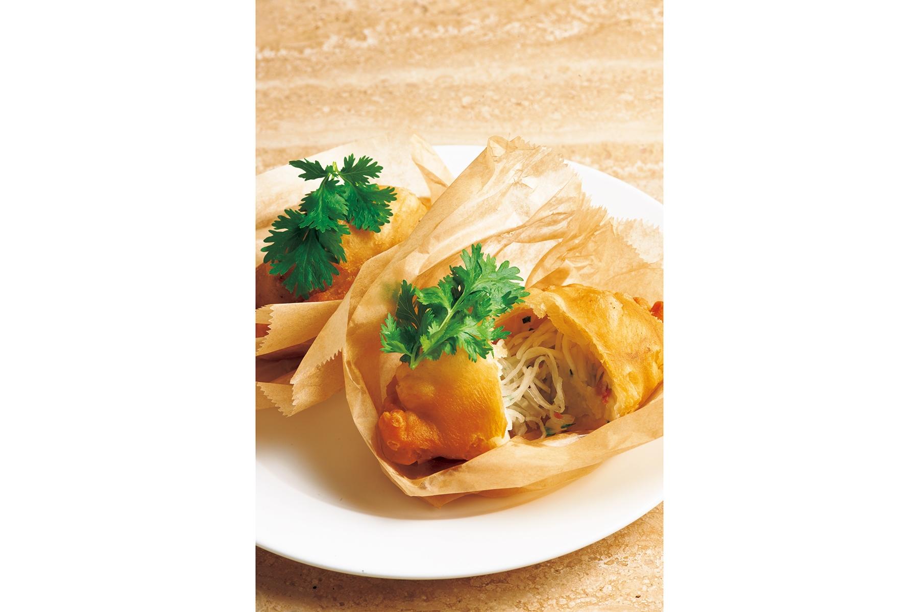 また、大根パイと名付けられたそれは、一見ロシアのピロシキ。点心の定番、大根餅のようなものかしらと、恐る恐る前歯を突き立てる。すると、存外に軽い生地の中から、嬉しい誤算が。シャキシャキ感とクッタリ感を持ち合わせたかつてない食感。なるほど、白髪大根か。金華ハムの旨味をたっぷりと吸わせつつ、熱過ぎない程よい温度に仕上げ、甘みも存分に引き出している。何より驚いたのは後味の良さ。大根の水気が油分を全て受け止め、口の中はパイを食べた後とは思えぬほどさっぱり。美味である以上に、構成の妙を感じずにはいられない、そんな一品だ。