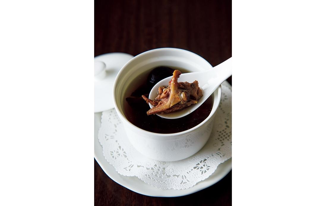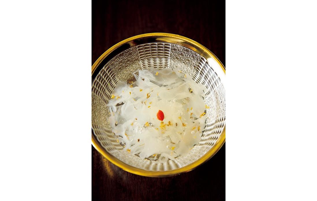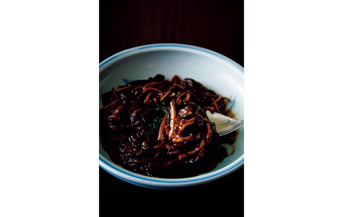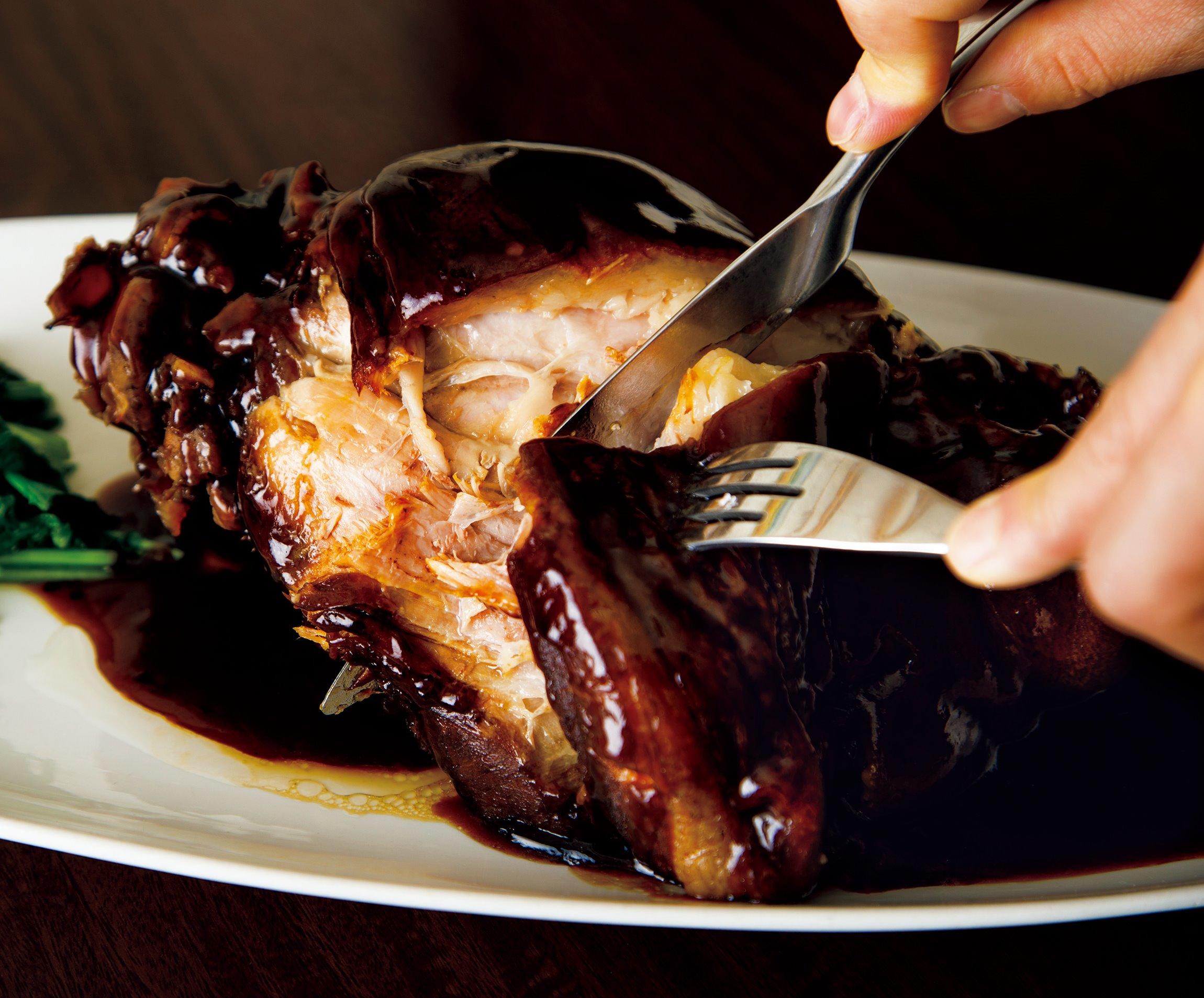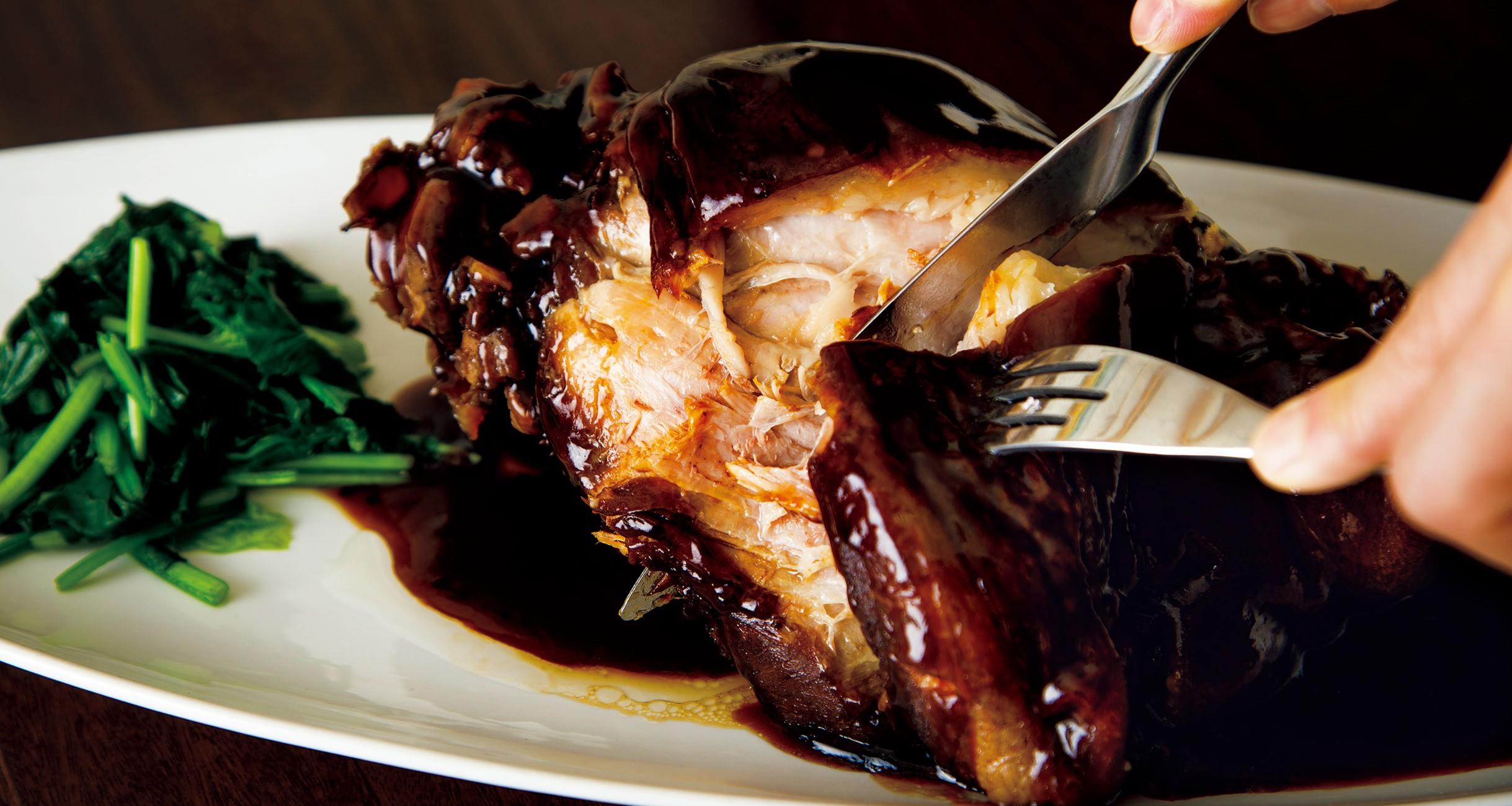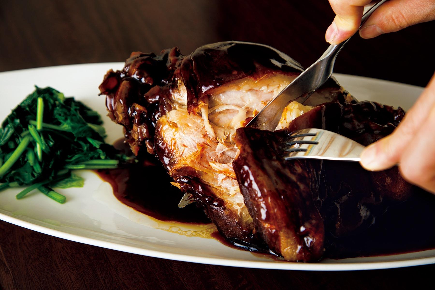 数ある料理の中でもスペシャリテは一日限定4本の“冰糖焼蹄膀(豚アイスバインの醤油煮込み)”。4時間半かけてじっくり火を入れ、箸で簡単に崩れる柔らかな食感に仕上げる。味つけは醤油と氷砂糖、水だけだ。店の雰囲気は本場さながらだが、食材重視の陸さんの料理はいずれも軽やかで、和食に通底する澄んだ味がする。「この煮汁は開店以来、注ぎ足しながら育てたもの。豚の脂の旨味とコラーゲンがたっぷり溶け込んでいますよ。見た目よりも味が濃くないのは、中国醤油ではなく、日本のたまり醤油とうす口醤油を使っているからです」。煮汁を味わい尽くすには、ご飯にのせ、豪快にかき混ぜて頬張るのがいい。