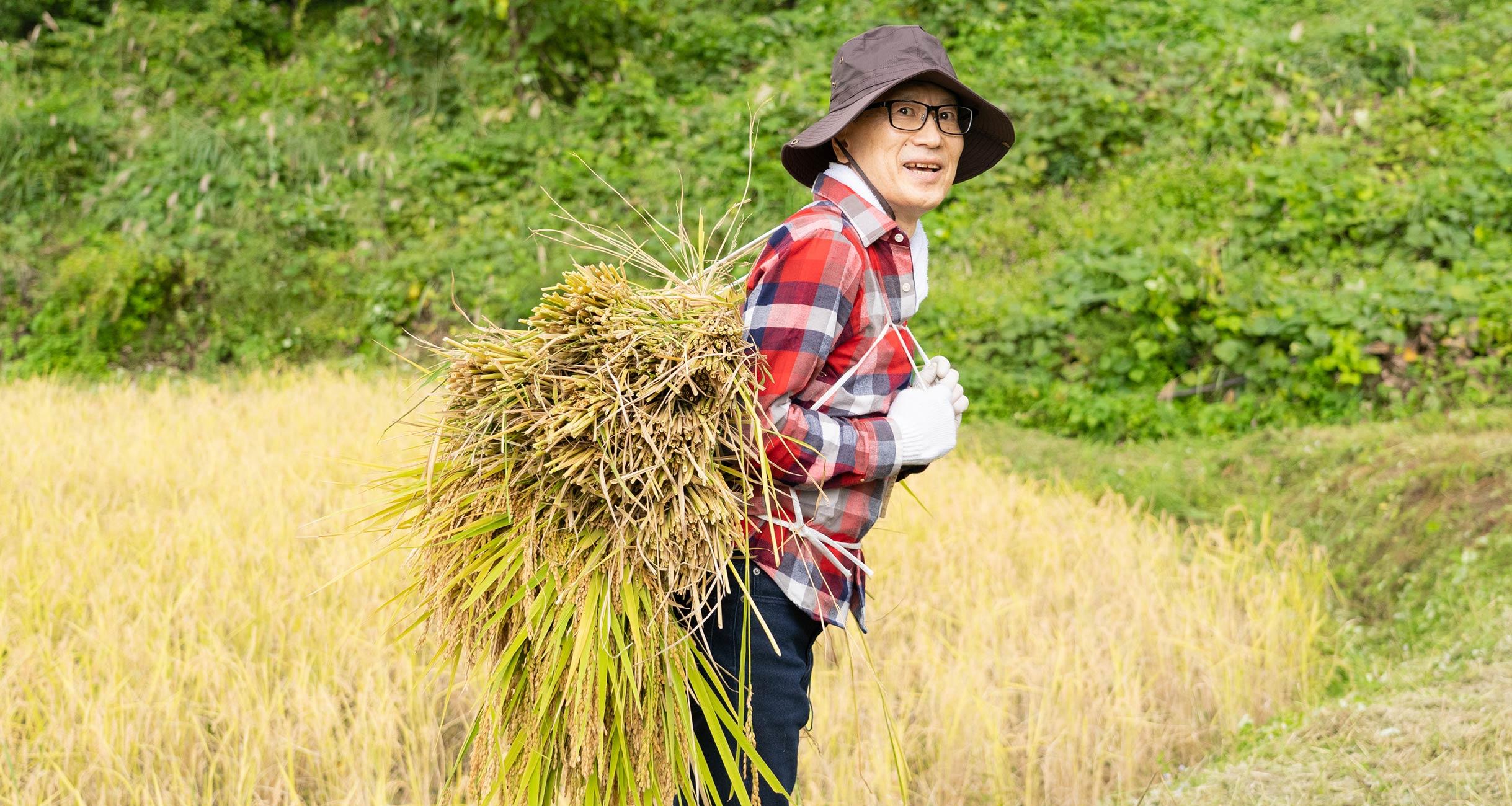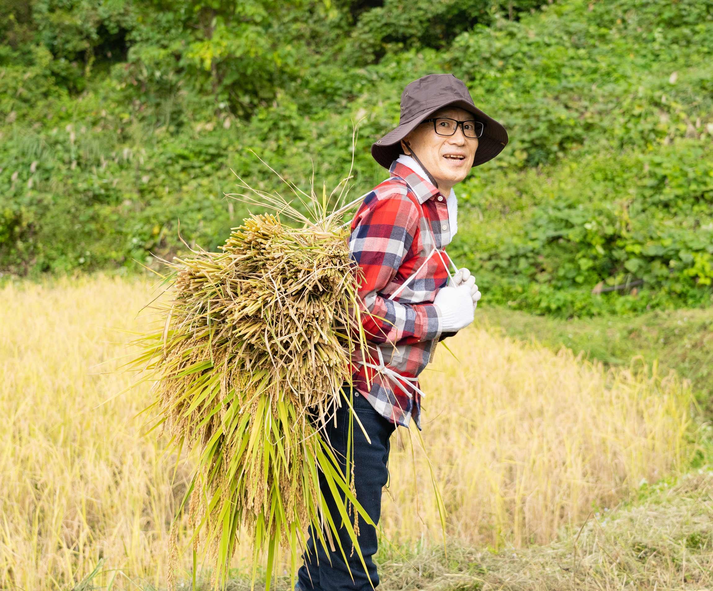 見学を終えて、わが棚田に着いた。予報どおり雨が上がっている。ひと足先に着いた棚田スタッフが田んぼで奮闘中だった。その中に見慣れない顔が。地元の農家の山賀一(はじめ)さんで、素人集団の収穫を心配して、駆けつけたのだ。