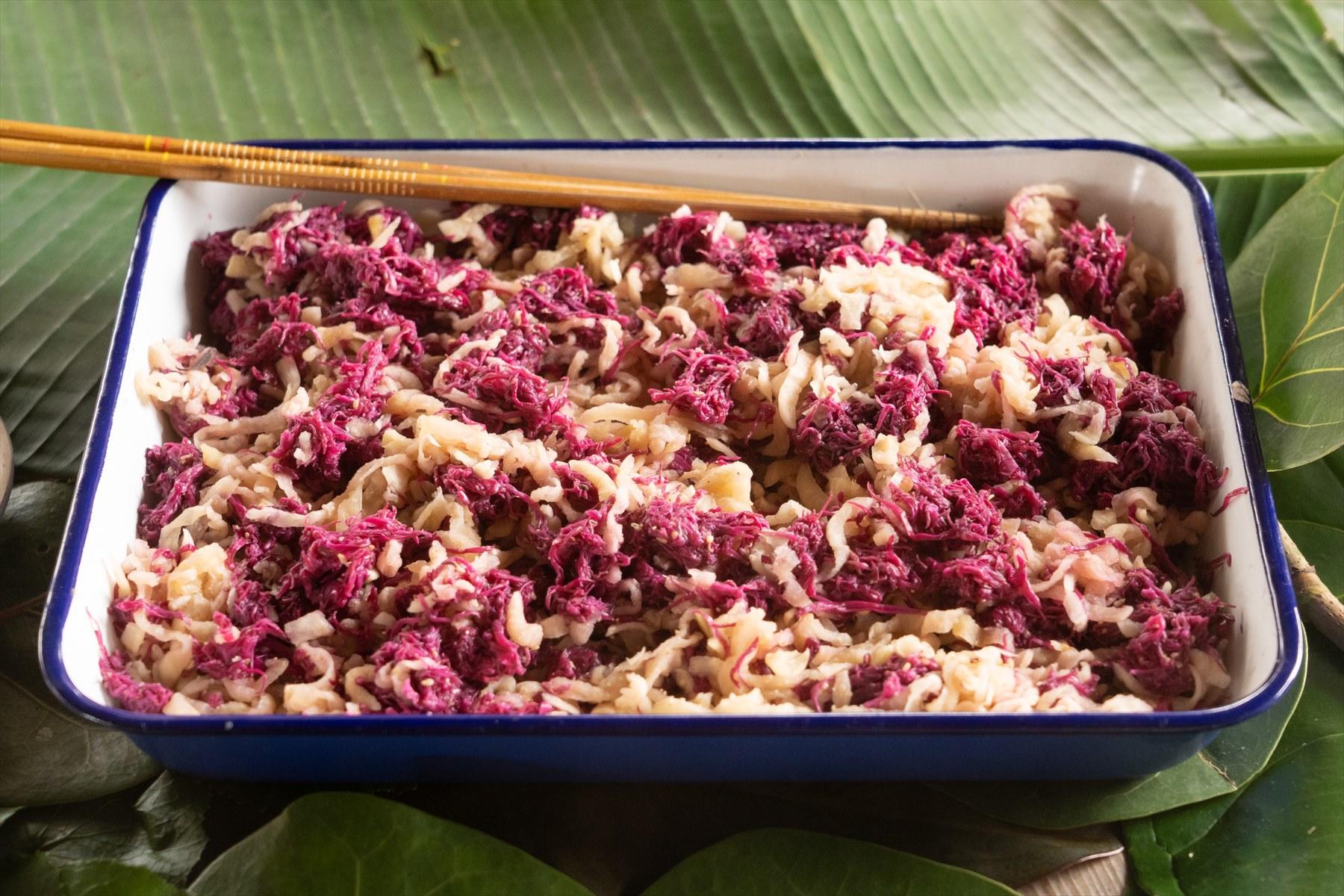 5月末の田植えに引き続き、秋のイネ刈りにも料理家のマツーラユタカさんからお昼ごはんが届いた。今回は「青果ミコト屋」の鈴木鉄平さんも、珍しい伝統野菜の料理を持参してくれた。稲刈り隊の面々も、このランチを心待ちにしていたようで、みんなに笑顔が広がっていく。