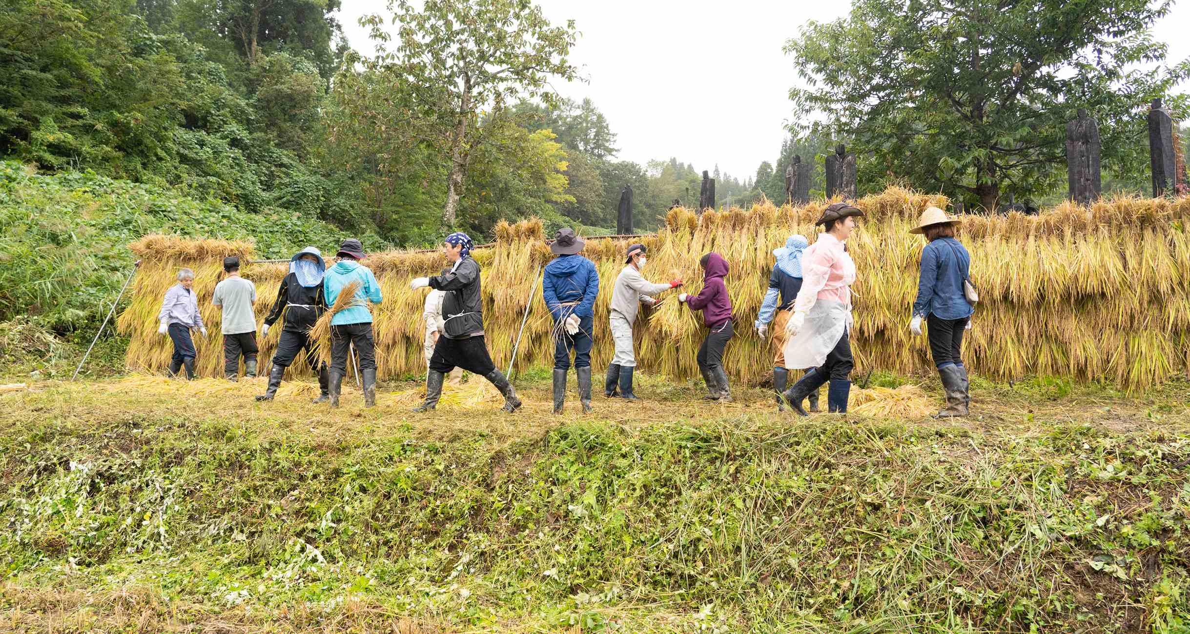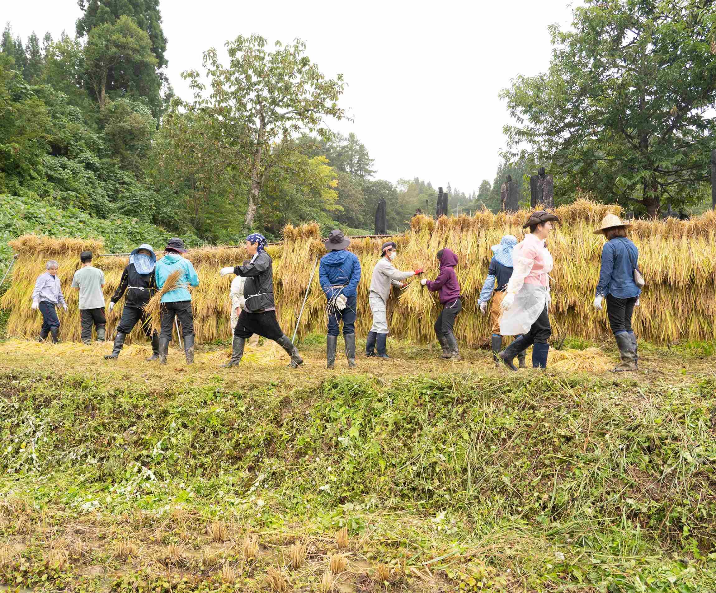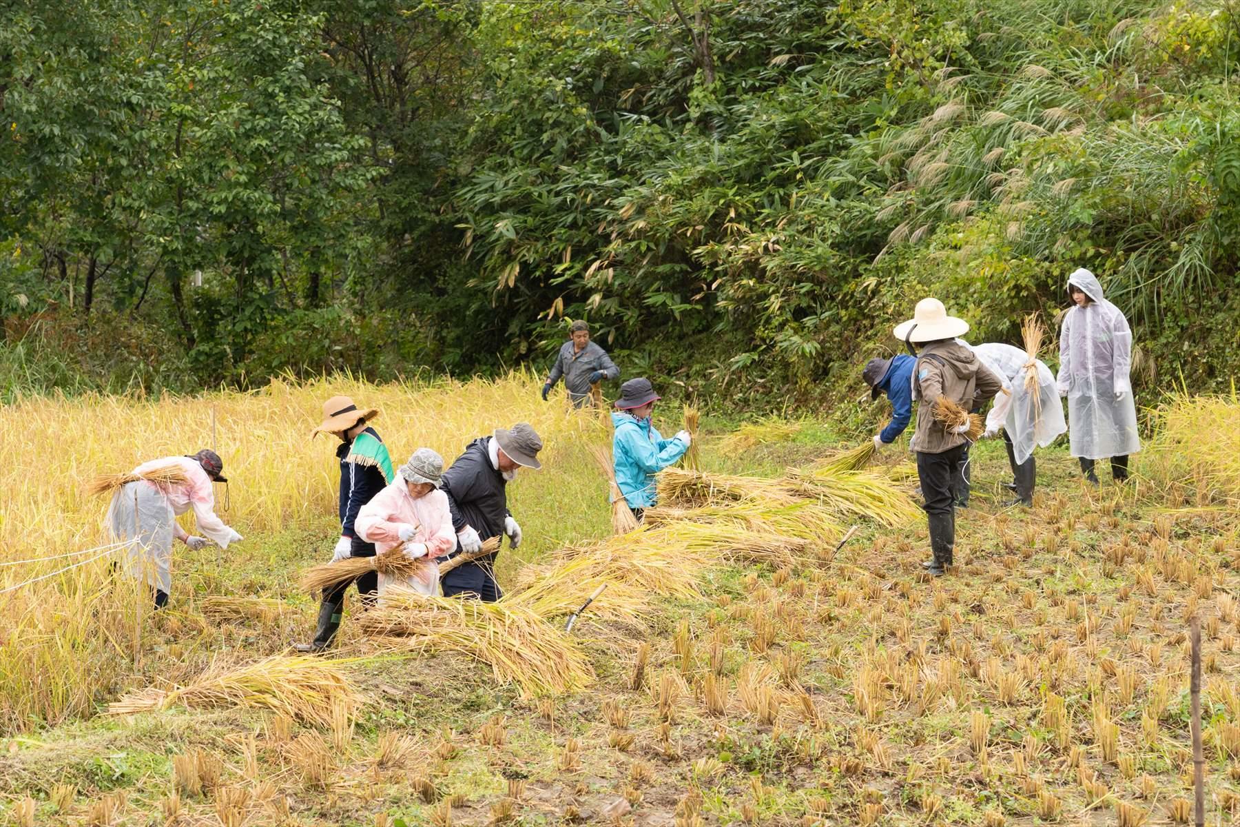 ところが雨模様になっても、いったん稲刈りに没頭したみんなに動揺はない。鎌をふるう手は止まらない。普段なら傘だ、雨宿りだ、となるところを、みんな濡れながらも黙々と作業を続けている。これが田んぼでの米づくりの不思議な魔力だ。ぼくもやめようという気にならない。
