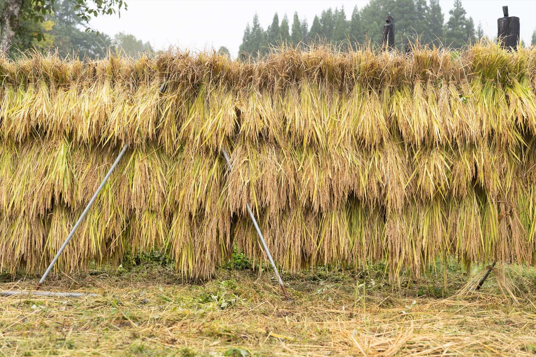 柏崎市から参加した高橋宏和さんは大のお米好きで、機会を見つけては田植えや稲刈りのイベントに参加して腕を磨いている。確かに田んぼでの身のこなしが違う。その彼が「とにかく天日干しの米は旨いんですよねえ。絶品です」と、とろけるような目で、はざにかかった稲穂を見つめている。