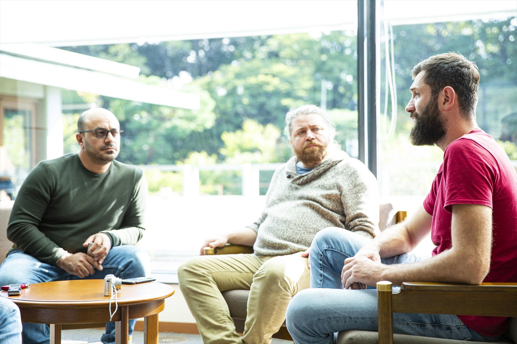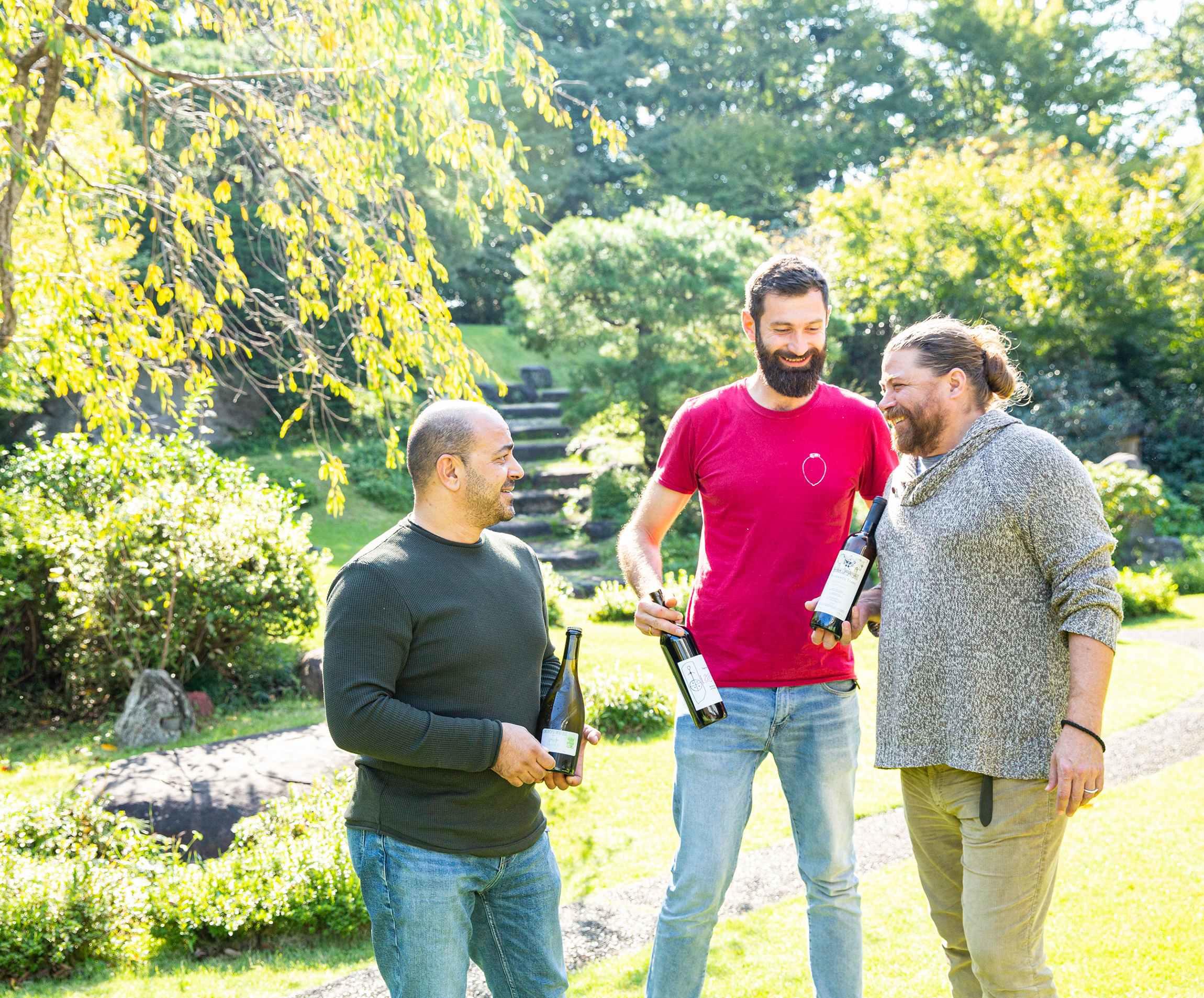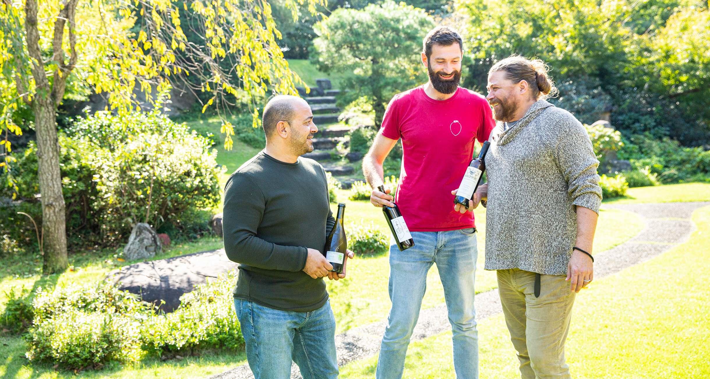 右から、若干29歳の「LAGAZI(ラガジ)」のショータ・ラガジさん。ジョージアワインを世界に広めた第一人者の「PHEASANT’S TEARS(フェザンツ・ティアーズ)」のジョン・ワーデマンさん。イギリス物理学博士号も持つ「OKRO’S WINE(オクロズワイン)」のジョン・オクロさん。