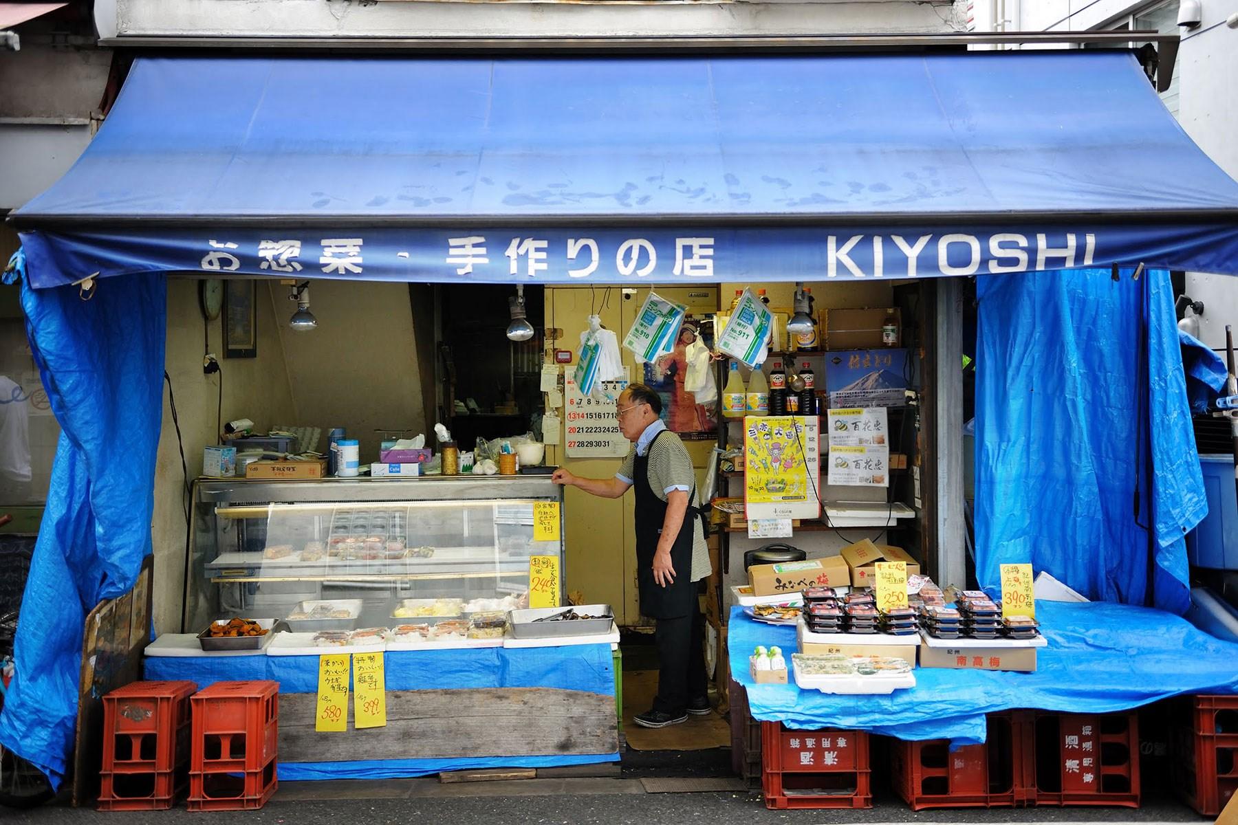田園都市線・三軒茶屋駅前から茶沢通りを進み、太子堂交差点から三宿へと抜ける「太子堂中央街商店街」。大正時代の関東大震災で焼け出された下町・谷中の人々が移り住んだ下の谷商店街から派生し、戦後に発展した昔ながらの商店街だ。ゆるやかに蛇行する小道をしばらく歩くと、鮮やかなブルーシートが視界に飛び込んでくる。この店こそが、近隣住民から極めて素朴にしてめっぽう旨いと評判の鮭弁を販売する惣菜店「KIYOSHI」なのだ。