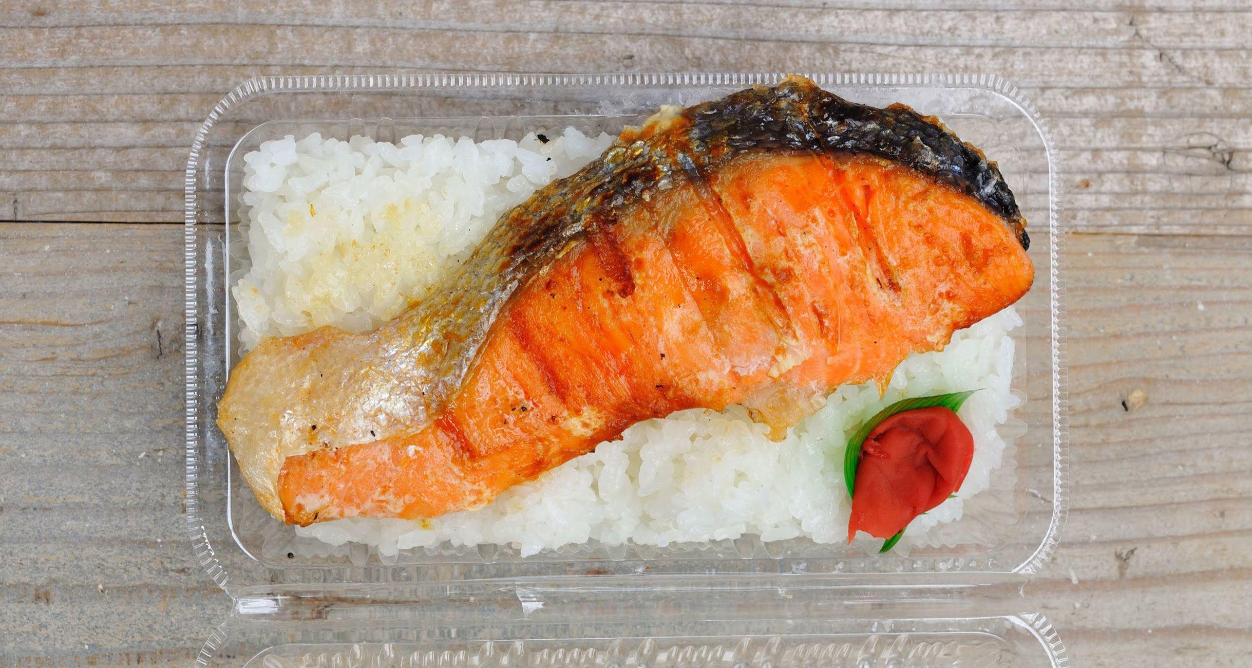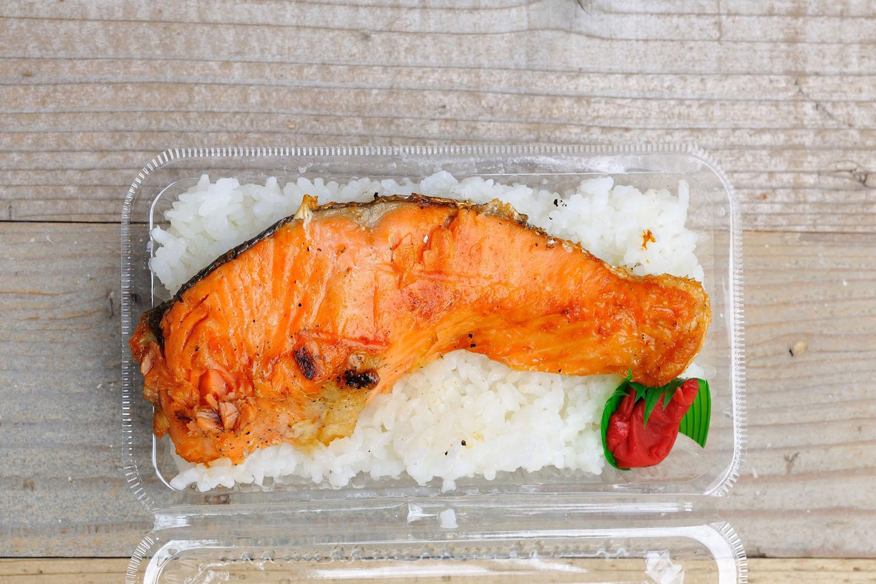 盛り付けは甫さんが再登場。ご飯には“はえぬき”や“つや姫”など、冷めても美味しく艶やかで甘みのある米を選んでいると夫婦で目を輝かせて言う姿にプライドを感じる。炊きたてのほかほかを220グラム計ってパックに詰め、そこに焼きたての鮭をのせる。さらにはこの弁当の味わいに合う紀州梅干を添えて蓋を閉め、輪ゴムでパチン。熱々のご飯には、鮭の脂がしっとり染み込む。また、蓋をすることで鮭の身がご飯の湯気で少し蒸された状態になる。