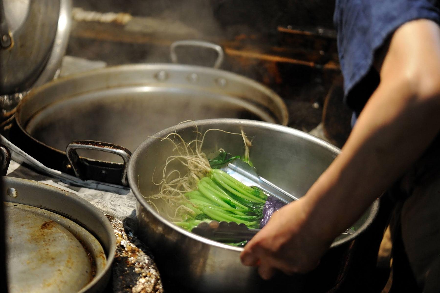 奥にある厨房に思わず目を瞠る。店の歴史を物語る真っ黒に燻し出された壁の前に昔ながらのかまどが二台、その横に長年の魚の脂で艶やかに黒く光るガスこんろが一台。元子さんはこれらをフル回転させて、毎日せっせと惣菜をつくり続けてきたのだ。庶民の家庭の食事を助け続けた説得力が厨房の裸電球に照らされてあぶり出されたようで、なんとも美しい勤労の姿を見た。