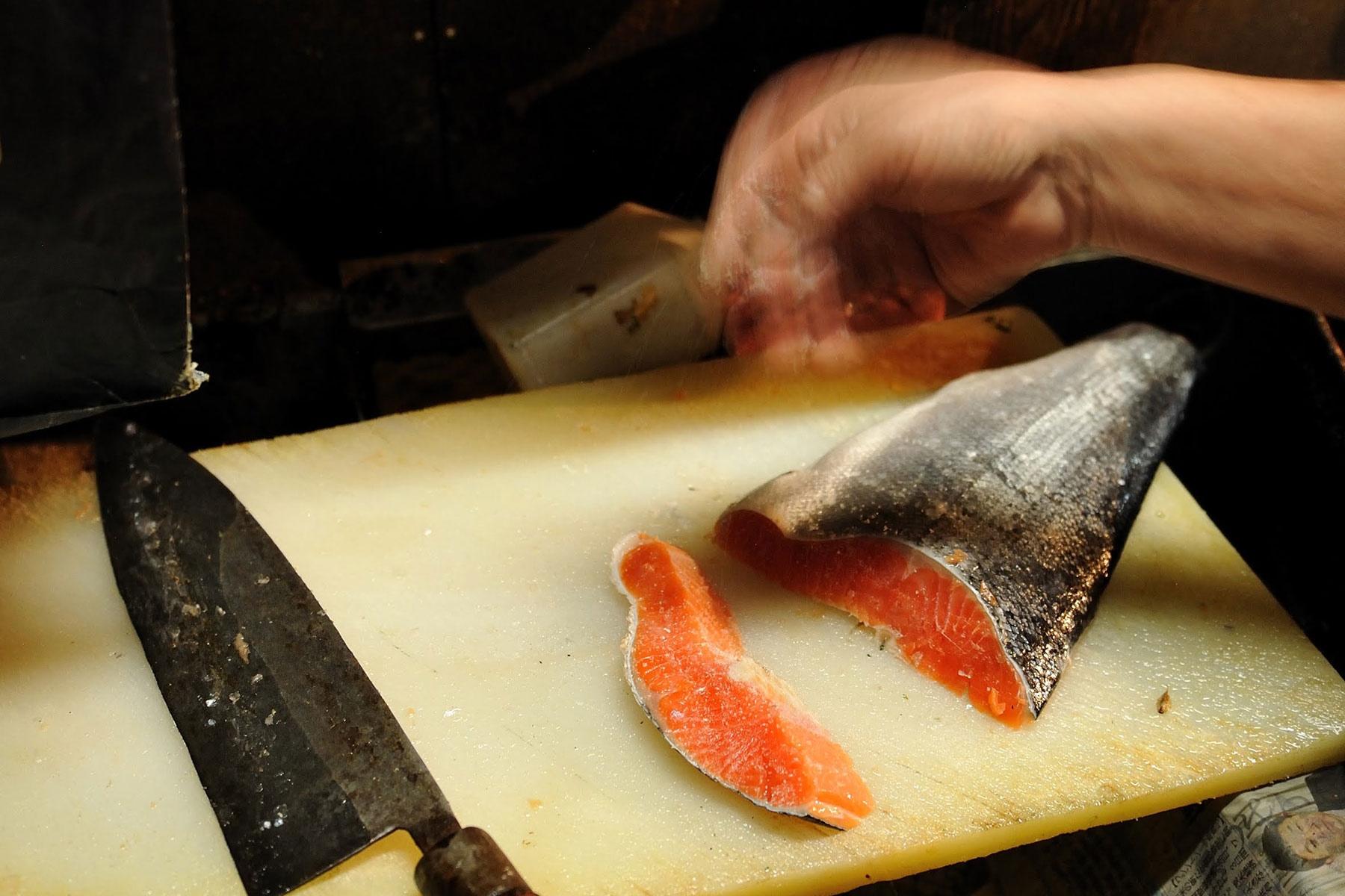 「チリ銀って言ったってねえ、ピンキリで、探せば北方産よりずっと旨いのがあるの。旨い鮭はねえ、尾の身でわかるんだよ」(甫さん)
