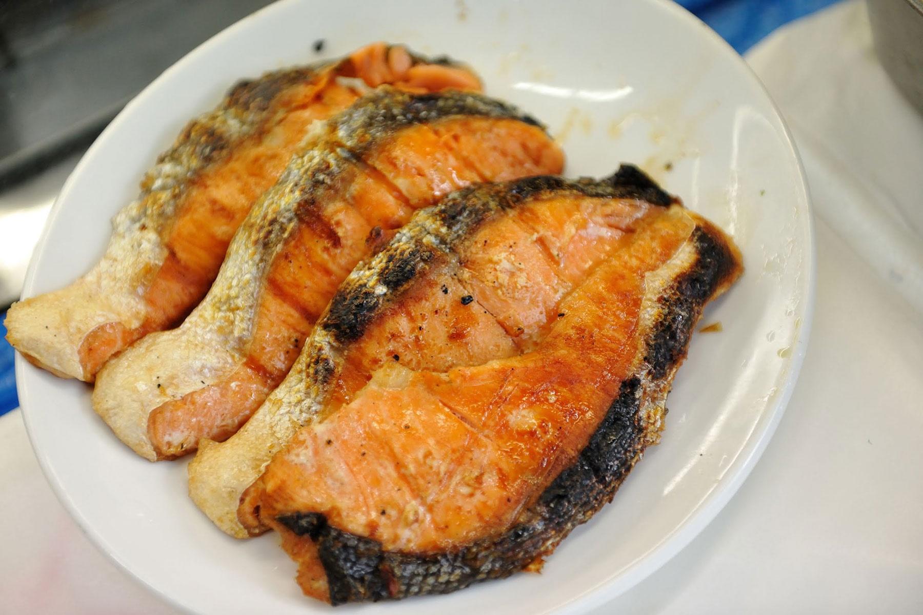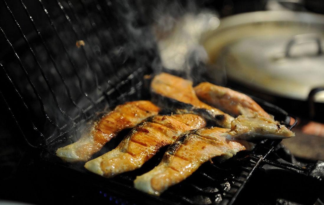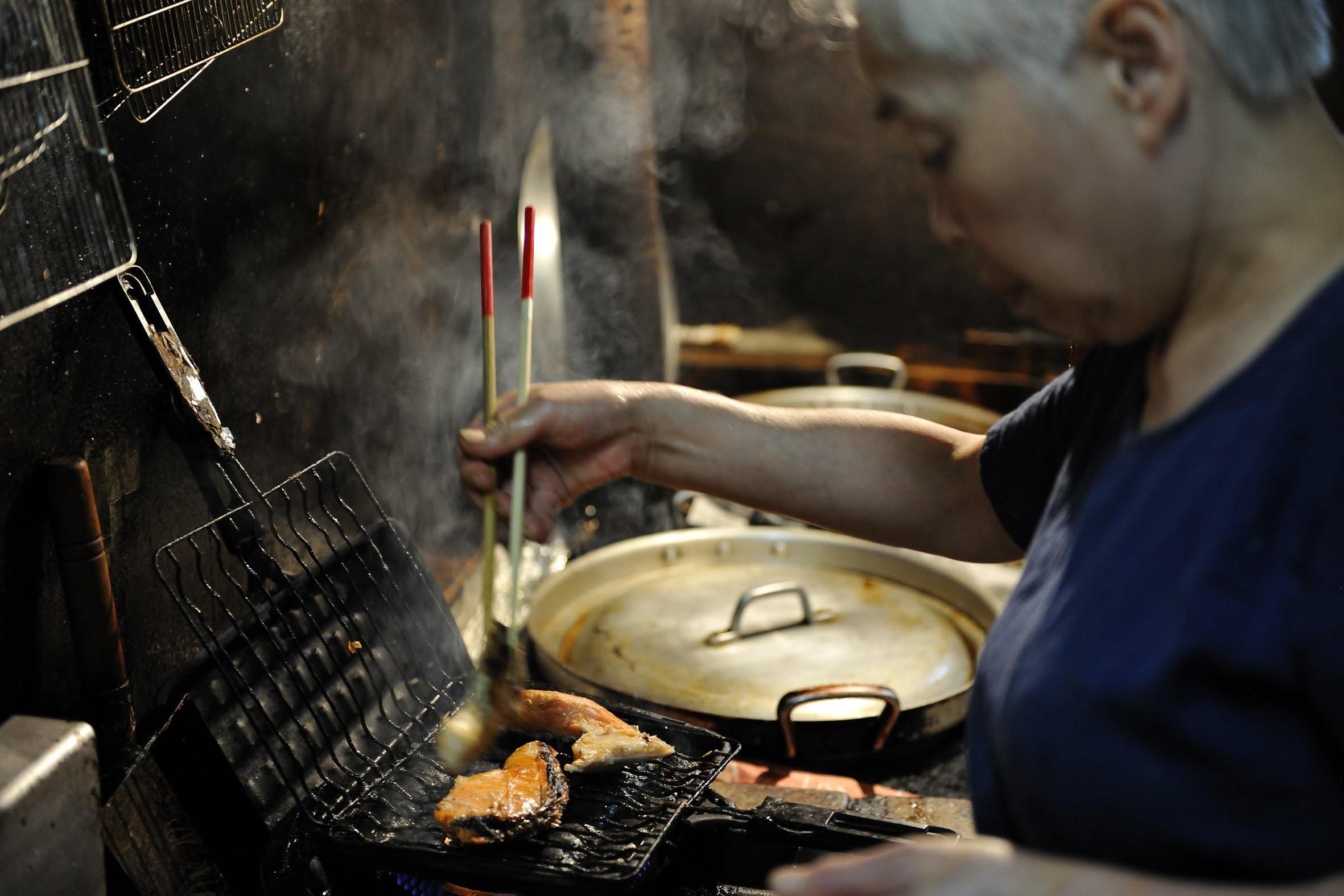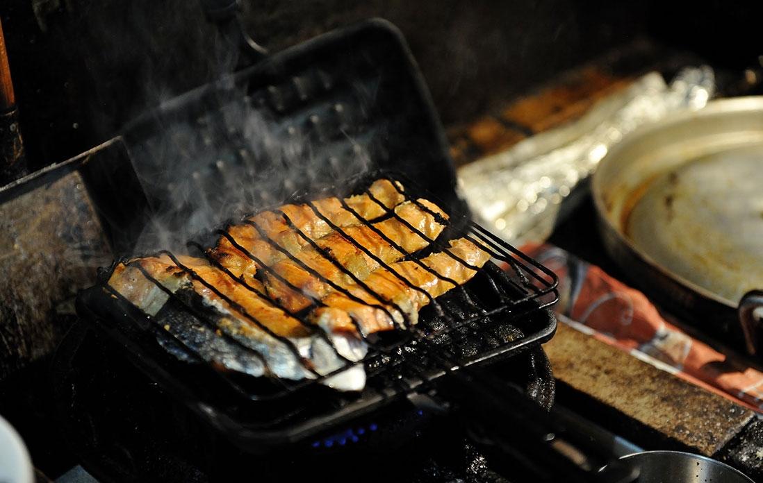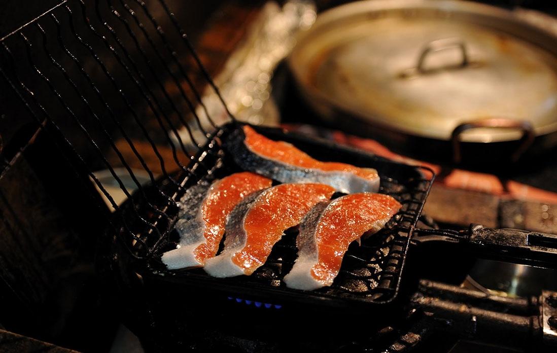 ここからは元子さんの出番。市販の魚焼き網に6枚ほどの切り身を一度にのせて、ガスこんろの火にかける。程なくして鮭の身から脂がしたたり落ちて、そこに火が付き白煙に包まれると、香ばしい匂いが厨房に充満する。元子さんによれば、コツは「美味しそうに焼く」「焼き過ぎない」こと。表、裏と返しながら身がいい焼き色になった頃には、盛大な炎と煙に当たった鮭は、ほのかな薫香を纏って皮目もパリっと焼き上がる。