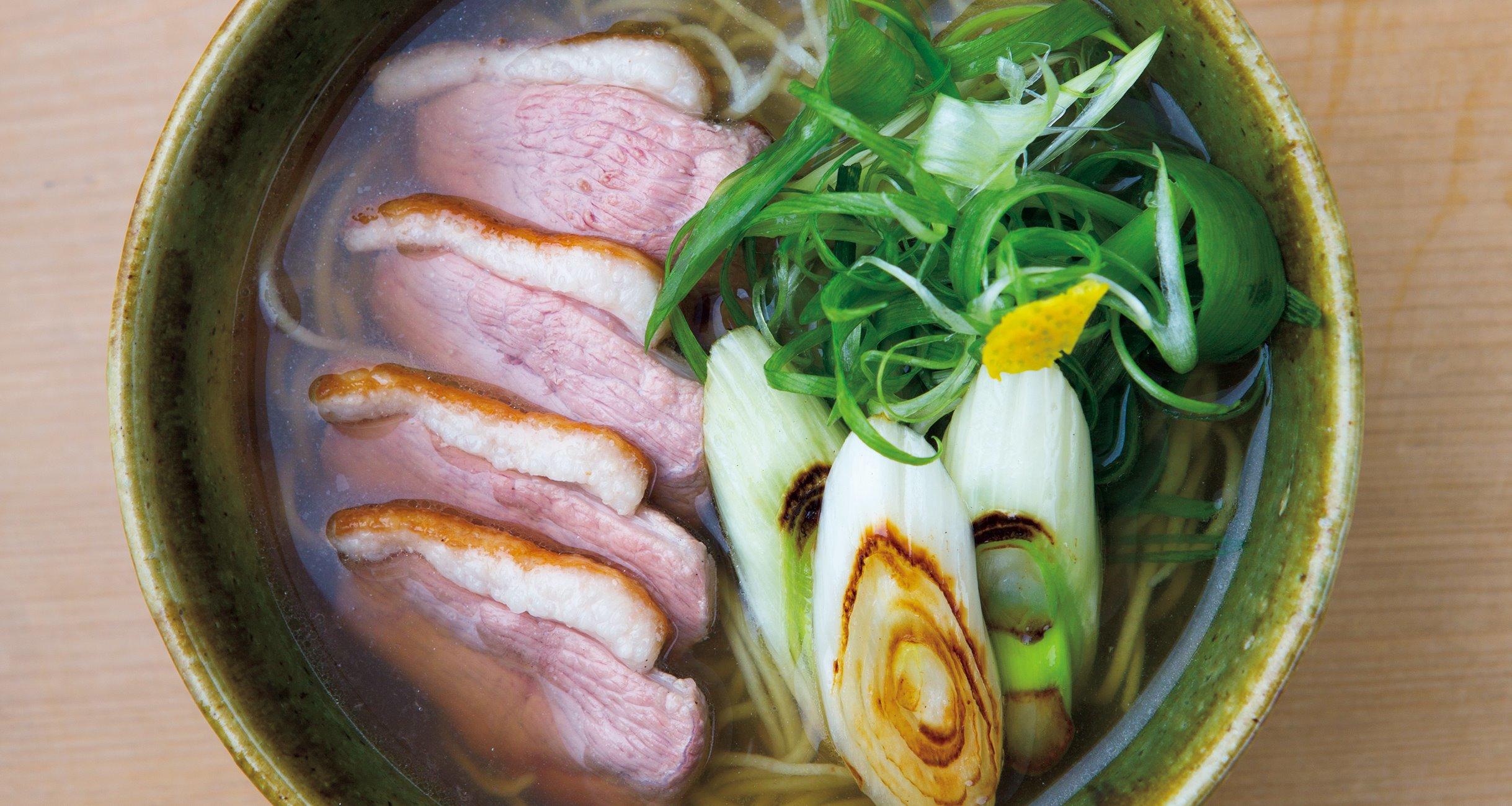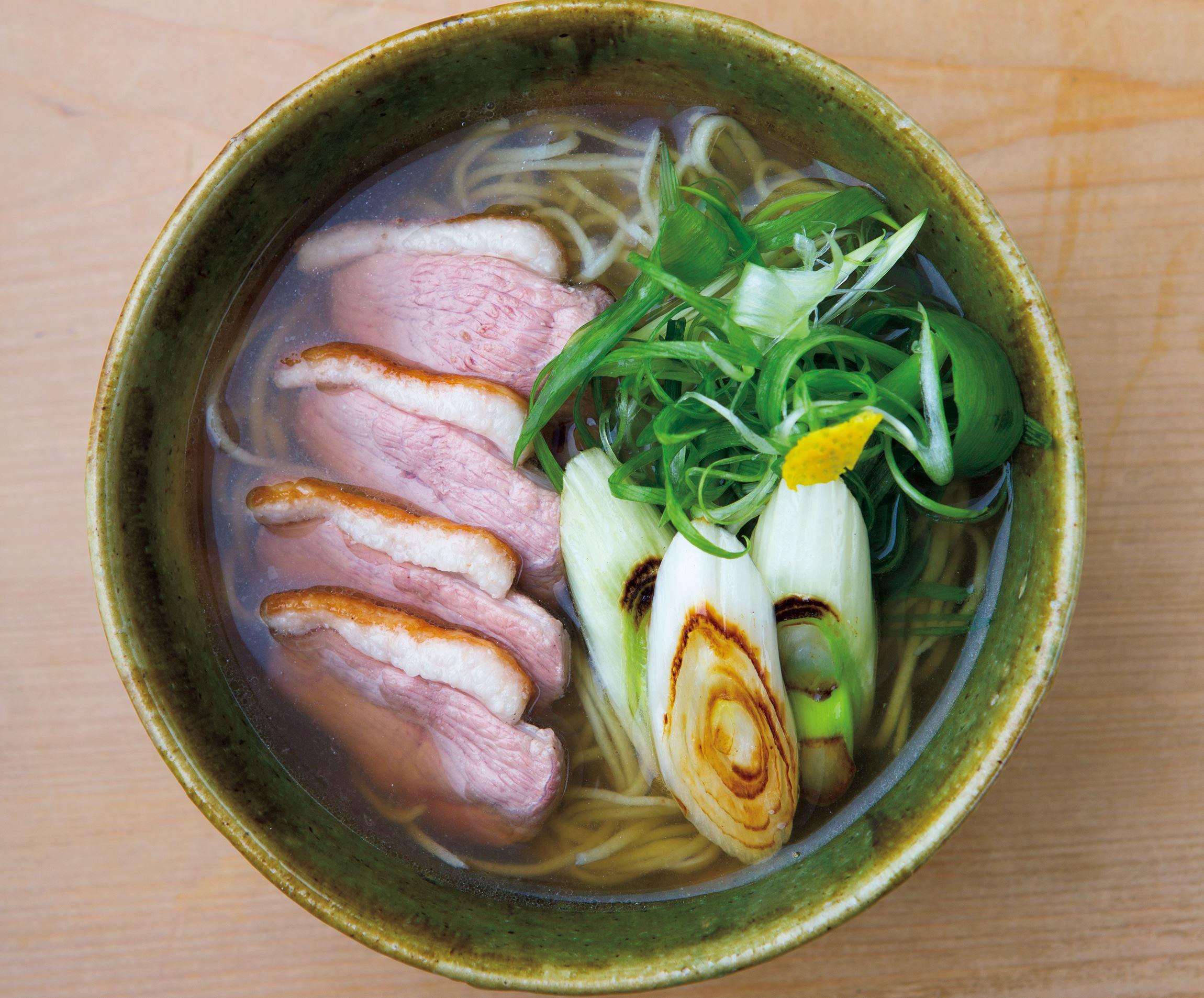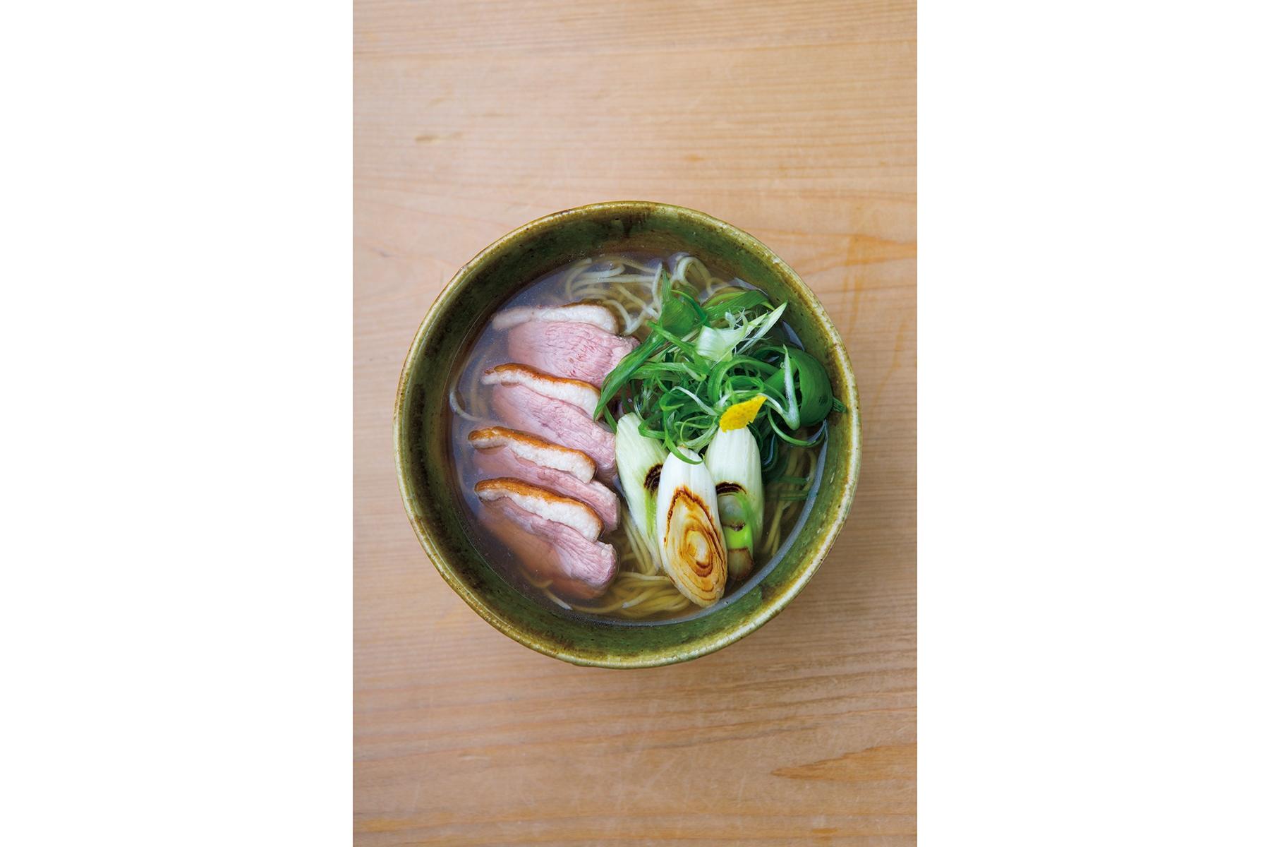 この鴨南蛮はどこまでも美しい。見事なロゼ色の鴨の抱き身に、鴨脂でこんがりと炒めた深谷ねぎ。そこに緑の九条ねぎが覆い、黄蘗(きはだ)色の柚子皮が香る。