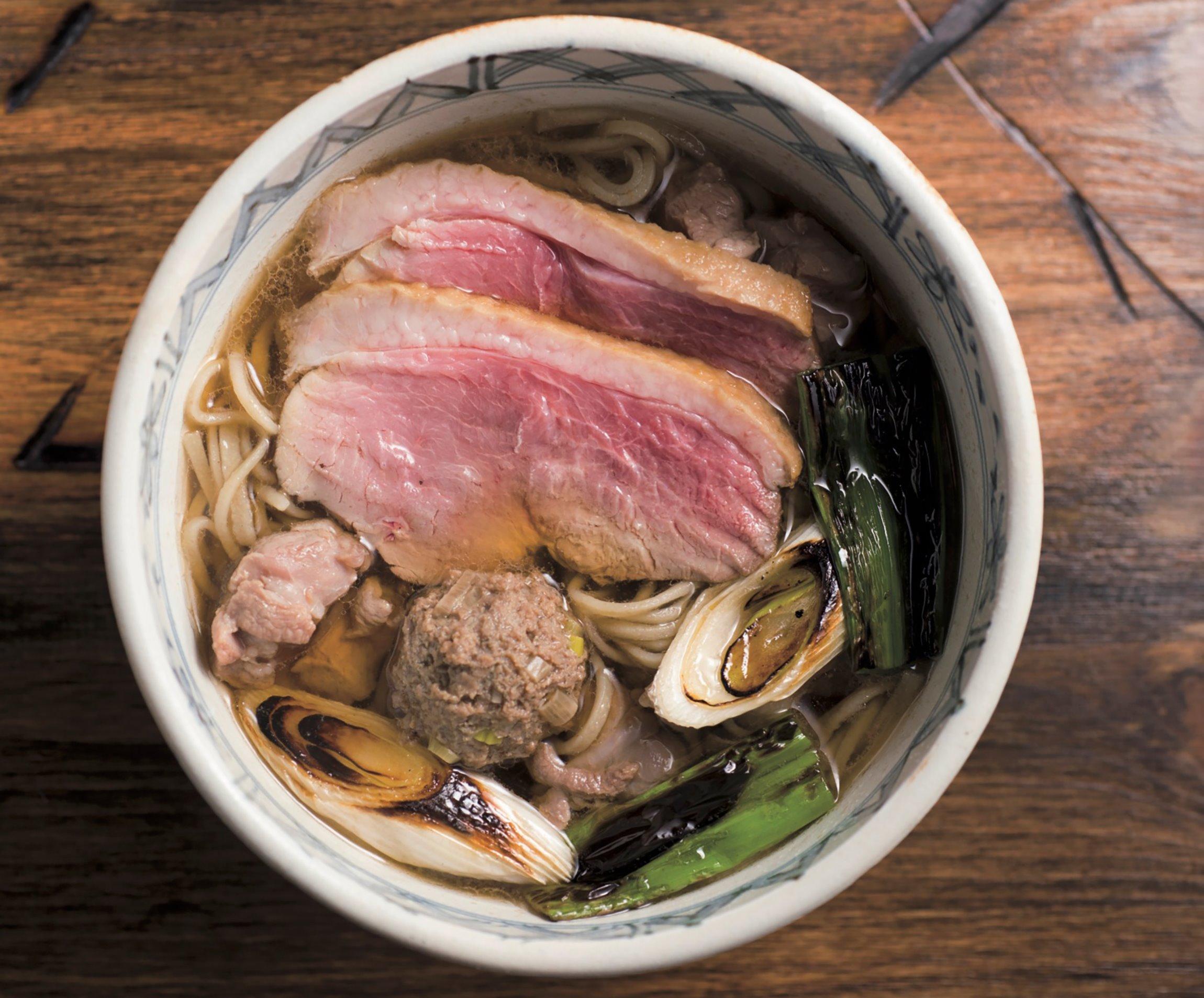 「ながえ、」の鴨南蛮そばは、低温で蒸し煮にした薄切りの鴨ロース肉がしっとりと柔らかく、肉の旨味甘味が口にあふれる。さらに弾力のあるももの小肉に加えて、ほんのりと山椒が香る鴨つくね。そして本節と宗太節を使ったつゆはほんのりと昆布が香る。鴨を引き立てつつ飲み干せる、よく考えられた一杯である。