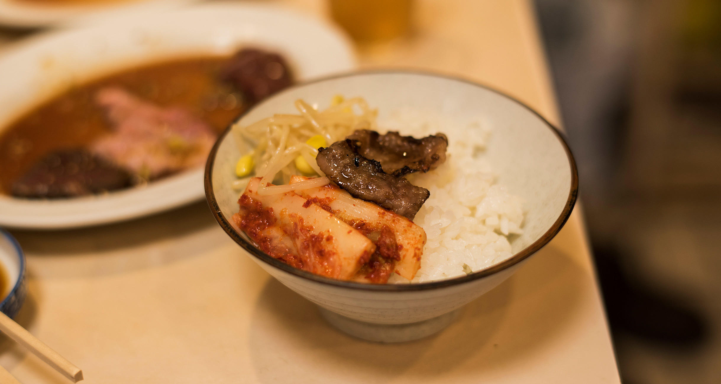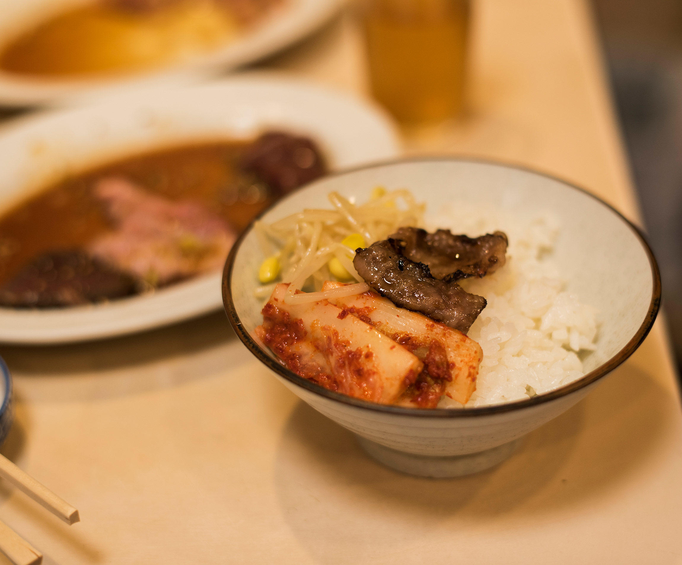 キムチやナムルの小皿がサービスで付くのも嬉しい。