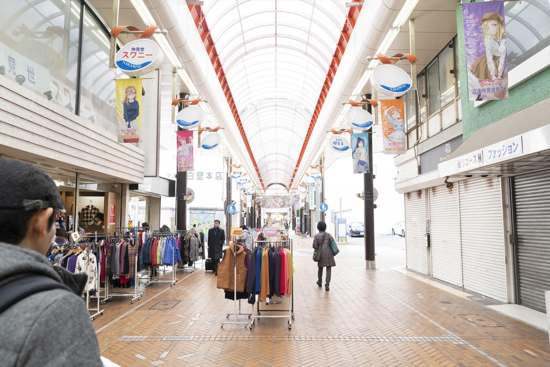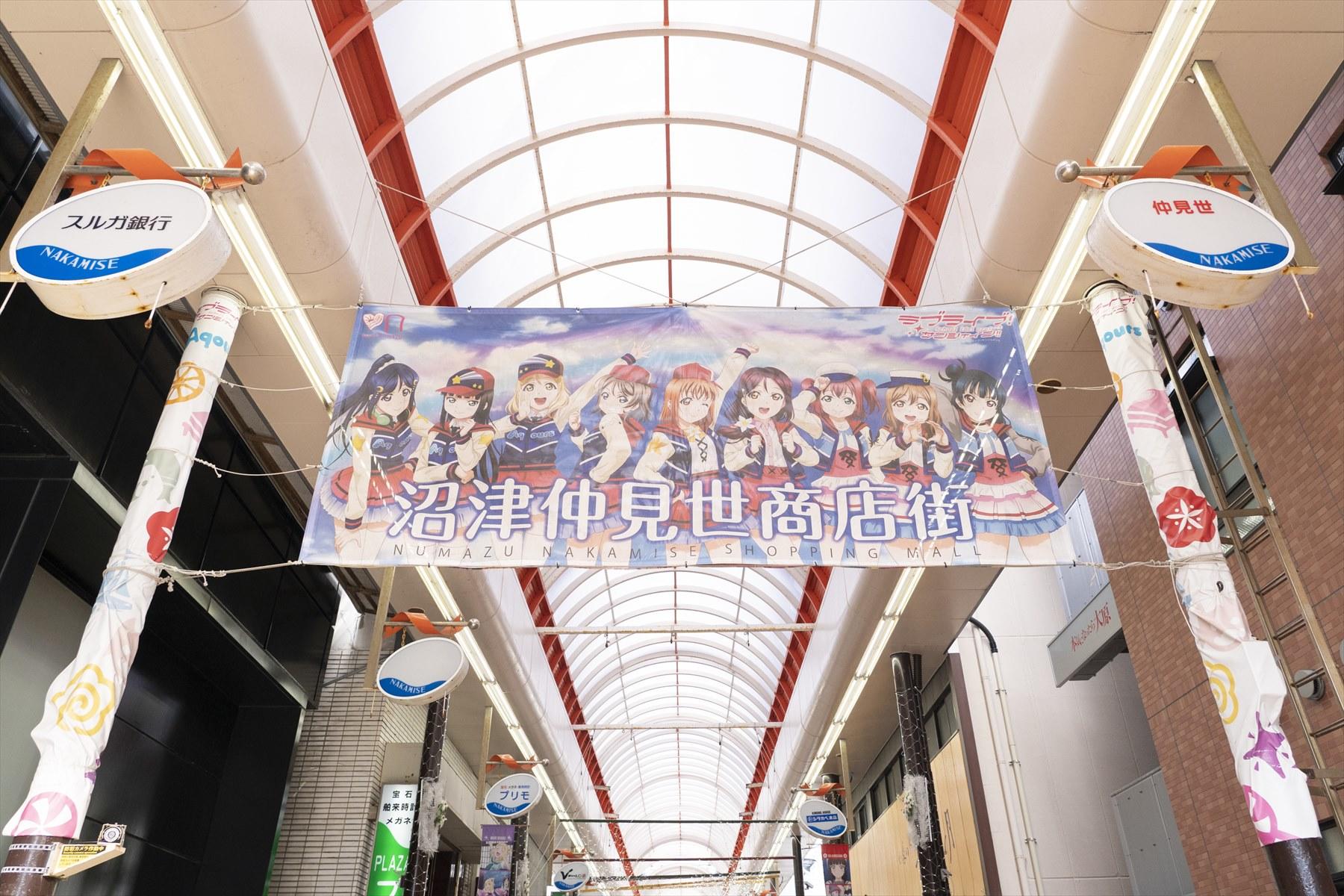沼津のアーケードに入ると、アニメと思しき美少女キャラの横断幕がかかっていた。揃いのコスチュームを着た女子が9人並んでいる。この町が舞台のアニメだろうか。「ラブライブ!」というタイトルが見える。ライブというぐらいだから、アイドルの物語なのかな。