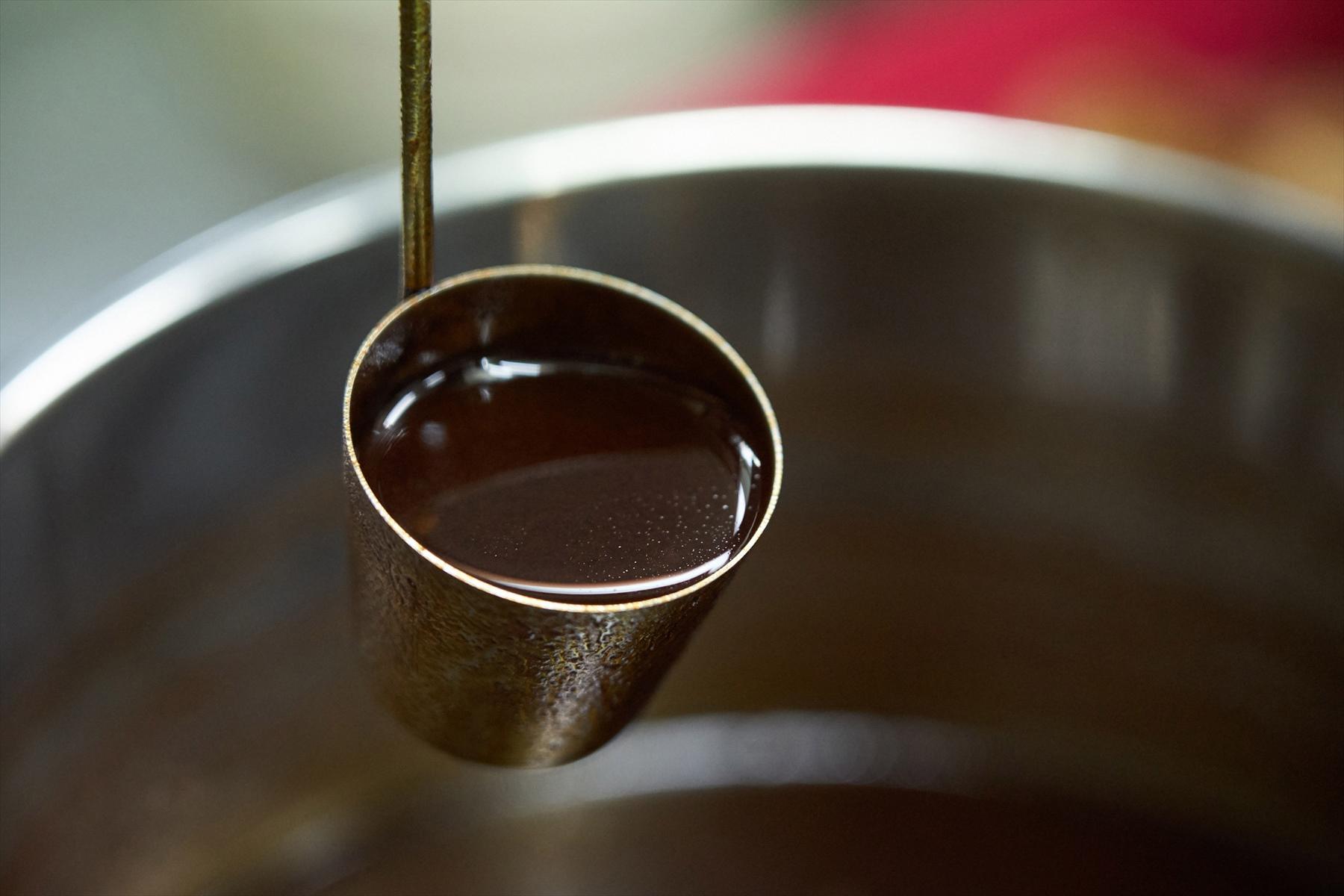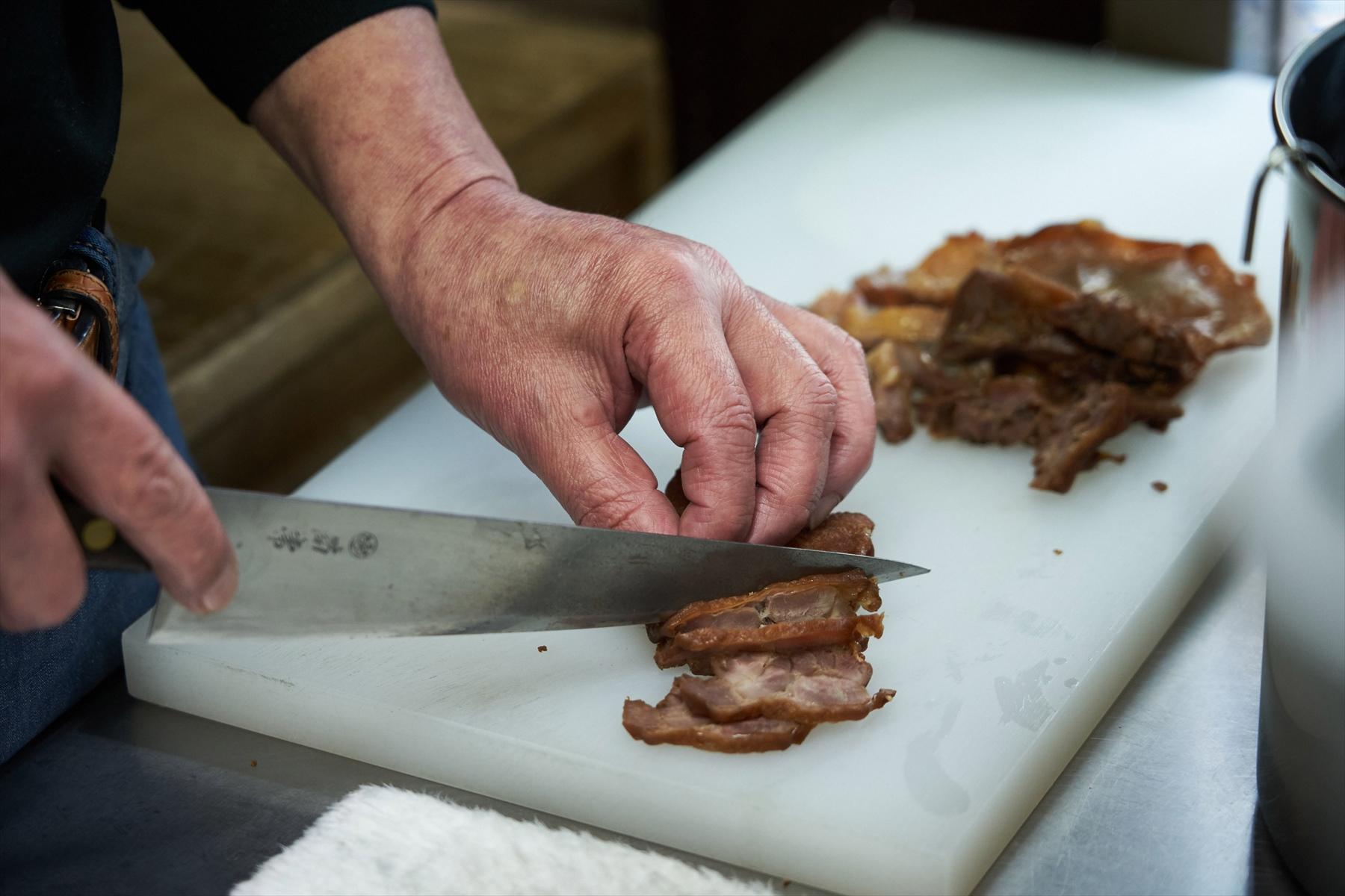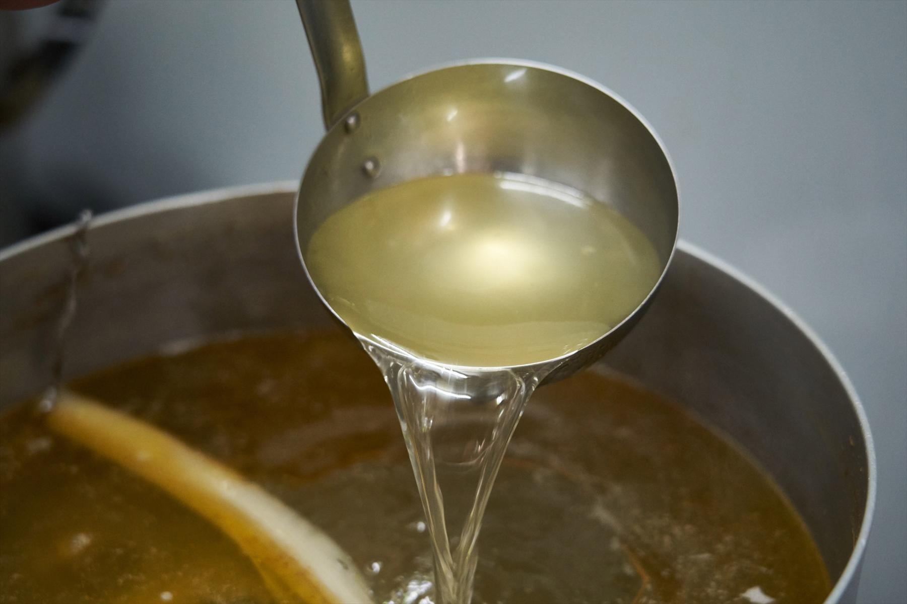 スープは、若鳥よりも旨味の濃い親鳥のガラのみでとる。煮鶏は親鳥のもも肉を醤油だけで煮る。煮鶏を仕込んだあとの煮汁を煮つめてラーメンダレにする。それだけだ。