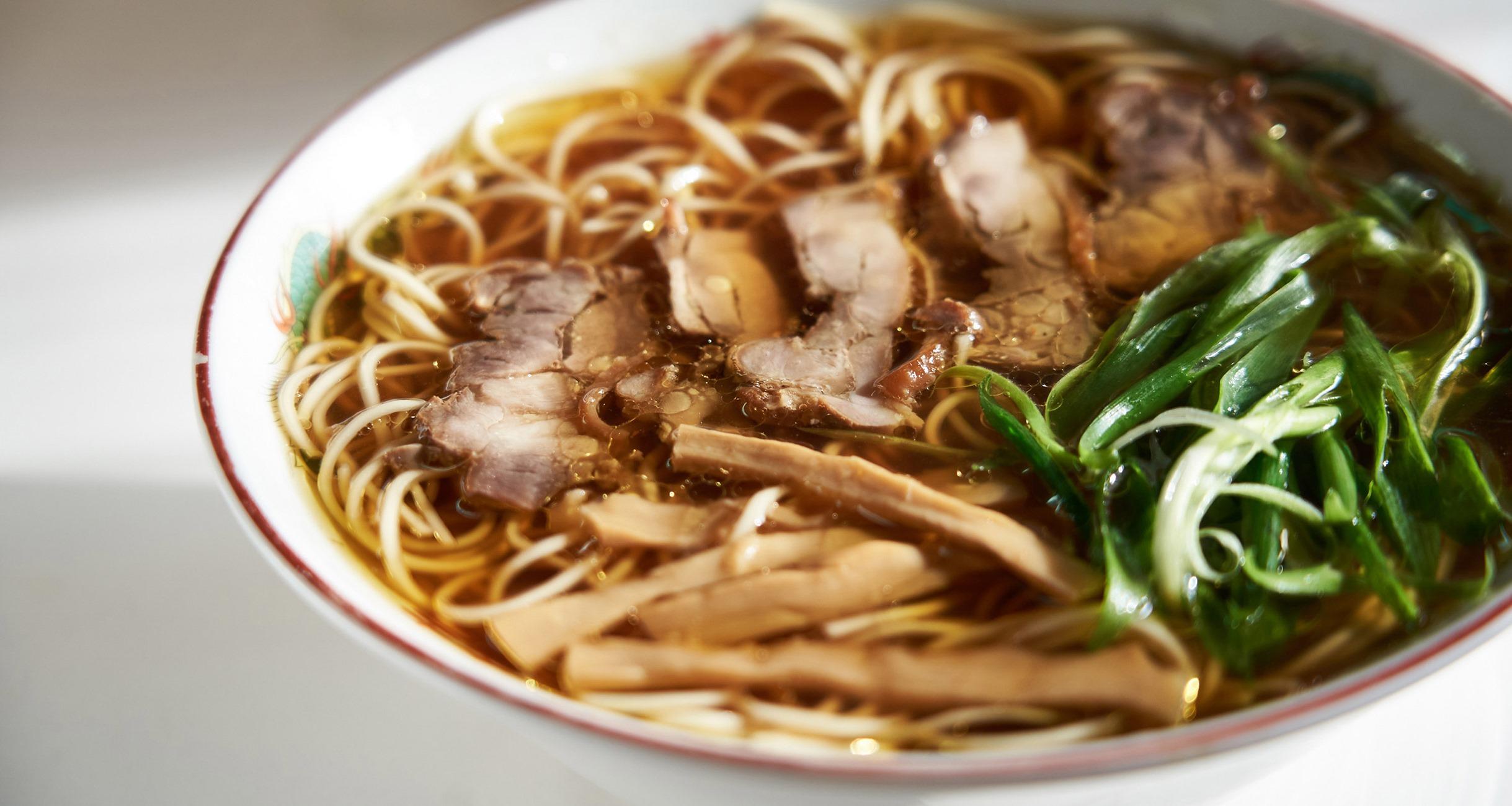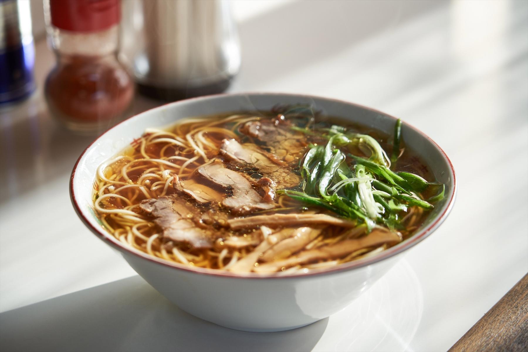 メニューは、“中華そば”のみ。「『笠岡ラーメン』といえば中華そばのことじゃけえ」。厨房の奥から店主の出原秀明さんがそう教えてくれた。その正体は、きらきら光る醤油色のスープに、鶏もも肉を煮た“煮鶏”と呼ばれる鶏チャーシュー、青ねぎとメンマが浮かび、まっすぐな中細麺がたゆたう美しいラーメンだった。