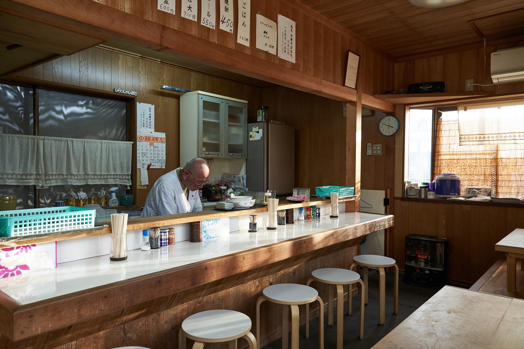 店名は「鶴亀」。縁起のいい名前につられて暖簾をくぐると、「いらっしゃい」と店主の井上重正さんが迎えてくれた。御年70歳。この道ウン十年という風格漂う井上さんだが、聞けば店をオープンしたのは2018年とのこと。若い頃は東京の日本料理店で板前として働き、その後、故郷の笠岡へ戻り大工として腕をならした井上さんが、「残りの人生を好きなラーメンに捧げたい」という想いで始めたのだという。