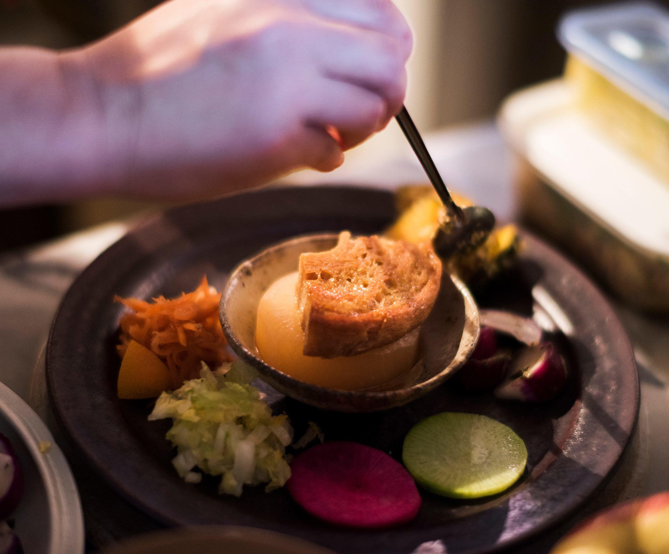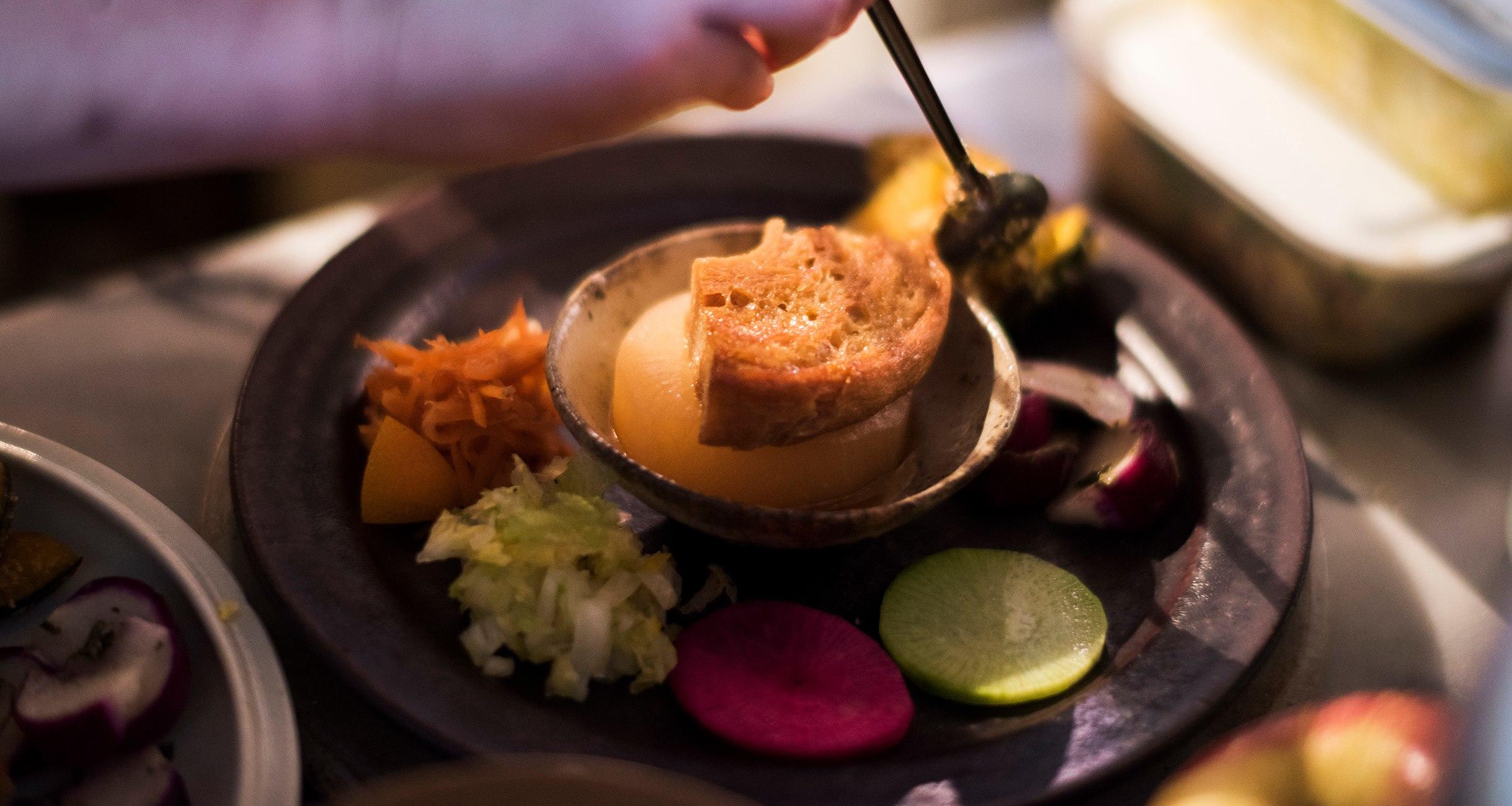 調理された野菜の色に派手さは無いけど、東北らしいしっとりとした色気と渋さが陰影になって暗い皿の色に映える。