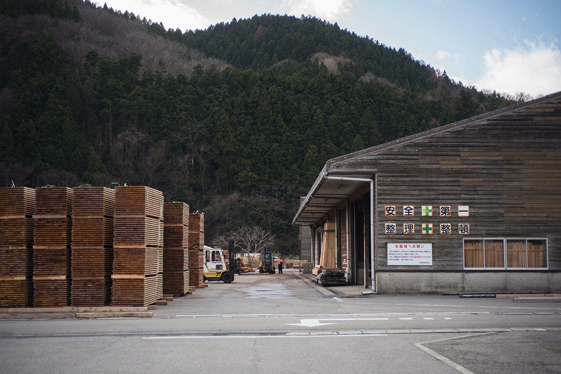 広大な敷地に製材された杉の木がうず高く積まれている。