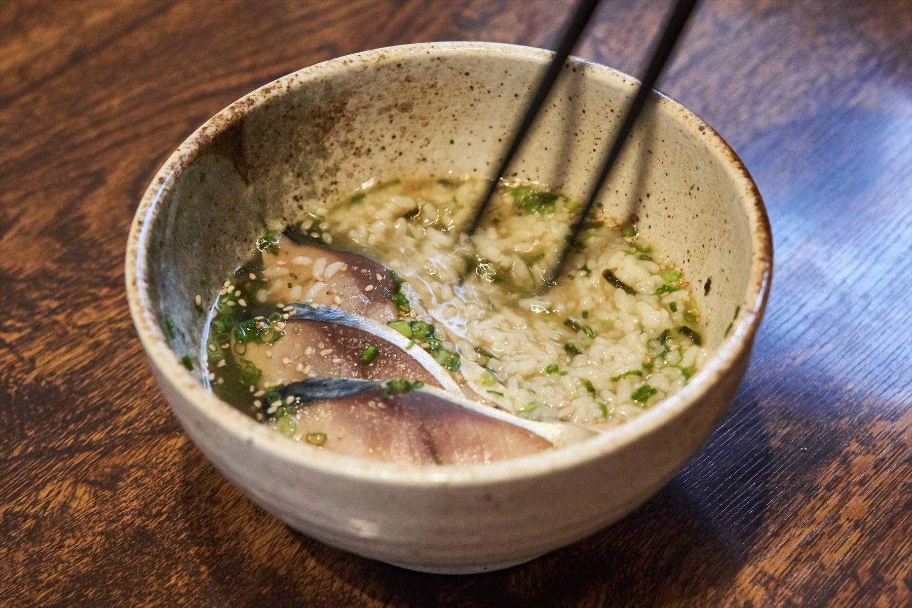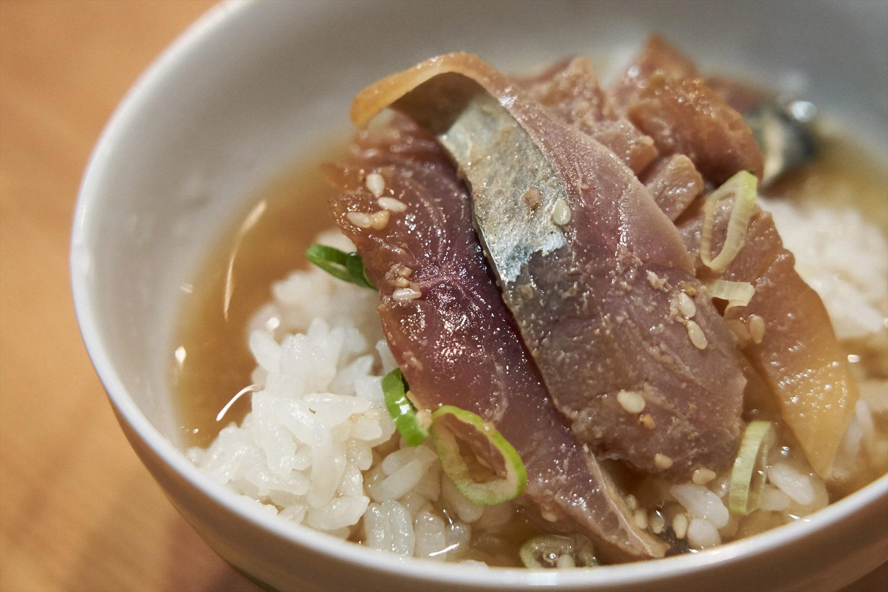まずはご飯のおかずとして、そのままパクリ。3種の胡麻が功をなしたコクのあるタレと脂ののったサバの相性がダイレクトに実感できる。少し食べすすめたら、茶碗にあとのせ方式で丼風に。温かなご飯で胡麻の香りがいっそう引き立つ。そして最後はお茶漬けにしてさらさらと口に運べば、爽快。1度で3度おいしく楽しめるのがいい。