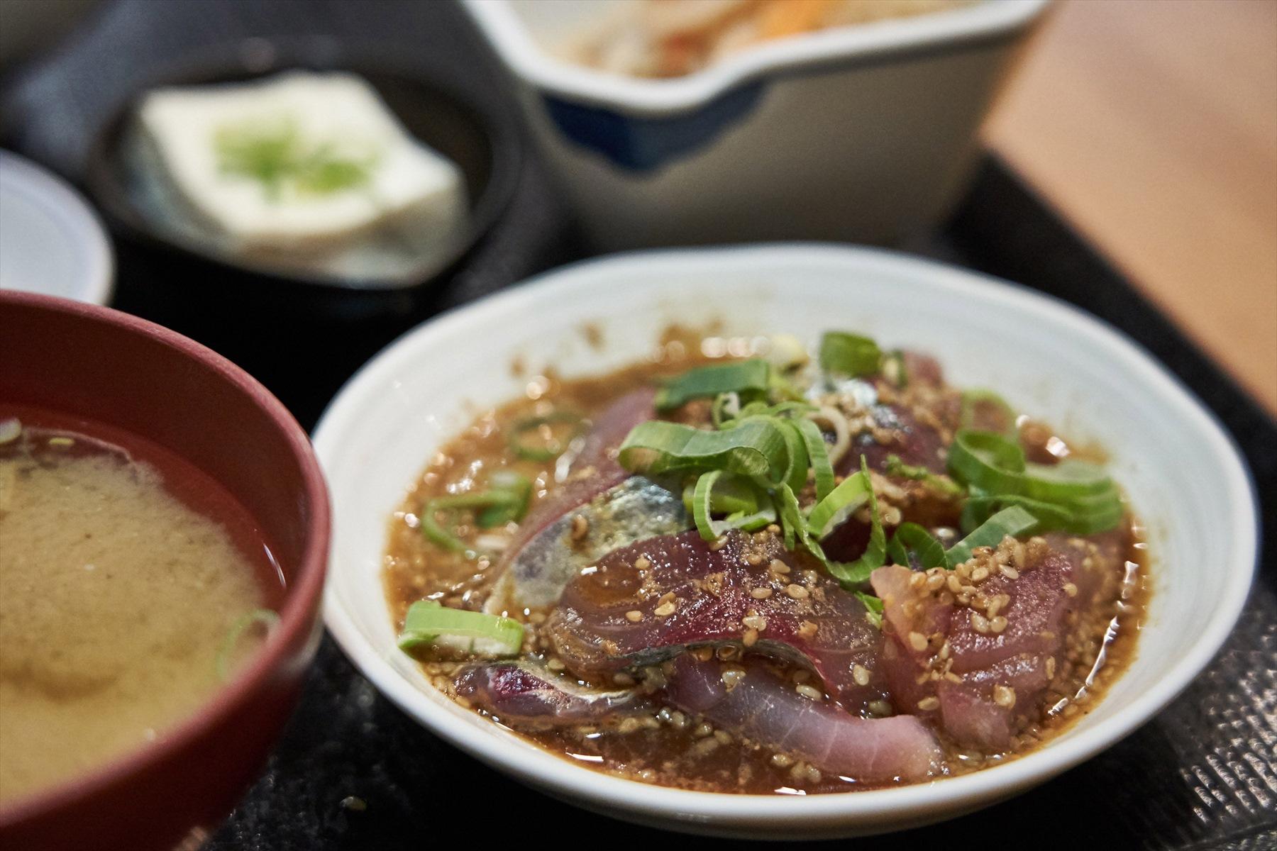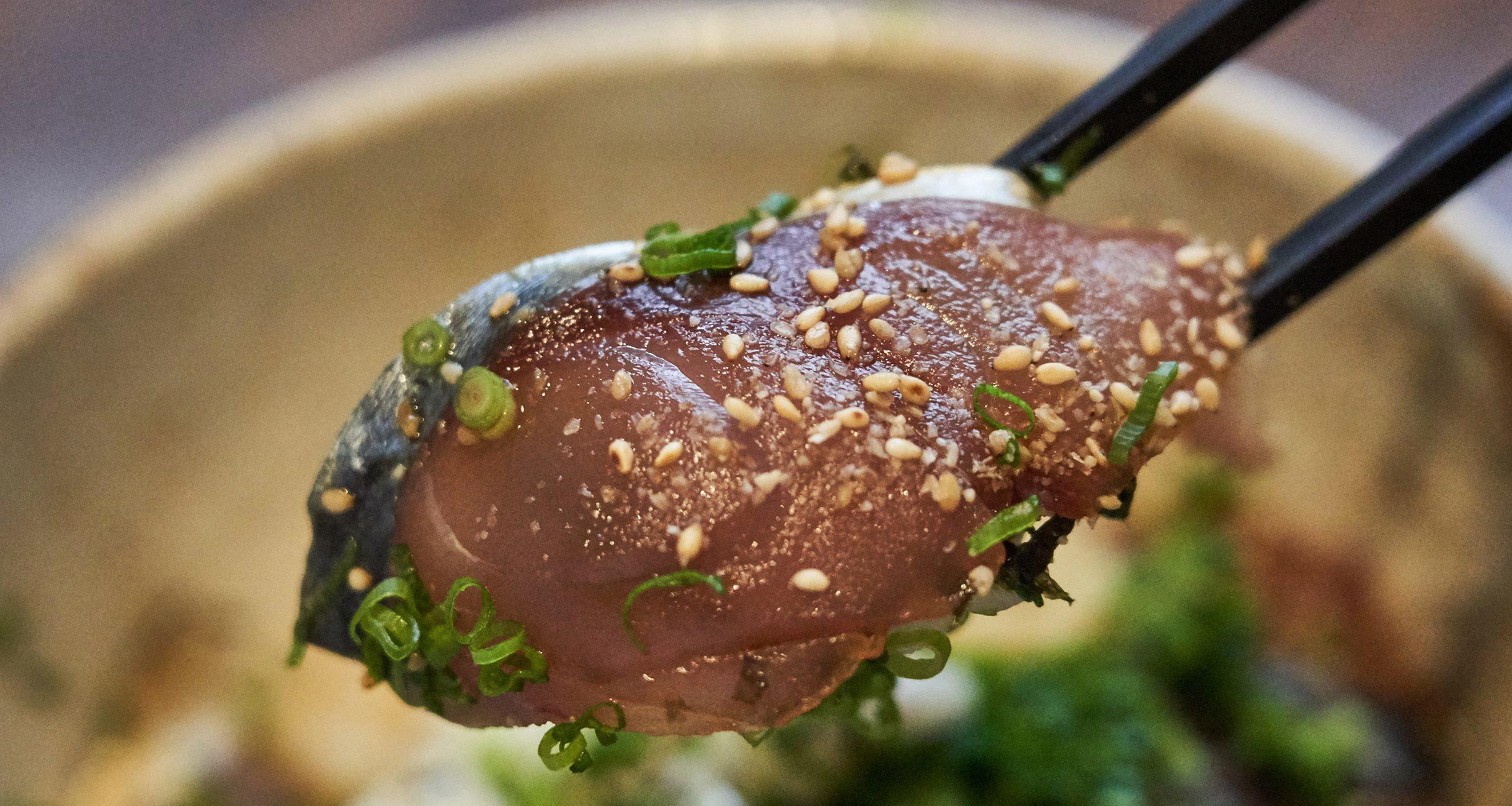 ここでランタイムに味わえるのがくだんの「ごまさば丼」。目の前に置かれたそれは、エッジの立ったサバの切り身に胡麻と青ねぎをのせた、爽やかな見た目の丼だった。確かに魚は生のままである。