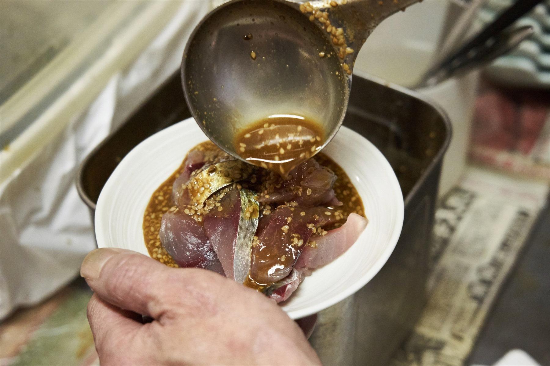 「店やつくる人によってタレの味が違うけんね。僕のは独特ですよ。醤油ベースはよそと変わりませんが、『ごまさば』っていうくらいだから胡麻使いがミソ」