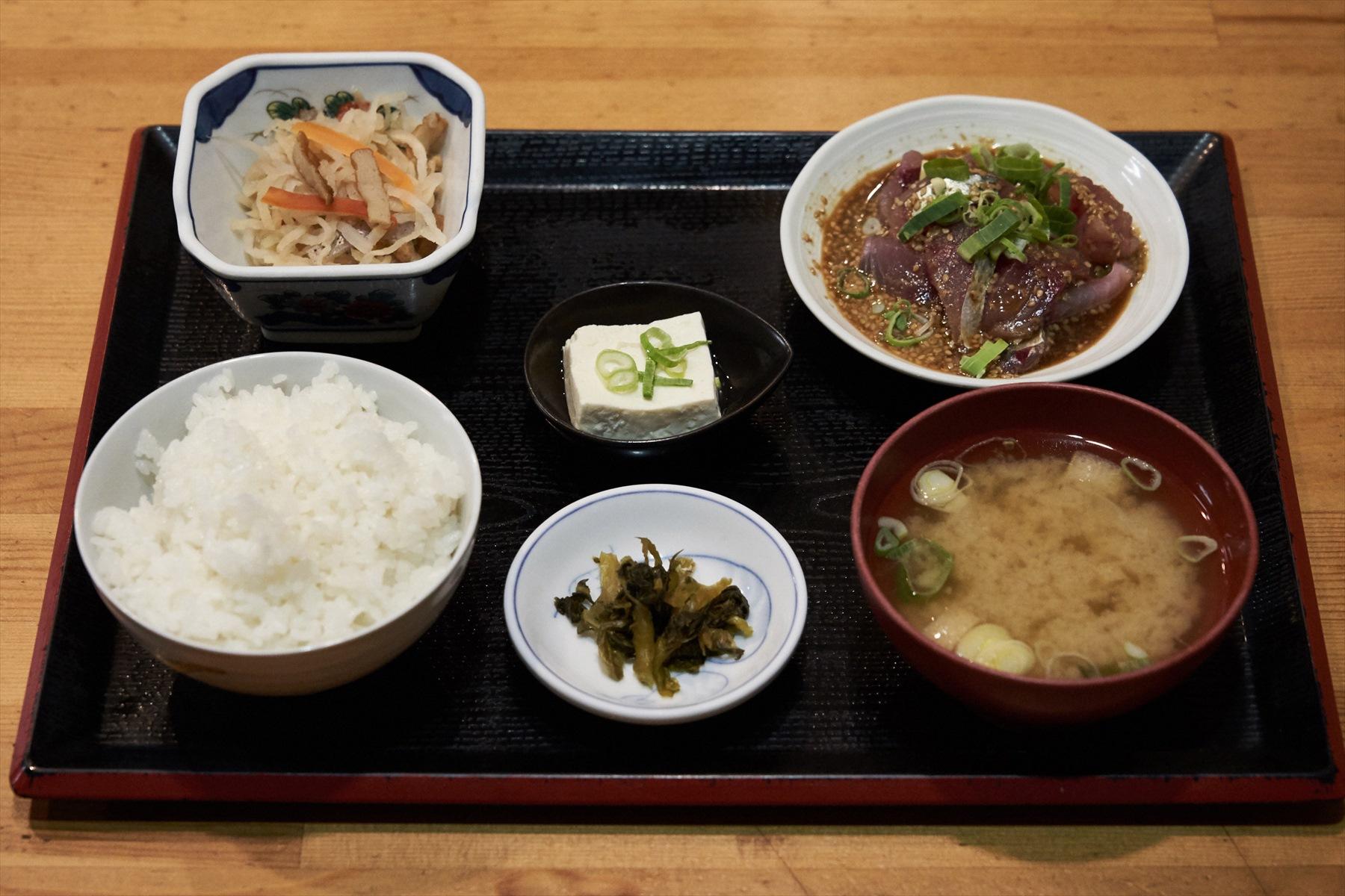 「おきよ食堂」の『ごまさば』は定食スタイルだ。「丼はないのか……」と一瞬気落ちしたのもつかの間。村松さんによると、通は3段階方式で楽しむというから興味津々。言われるがままに実践してみた。