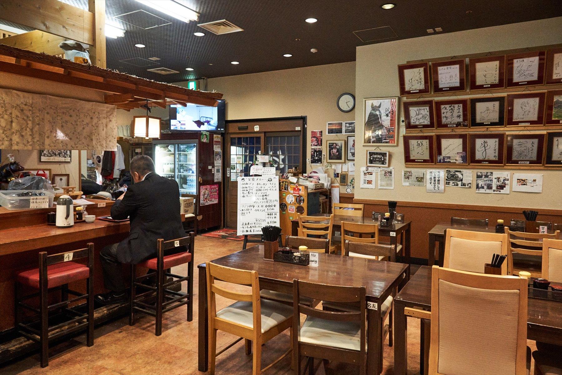 次なる「ごまさば」を追って訪れたのは福岡市中央卸売市場。九州や西日本から魚が集まる、全国でも有数の鮮魚市場だ。狙ったのは、併設の市場会館に入っている「おきよ食堂」。テーブル席が連なるいかにも食堂といったざっくばらんな雰囲気が、いい味を醸し出している。