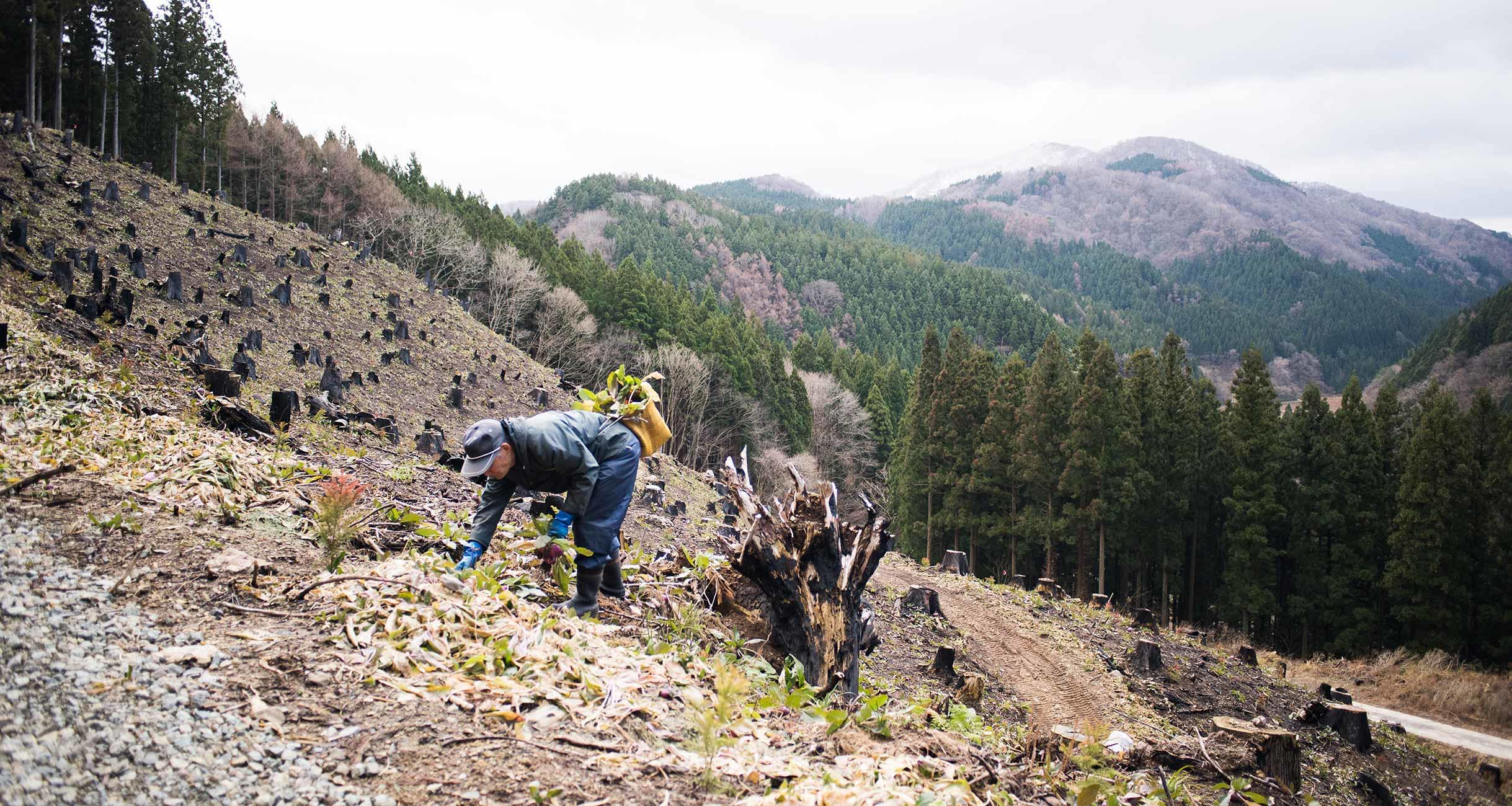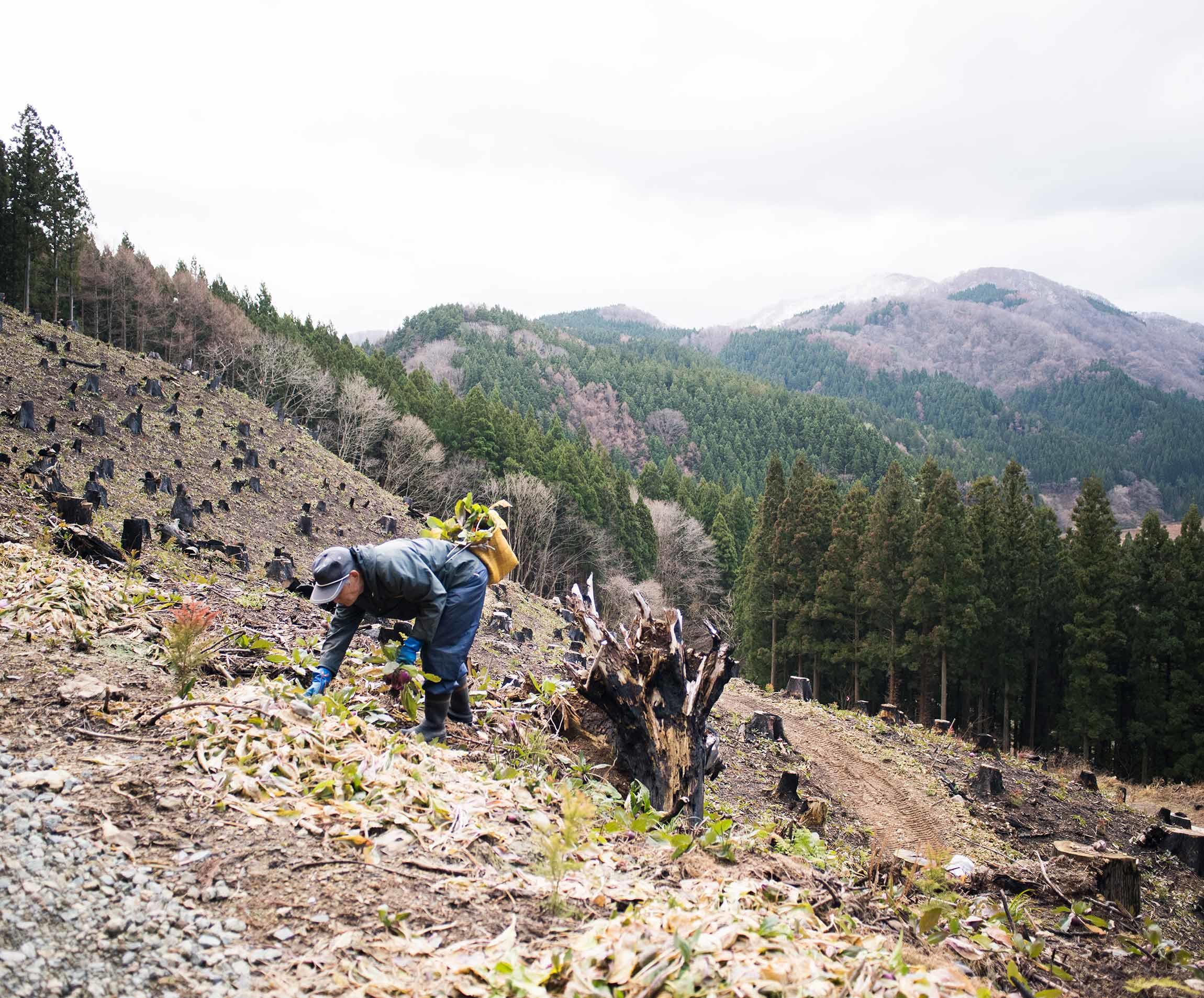 収穫も一段落して、せっかくなので記念撮影でもしましょうか。なんてタイミングで「斜面をよく見てください」と忠鉢さんのから一言。足元には、若々しい緑の息吹。次世代に繋げていく、杉の苗木が植えられていたのだ。