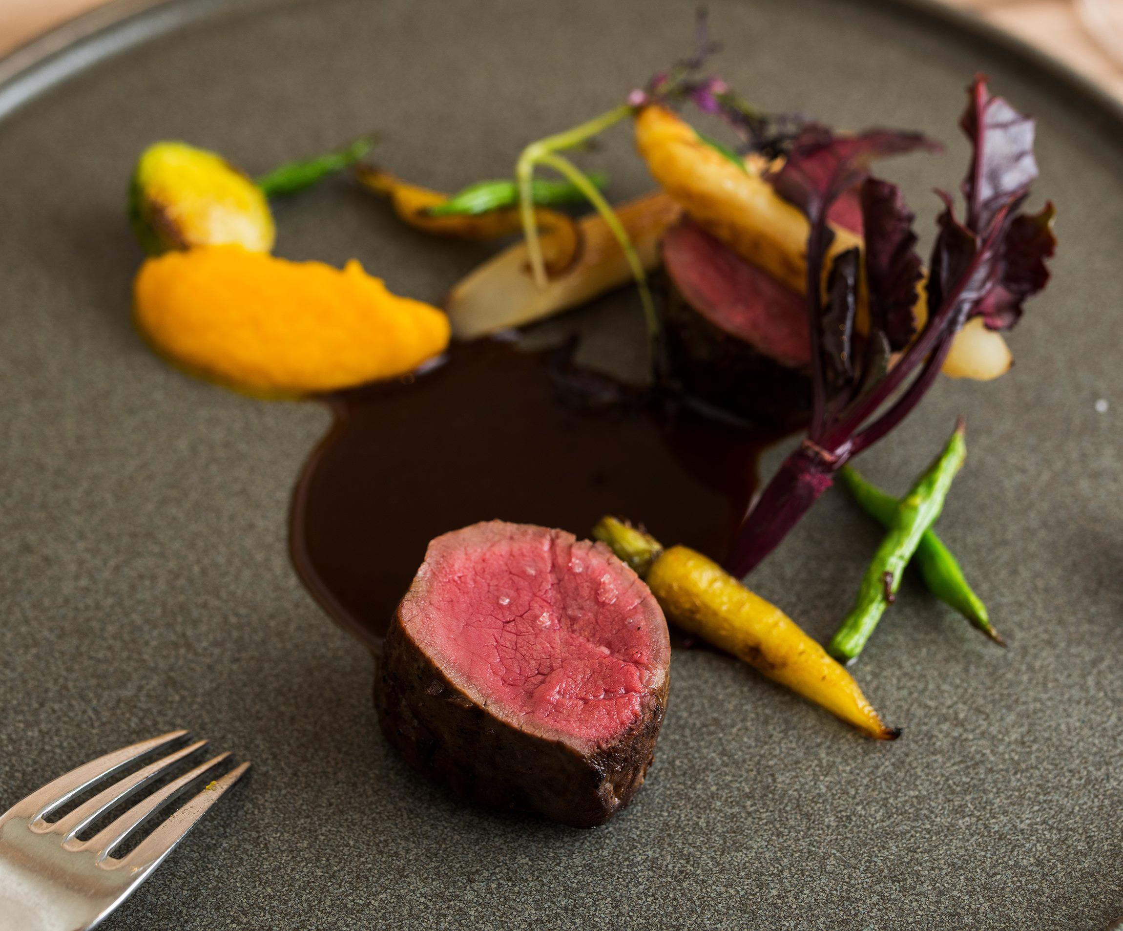 次に、「ルディック」の魅力が凝縮しているのが、メインの「北海道エゾ鹿のロースト ポワブラードソース」だ。まずエゾ鹿の肉が美しいロゼに仕上がり、弾力があるのに驚くほど柔らかくジューシー。エゾ鹿は、2~3歳のメスを好んで使うという。