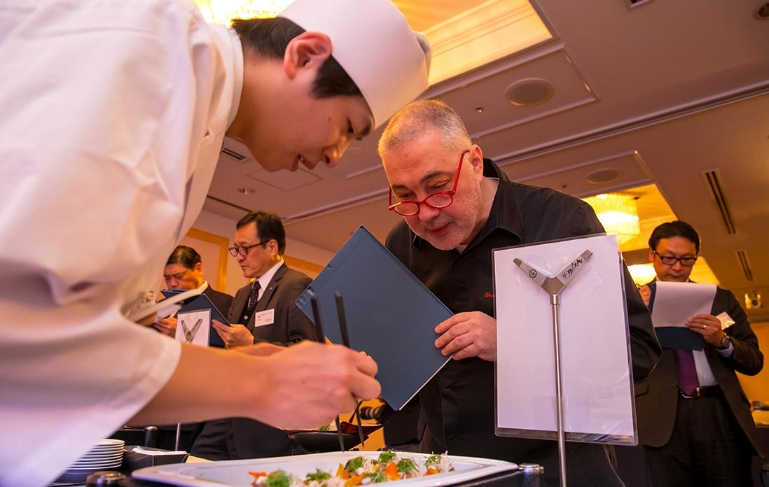 最終審査では、ファイナリストたちが調理場で料理を仕上げるライブ中継映像が、審査会場の大型モニターに映し出された。ほどなくして完成した料理が審査会場に運ばれてくると、審査員による試食がスタート。料理をはさんで審査員から質問を受ける次世代シェフたちは緊張の面持ちだ。