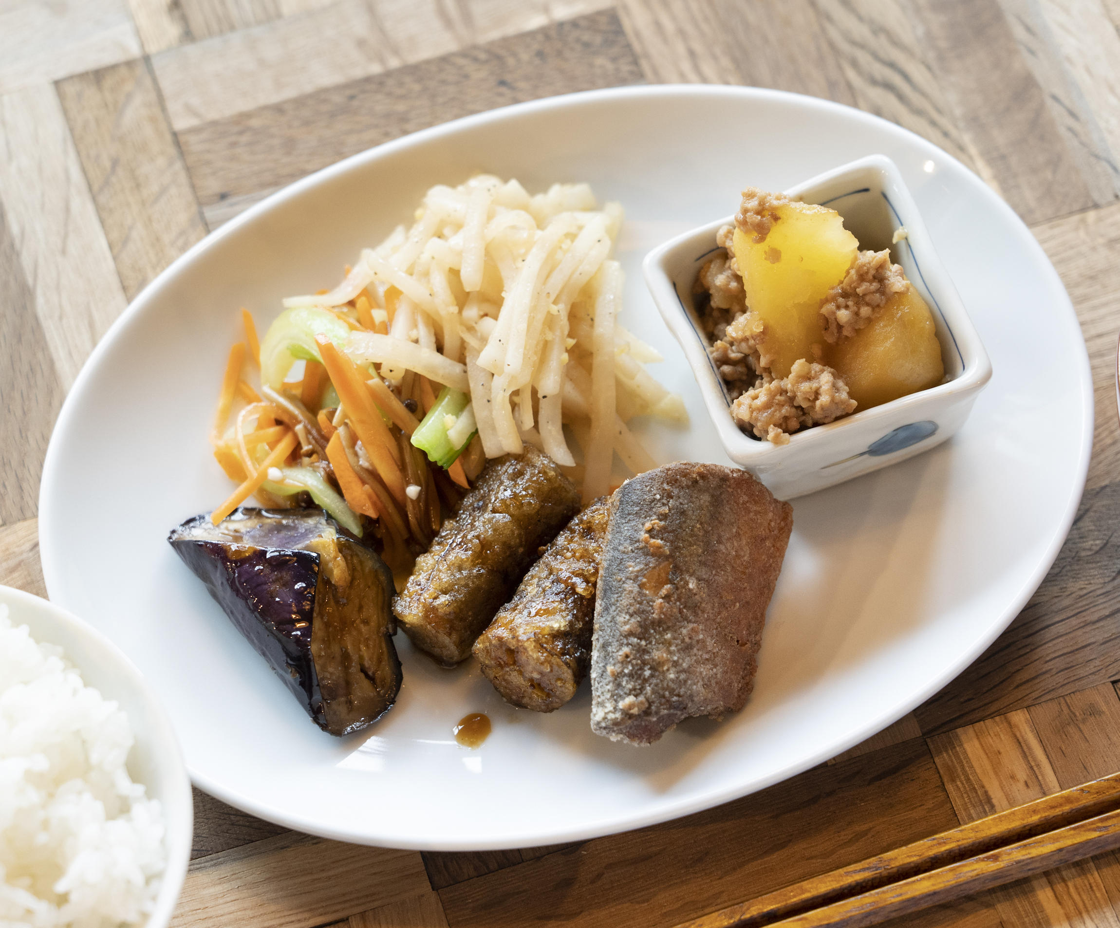 右側の小鉢から時計回りに「ジャガイモのそぼろ煮」「さんまの竜田揚」「もちもちごぼうフリット」「ナスのきび酢マリネ」「ちんげん菜、人参、えのきのナムル」。味噌汁にはかぼちゃとしめじが入っている。