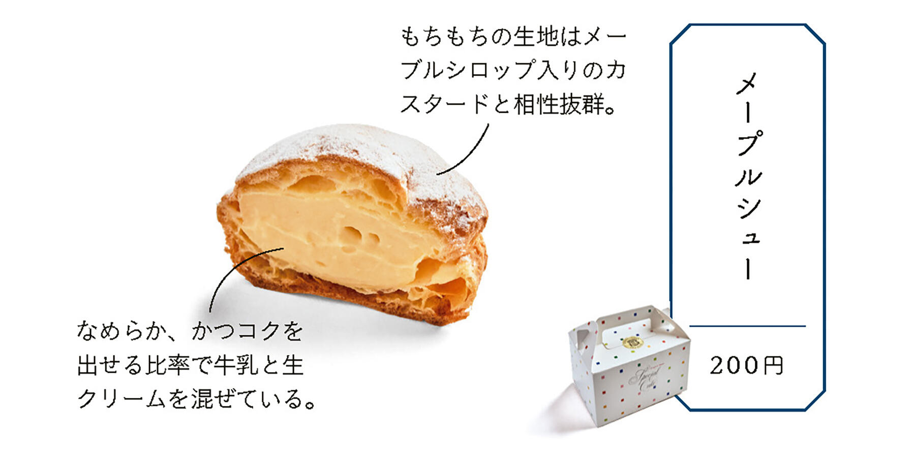 たとえば、芸術的なフォルムの洋菓子も素敵だが、緊張して手をつけにくい。だからこそ、この店では素朴な見た目で、食べやすいシュークリームを売り続ける。2年ほど前からは、カスタードにメープルシロップを追加。やさしい余韻を残す風味ととろける味わいで、より愛らしさが強調されたのだ。