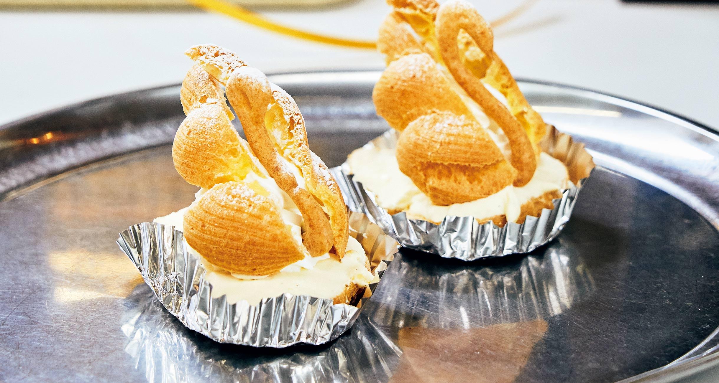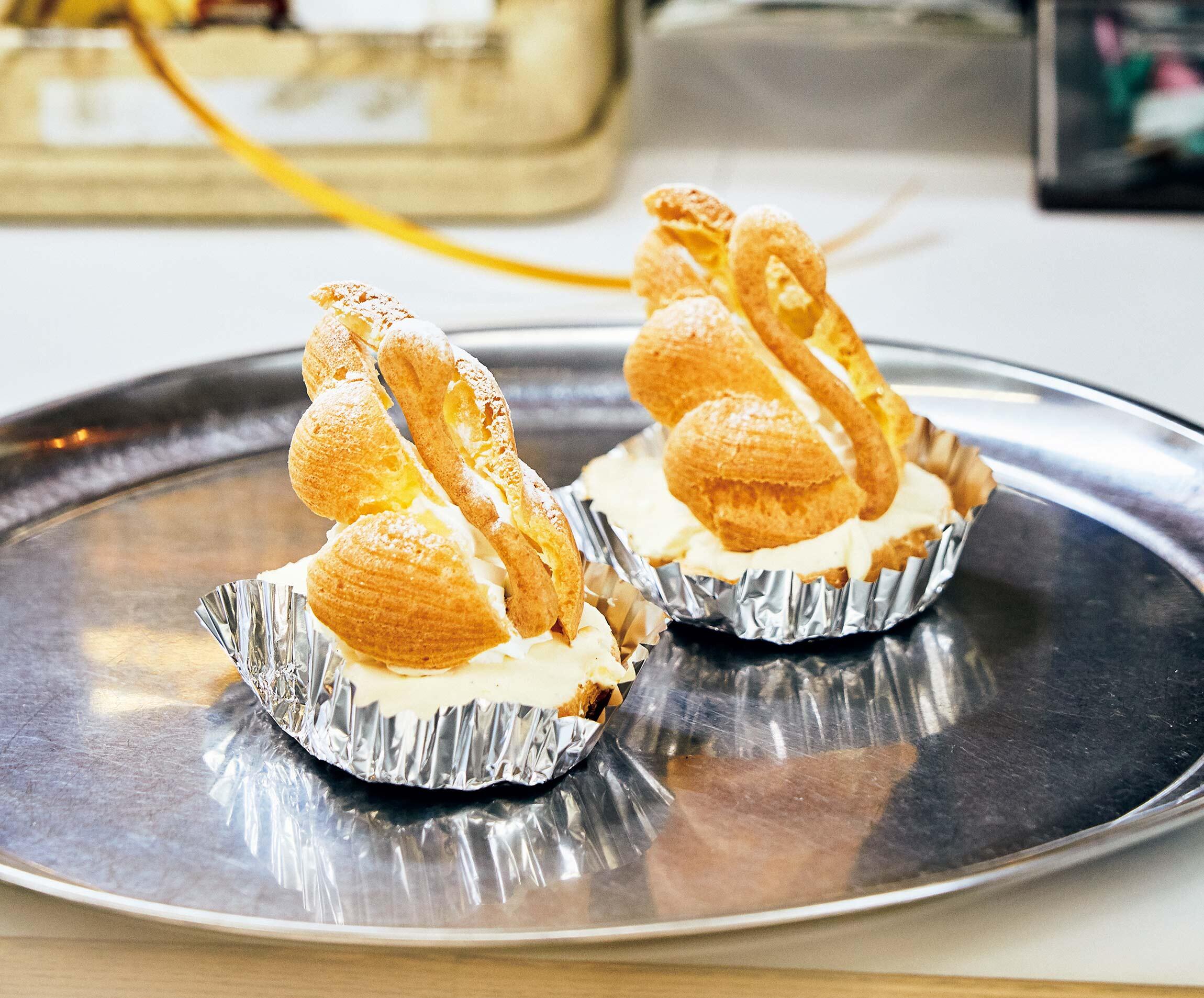 優雅なのは、白鳥を模した見た目だけではない。ホワイトキュラソーで香りづけした生クリームと、バニラビーンズをたっぷり使ったカスタードクリームが、まるでシルクのように口の中ですーっと溶けてゆく。気高いようで、上品さと素朴さが絶妙にからまり合って、不思議と親しみやすい。「羽でクリームをすくって食べてもおいしいですよ」と、二代目の白鳥忠光さんは話す。