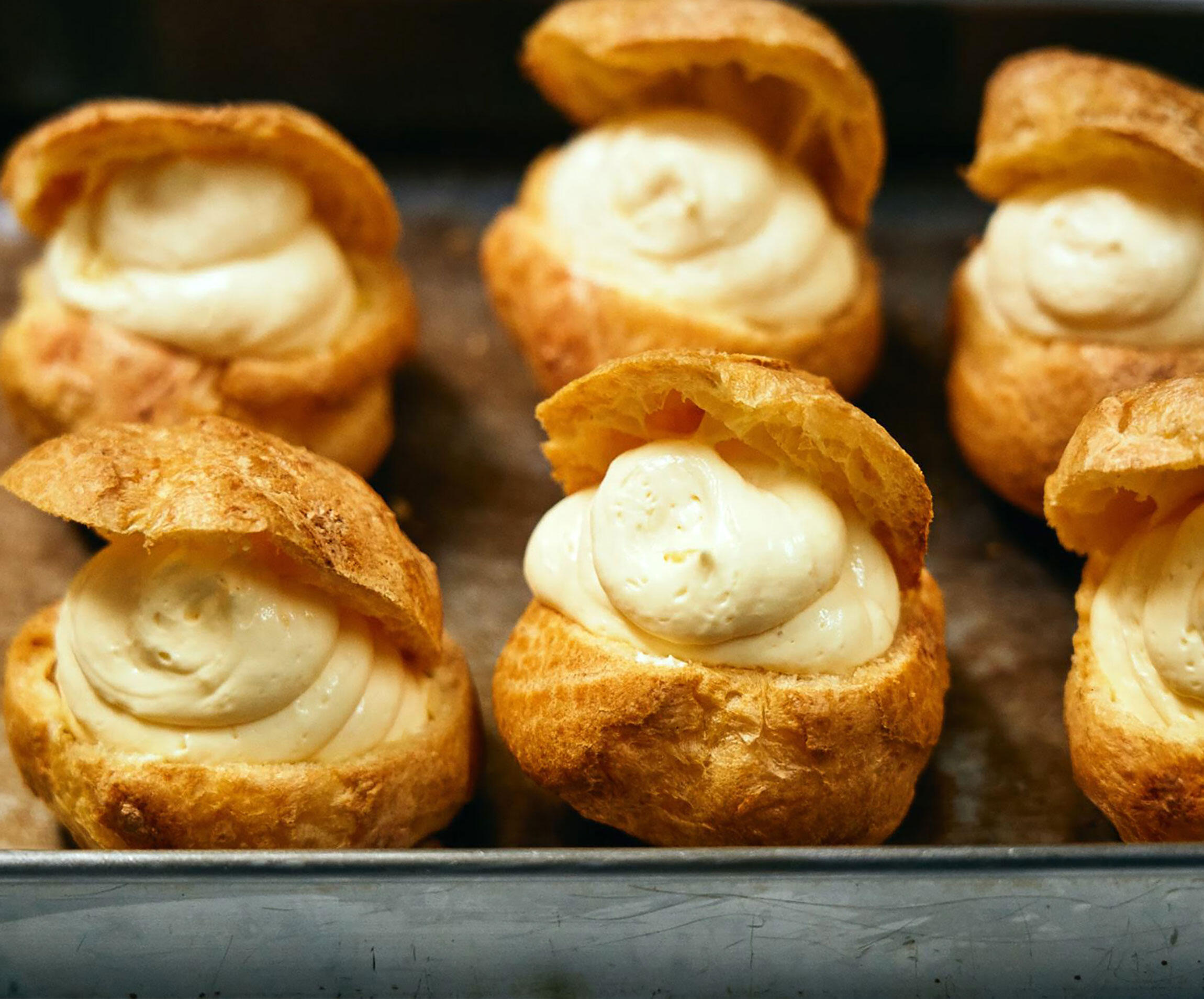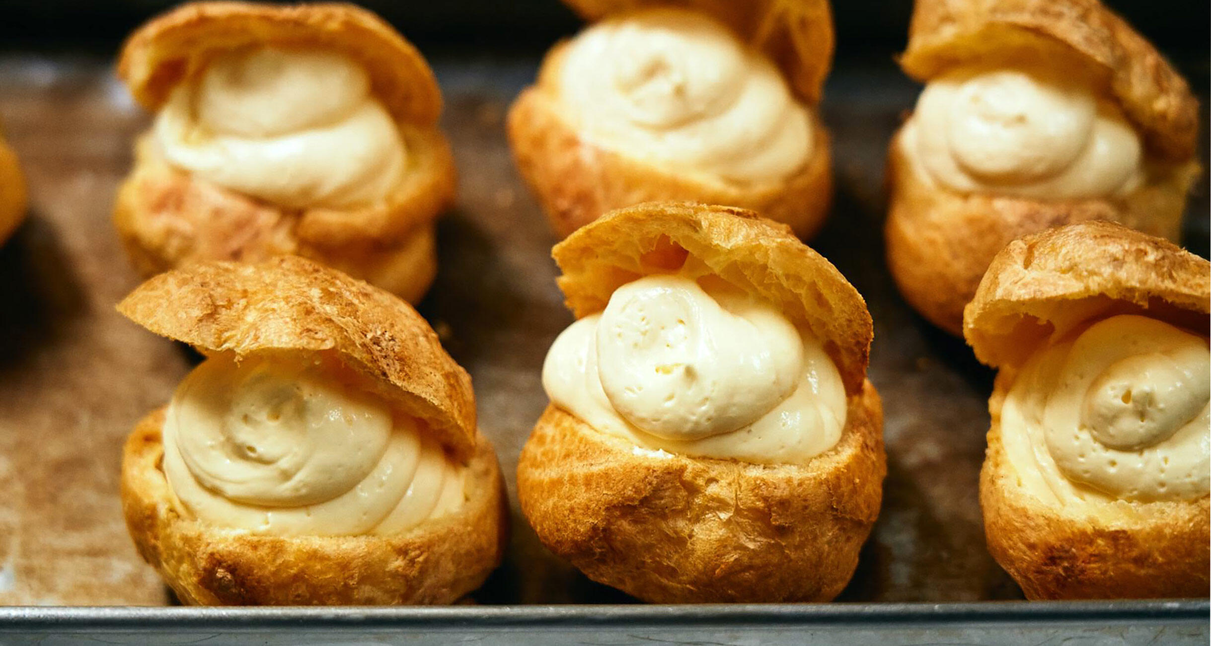 田中政二さんにとって、シュークリームの主役は“皮”。最も大切にしているのは、卵のやさしい味わいだ。卵と小麦粉の一般的な比率よりはるかに卵を増やして、風味を強調している。その分、オーブンにつきっきりで焼き具合を確認する手間がかかるが、それでも構わない。カスタードは、皮の風味が引き立つよう、さっぱりめでミルキーな味に仕上げた。