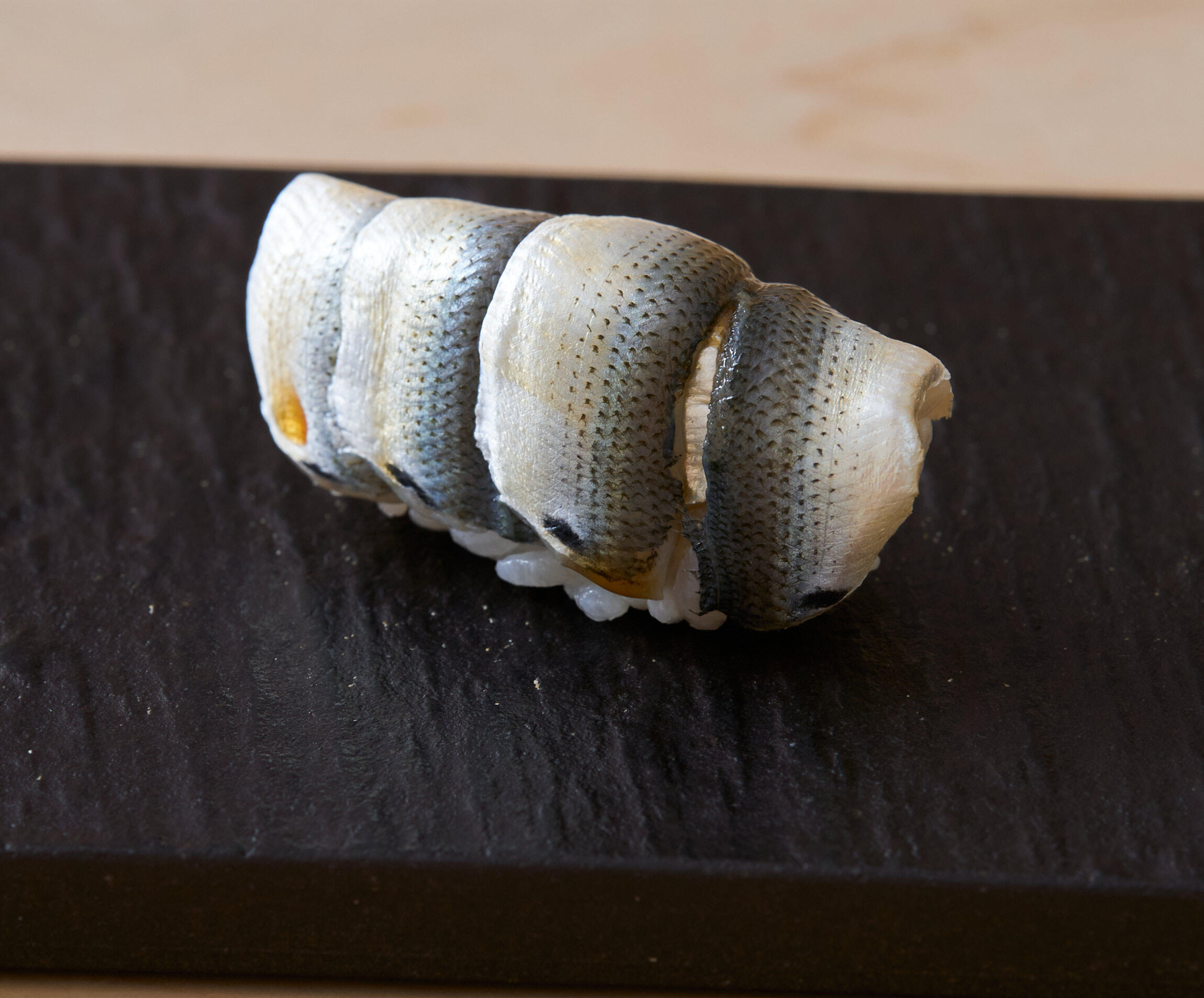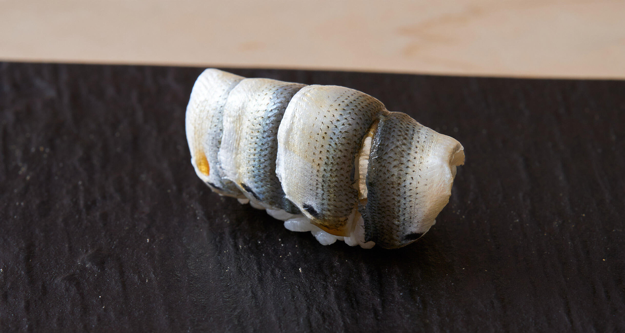 「6月に静岡の舞阪から一番最初の小さな新子が出てきても、僕は使いません。7月中旬ぐらいに九州の熊本・天草や佐賀などから新子が出て、だいたい1貫3枚づけ、2枚づけで握れるようになって初めて使っていく感じですね。それで、だいたい8月の末、あるいは9月初めぐらいまで、1貫に1枚づけぐらいで握るのがうちで出す新子の握りという感じです」