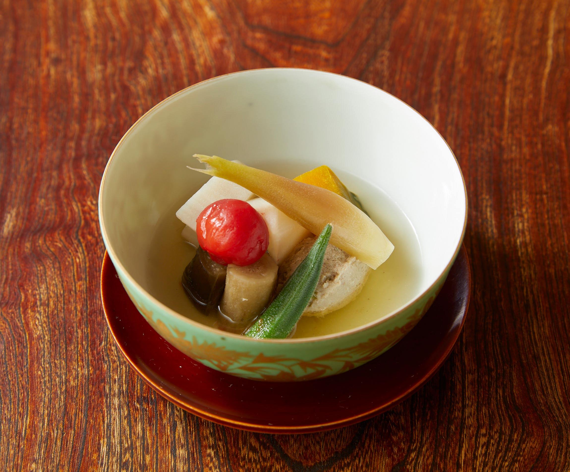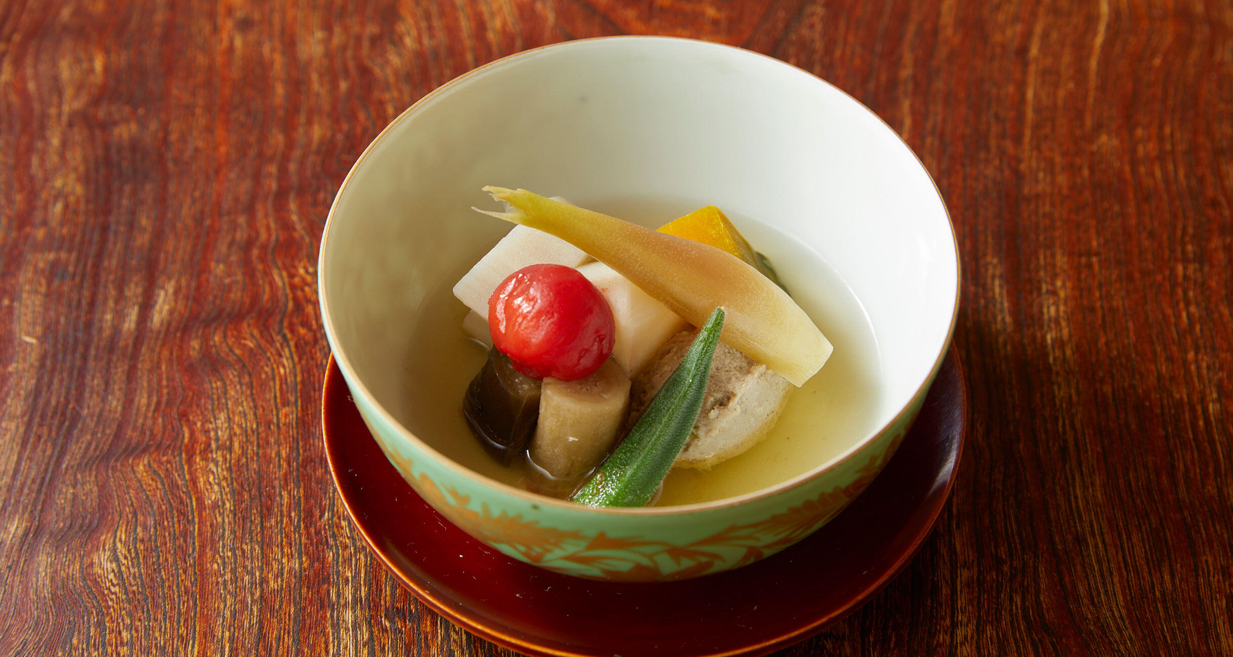 出てきたのは、一皿の中に10種類ほどの野菜が盛られた「野菜の炊き合わせ」だ。きちんと向き合って食べると、この一皿が、いかに手間のかかったものかわかる。すべての野菜はそれぞれに合わせただしで炊いてあり、くっきりとした素材の味の後ろ側に、一つ一つ、異なる風味が隠れているのを感じる。