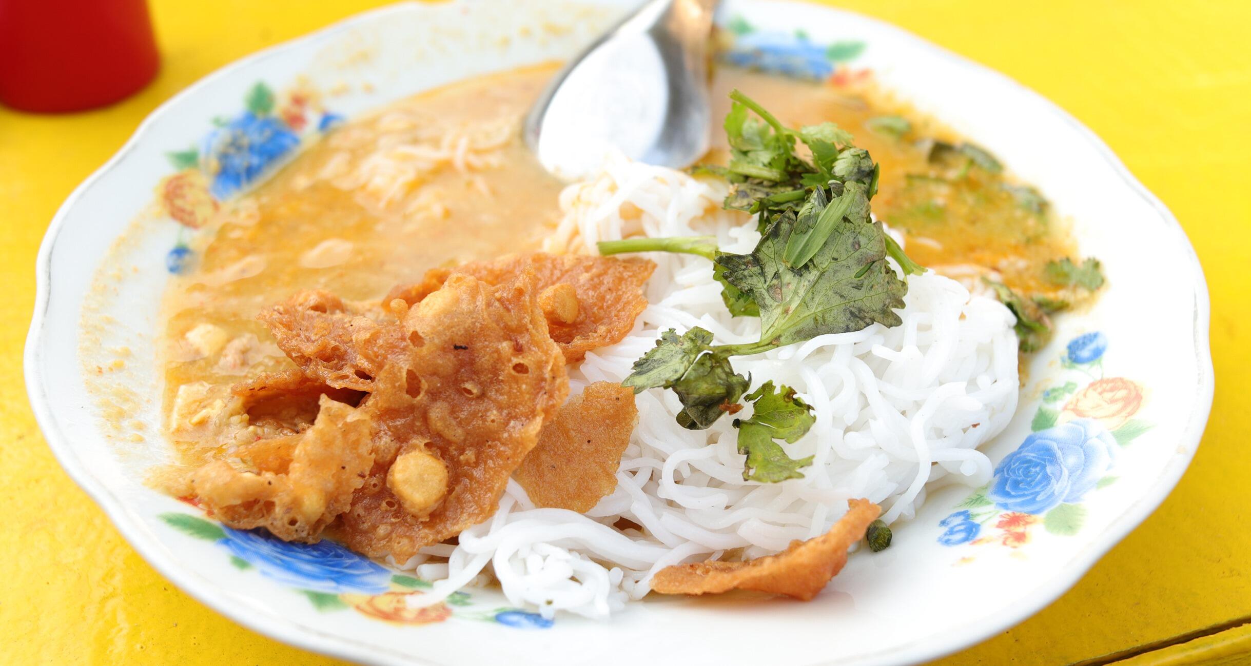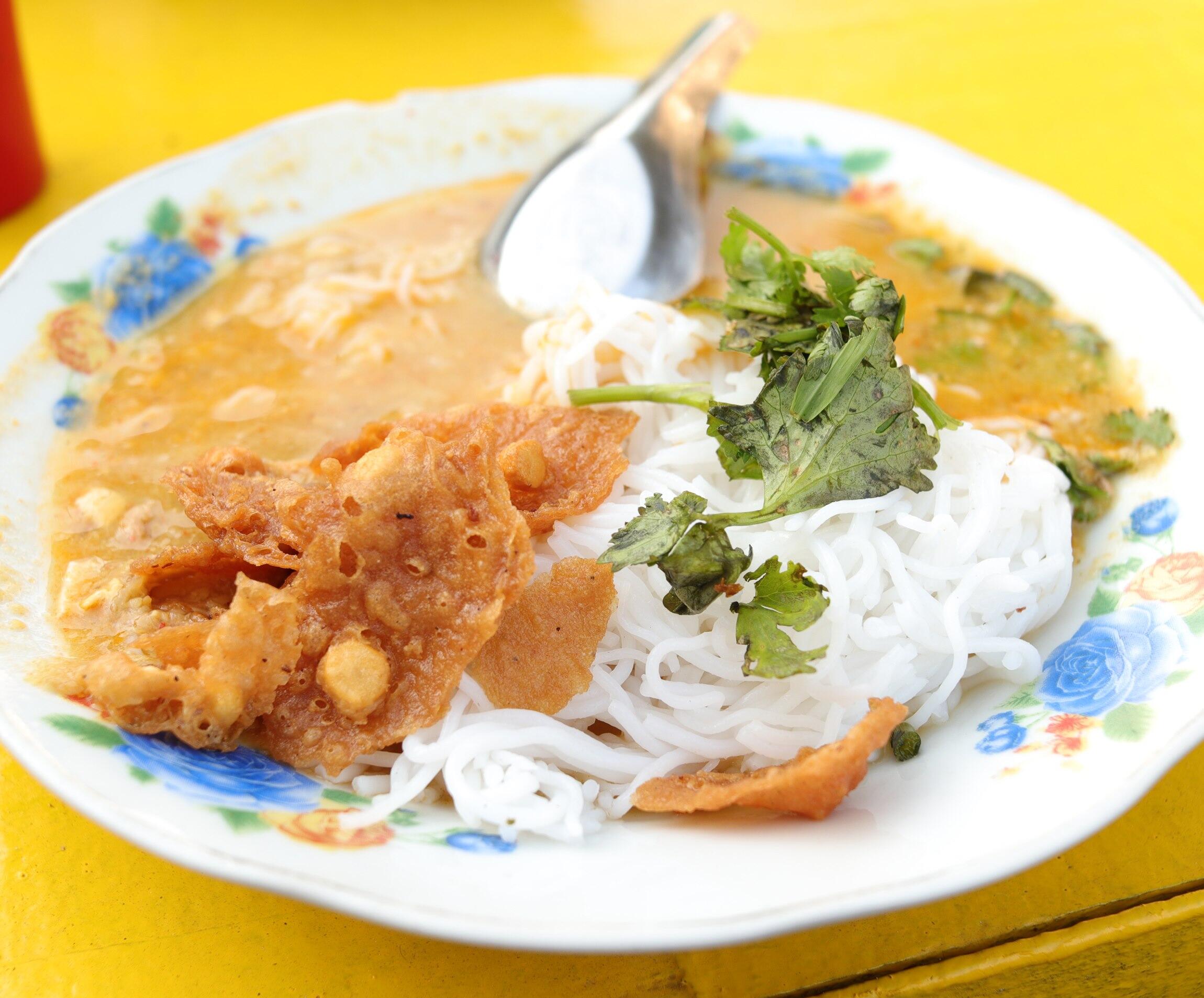ええい、ままよ。食べてみると、あれ?意外に深い味わいだ。ピリッとした辛さのあとに広がるまろやかな余韻。ココナッツミルクかな。酢が入っているのか酸味もある。ほかに鶏の出汁や、魚醤?……よくわからないけれど、幾種類もの香りと味が混じり合って、ひんやりつるつるの麺に絡んでいる。さっぱりしているのにコクがある。こりゃあいい。