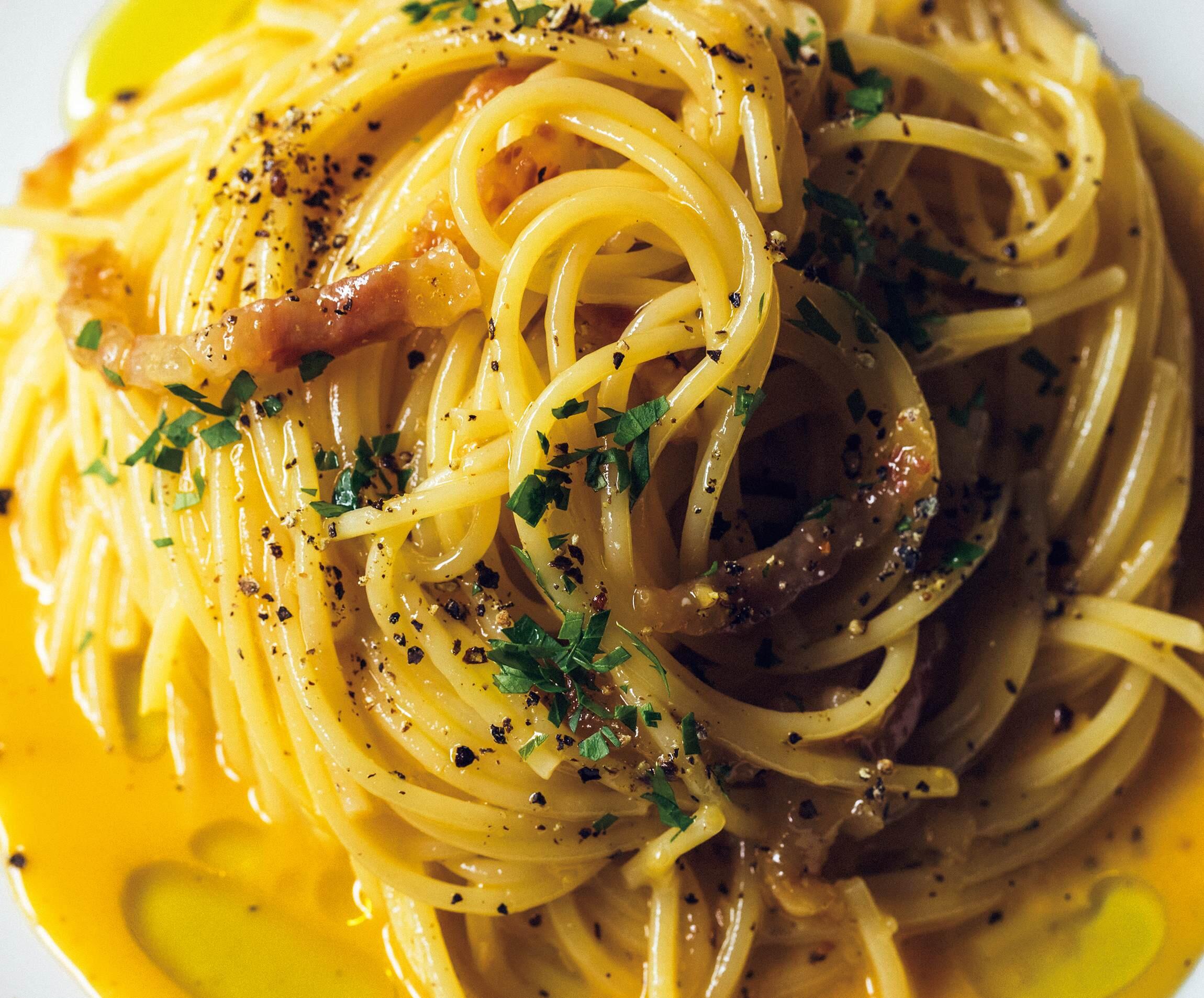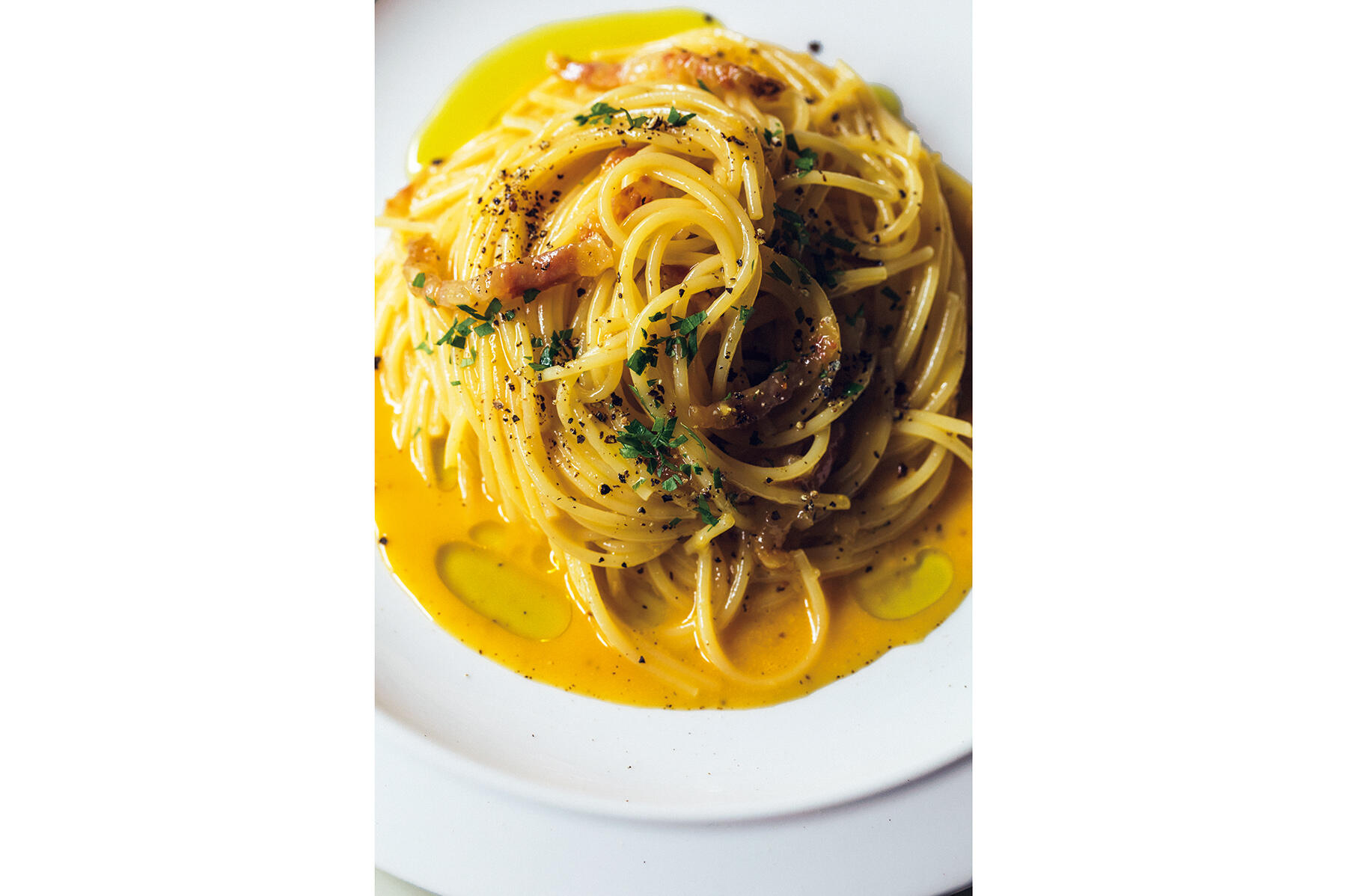 ではカルボナーラのあのクリーミーさを何で出すかというと、キモは卵とチーズだろう。マヨネーズのなめらかさが卵とサラダ油で出るように、卵が粉状のチーズの脂分や、オリーブオイルでカリカリに炒めたパンチェッタ(塩漬け豚バラ肉)またはグアンチャーレ(塩漬け豚頬肉)の脂分と乳化することで絶妙ななめらかさが生まれる。この“乳化力”が味を大きく左右するため、カルボナーラはつくり手の技を食べるものだと言ってよいだろう。
