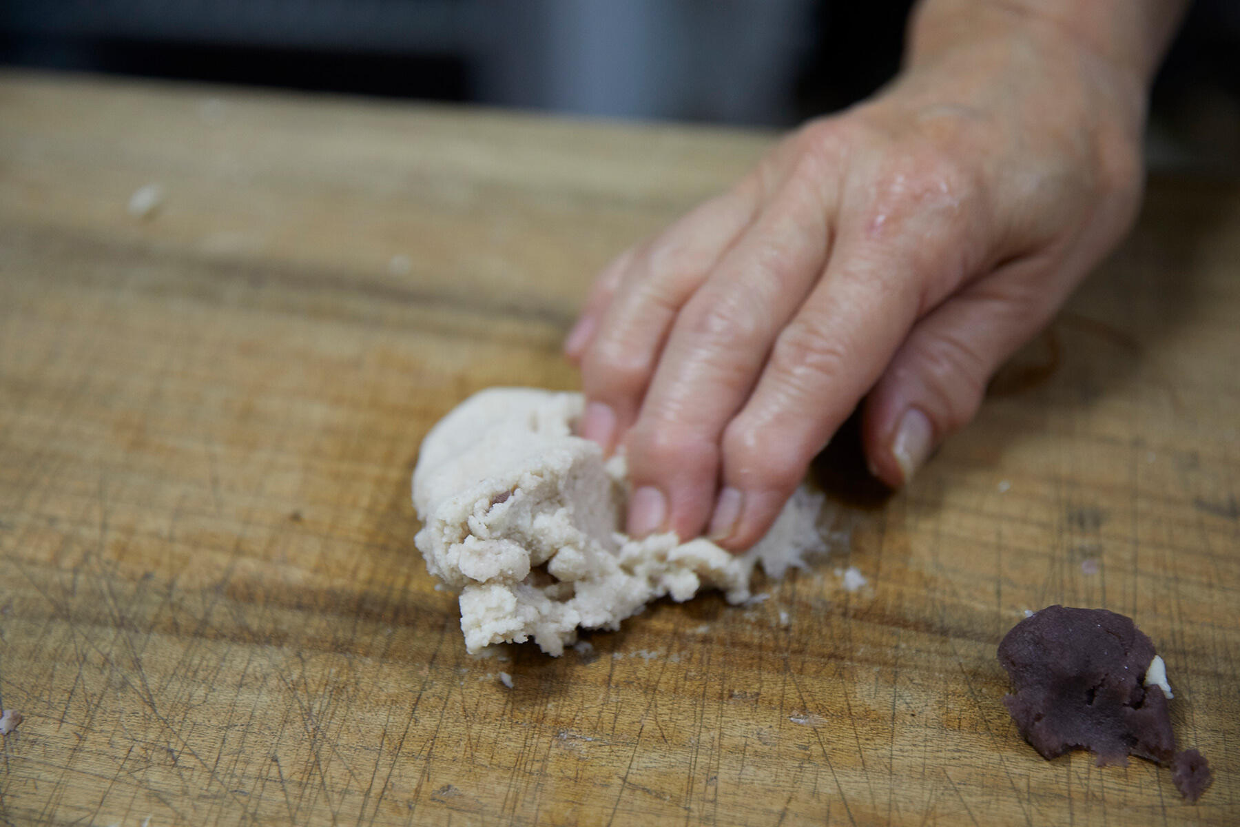 次は、この生地を小さく分ける作業。その後、少量の生地を別に取り、漉し餡を混ぜて“ぼかし”をつくる。白餡に色をつけるわけだ。ぱっと見には、色の違いはないように見えるが、「蒸すと色が濃くなるから、ほんの少しでいい」らしい。
