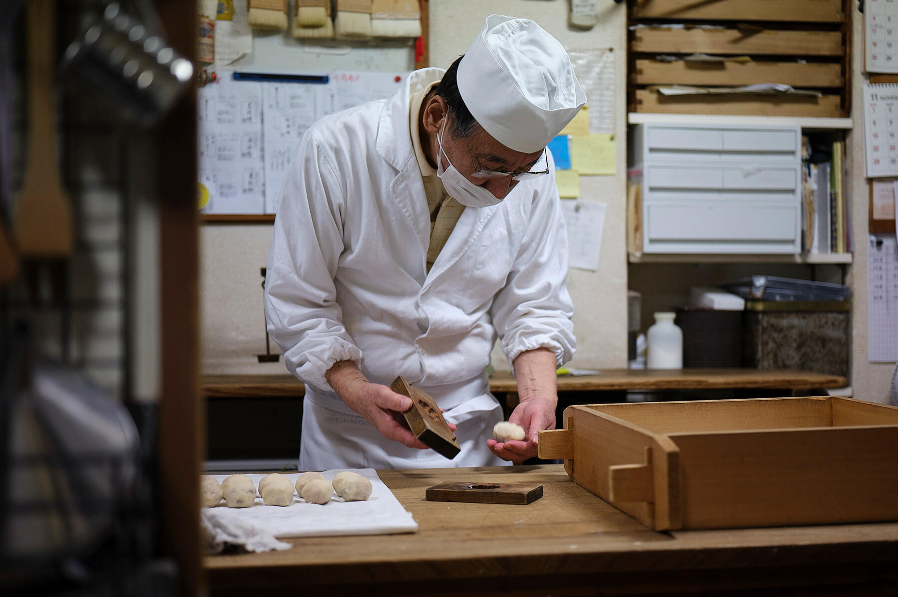 そこに、丸めた生地を入れては抜き、を繰り返す。木型に餡がくっつきやすいから、手際よく、リズムよくやらないときれいな形にはならない。一つ抜くごとに、上の型と下の型をそれぞれ濡れ布巾でていねいに拭く。手間と根気のいる作業。