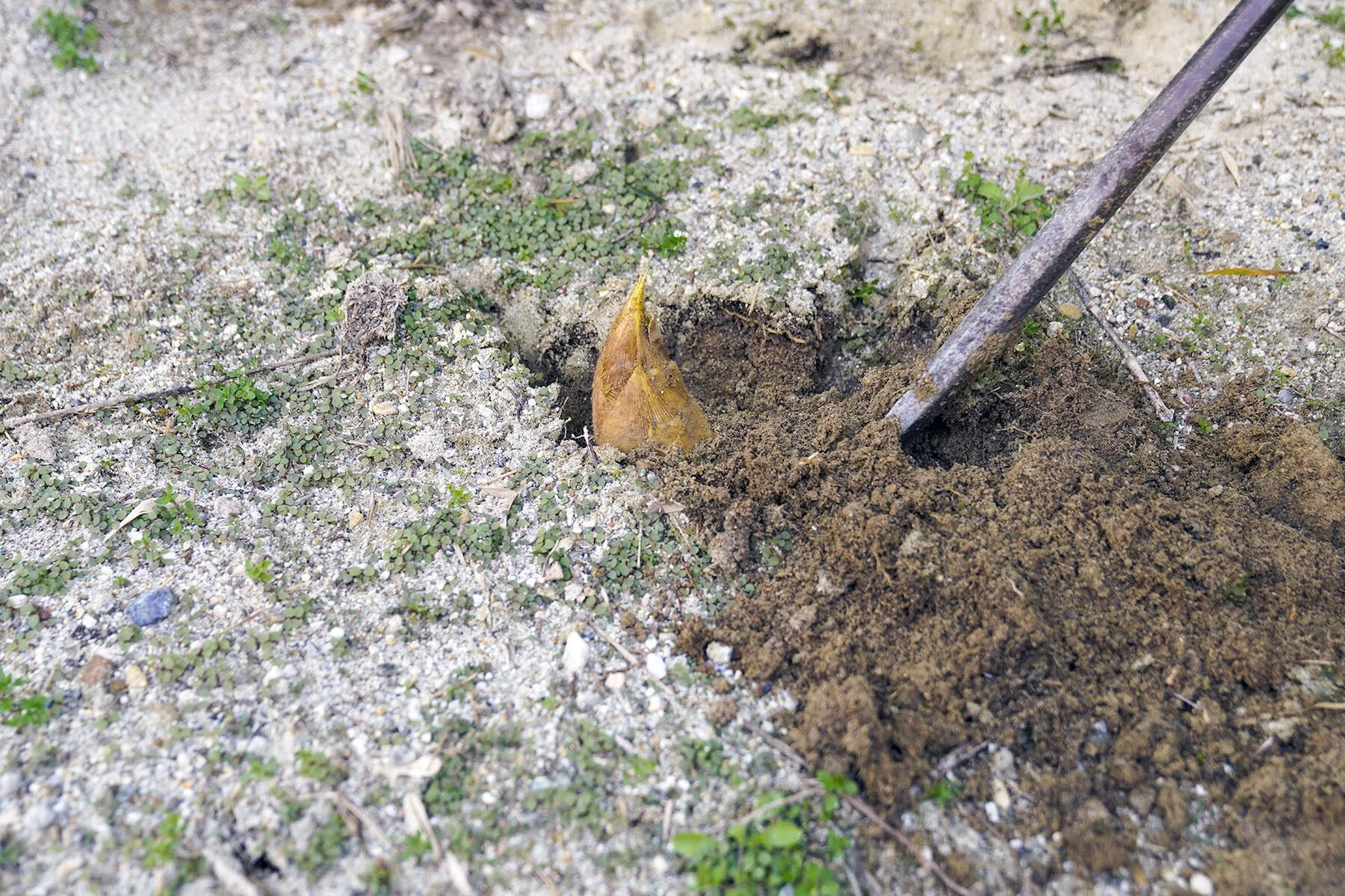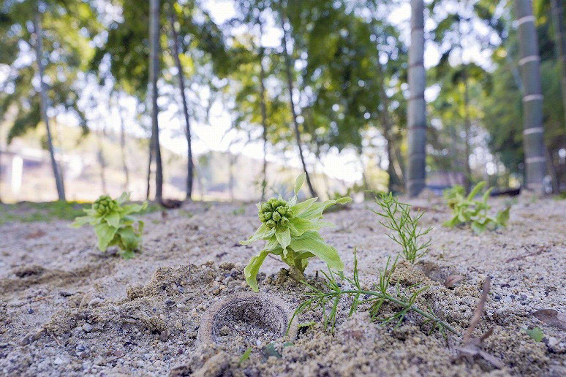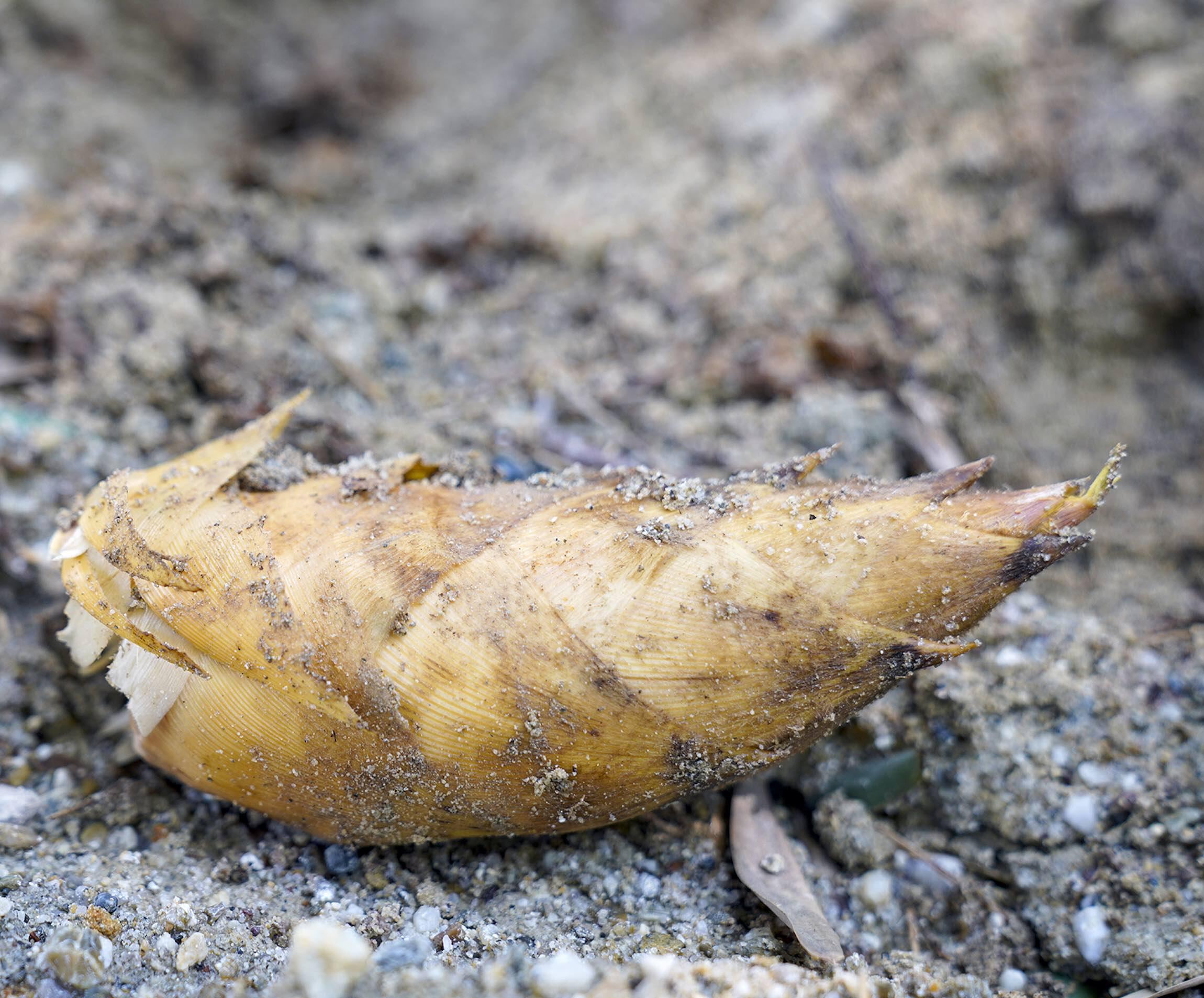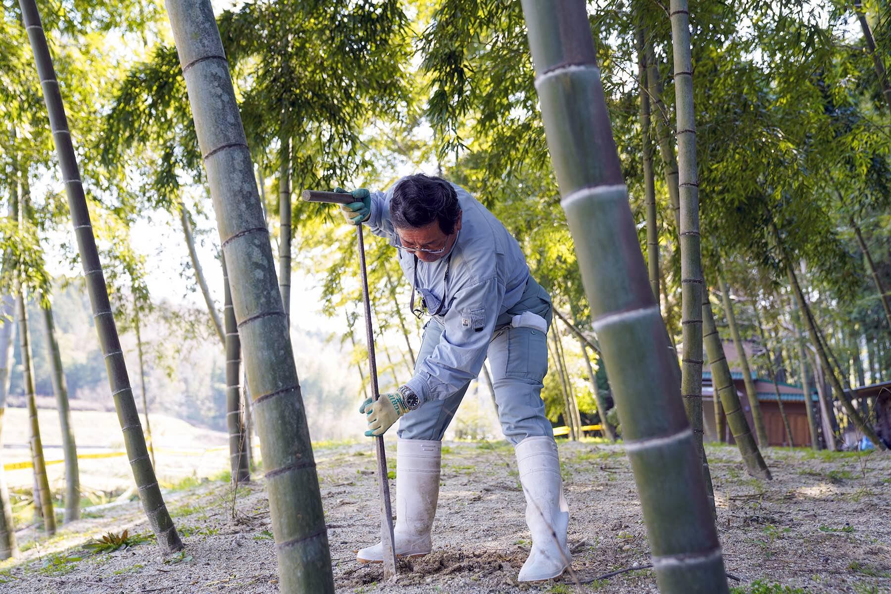 中国から日本に孟宗竹が伝来した地の一つとされる京都やましろ地域は、古くから筍の名産地。粘土質の土壌は有機質肥料の養分と水分を、安定的に竹に供給するから、質の良い筍が育つ。秋から冬、竹林に大量の土を投入する『土入れ作業』が行われる。筍のための保水・保湿のふかふか布団の役割を果たす。布団の僅かな膨らみで、筍の場所がわかるので、日光を浴びる前の、色白で柔らかでエグミが少なく、しかも歯ざわりが良い、素晴らしい筍が収穫できる。