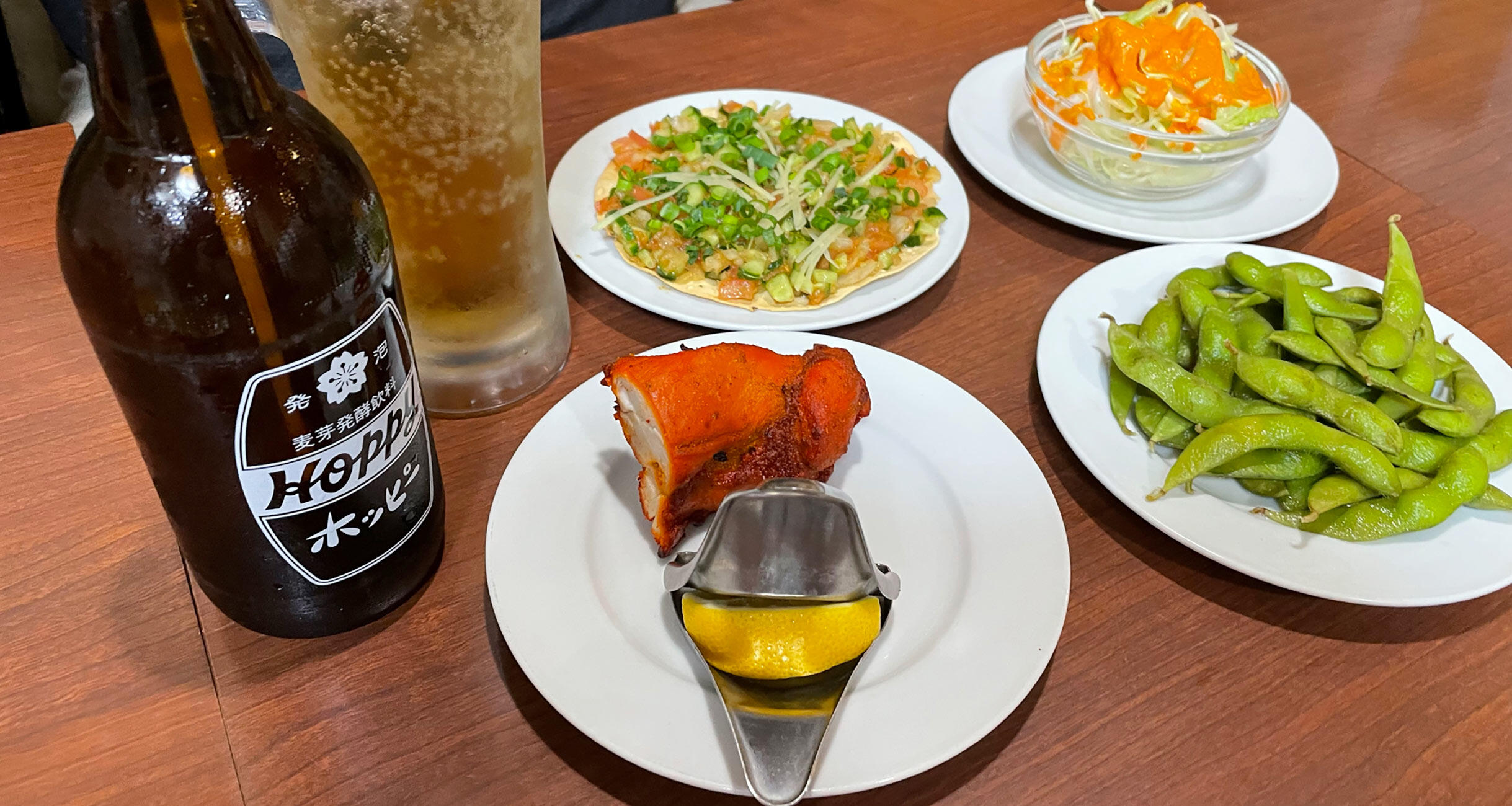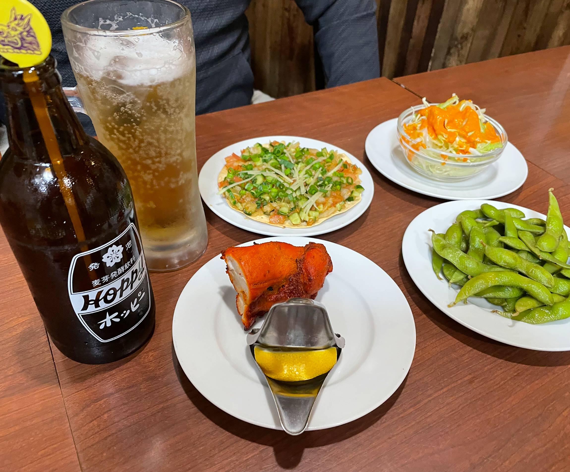 - メニューに“梅きゅうり”“ヤゲン軟骨揚げ”“アジフライ”といった日本の居酒屋料理があるのも新鮮です。ホッピーのセットも550円はお手頃ですね