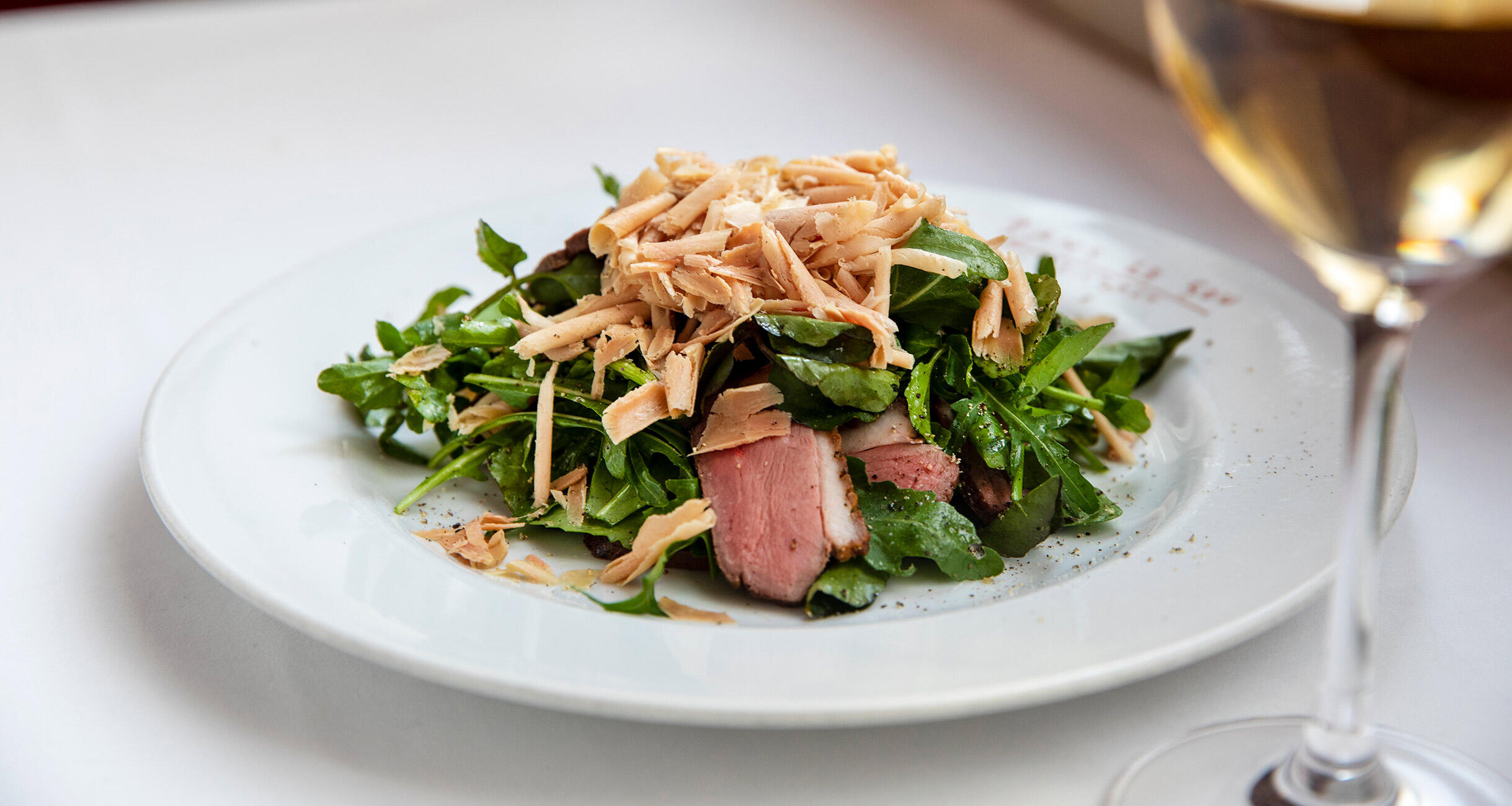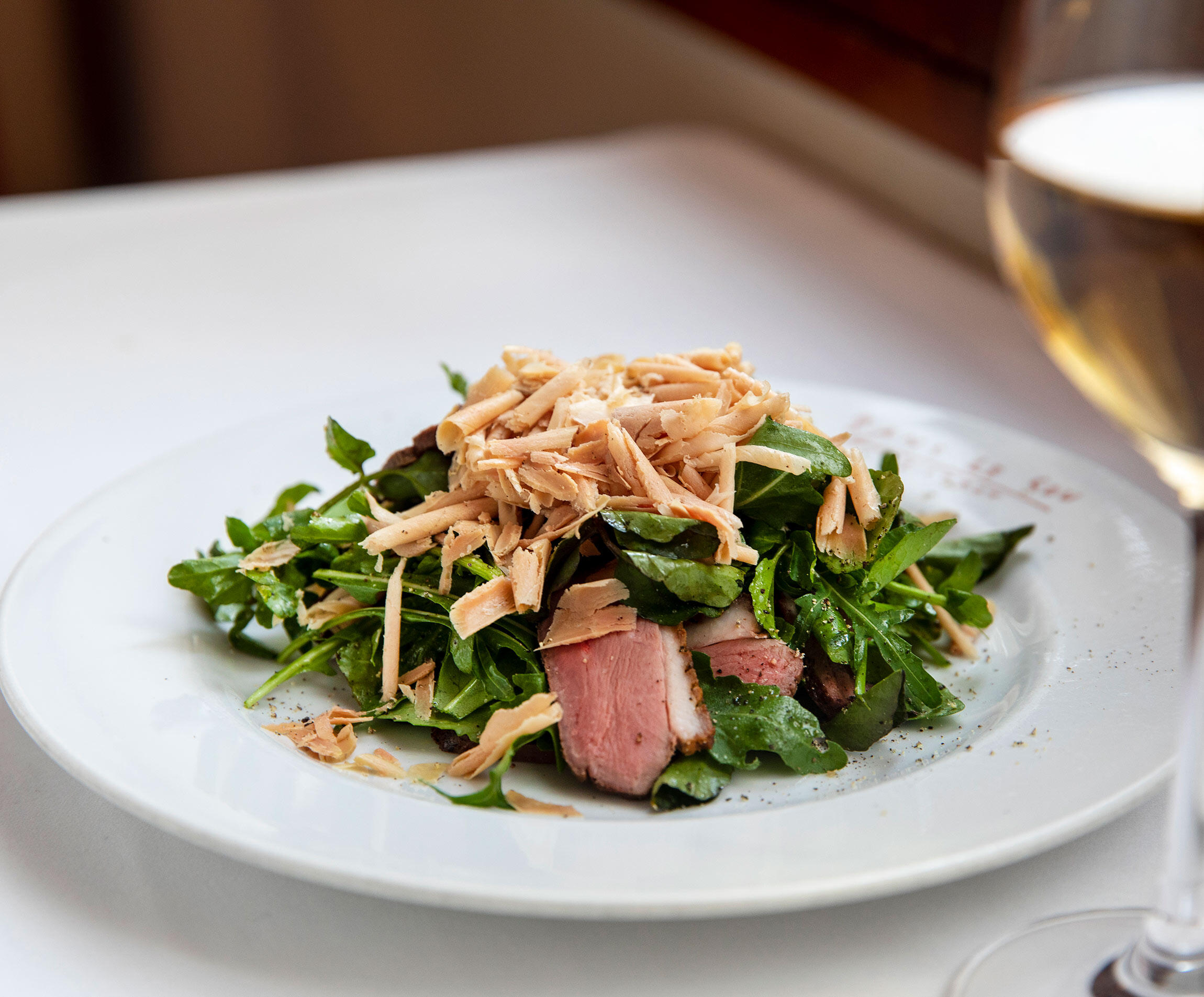 好きなメニュ-は多々あるが、中でも頼む頻度が多いのは、前菜としてチョイスできる冒頭の一皿「鴨むね肉の燻製と削ったフォアグラのコンフィ、クレソン、ロケットのサラダ」だ。濃緑のサラダの上に、まるで鰹節のようなひらひらしたベージュのかけらがたっぷり。口に運べば、濃厚なフォアグラと爽やかなクレソンやルッコラが一体となって、なんともいえない幸福感に包まれる。