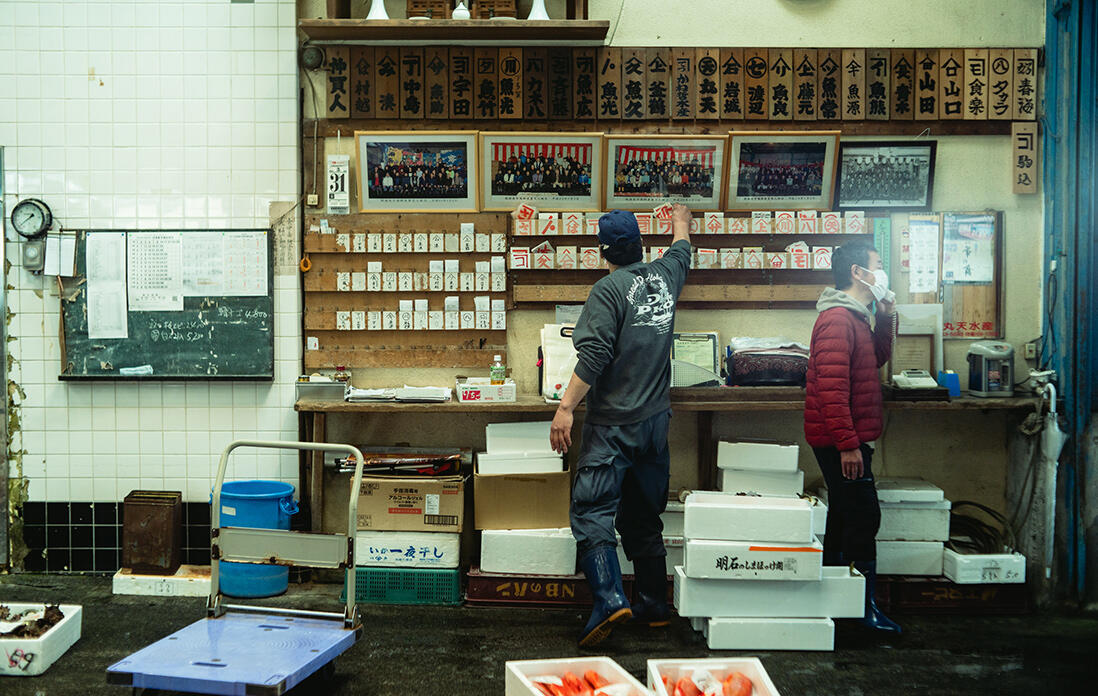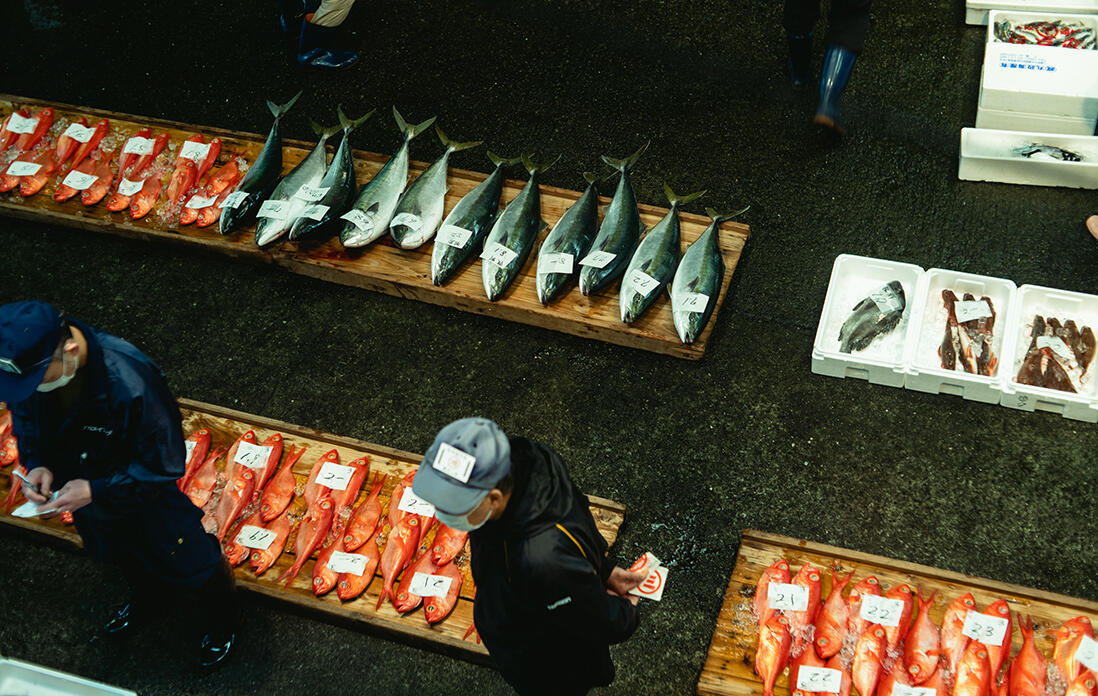 早朝7時半ごろから、場内で競りが始まる。いい魚を我先にという殺伐とした雰囲気はなく、アットホームで、魚種や量はこそ少ないが、並ぶ魚の鮮度は東京の市場よりもよく感じた。