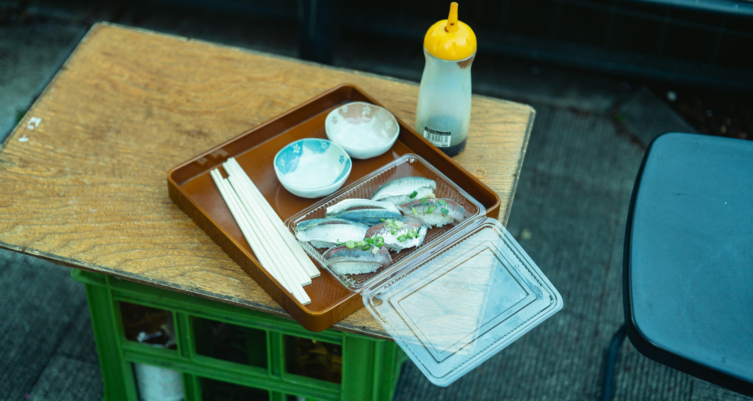 おじさんは慣れた手つきで簡易テーブルを組み立てると、「ここで食べな、持ってきてやるから」。そう言って、鮨と刺身をのせた盆に、醤油に小皿、割り箸までセットされた状態で運ばれてきたのだ。なんだこれ。控えめに言って最高だぞ!