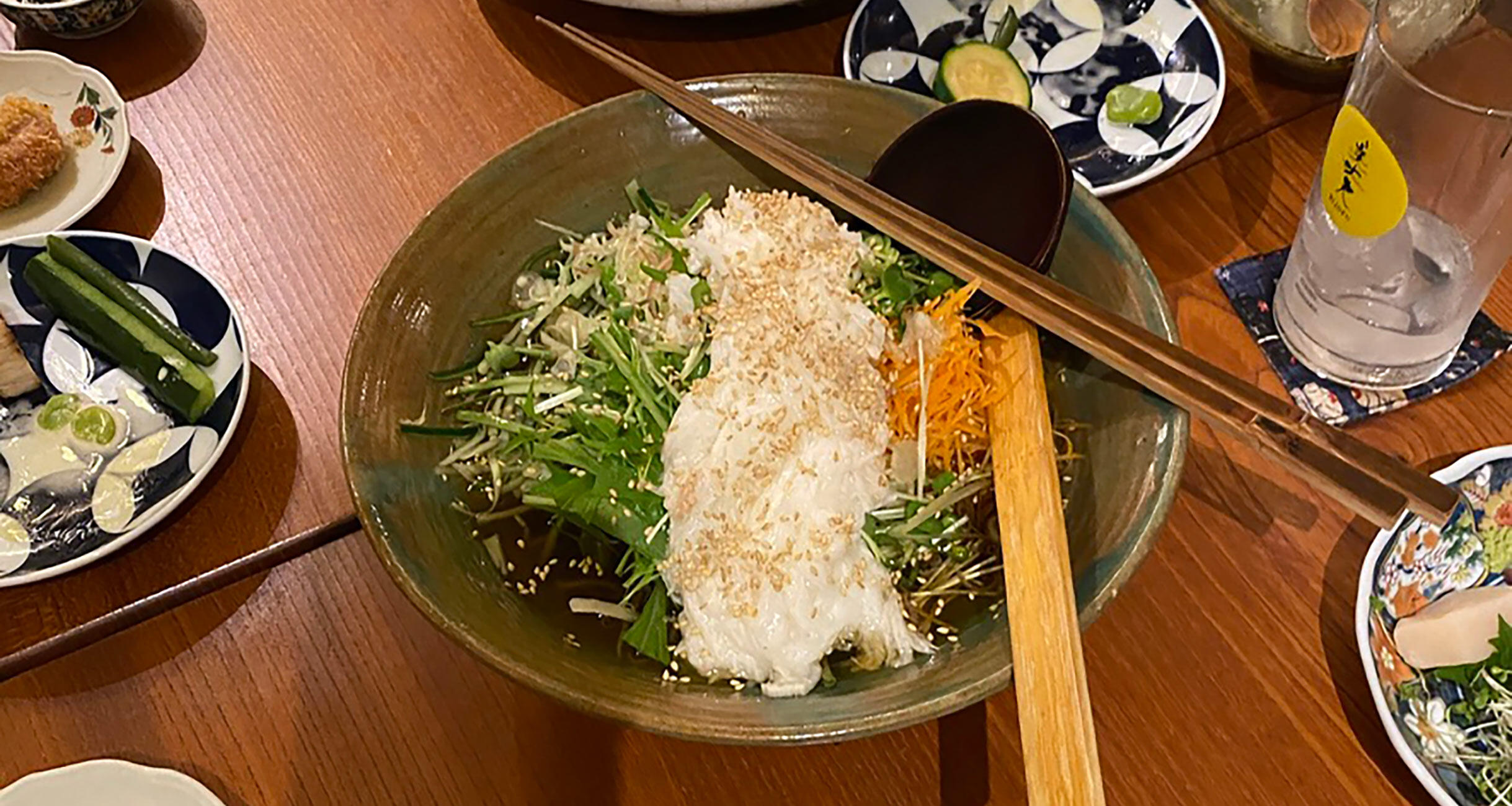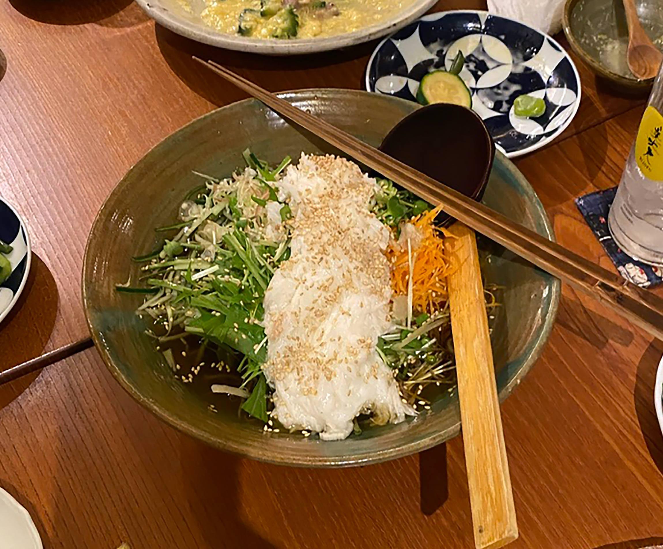 大きな器に入って出てきたのは、だしの中にきゅうり、にんじん、みょうがなどの野菜の細切りがたっぷり入り、そのうえに山芋の千切りをのせて胡麻をふったもの。“締め”というにはあまりにも野菜感が強く、頭の中に「?」が三つぐらい浮かんだのですが、お椀に取り分けて食べると……ああ、なんて爽快!軽やか!すっきり旨い!だしの深い味わいが野菜のシャキシャキ感を引き立て、さらに山芋が全体をまろやかに包んで胡麻の香りとともに口の中にやさしい旨味が広がります。野菜の千切りが麺のような食感になるので、確かに“締め”としての満足感もある!そしてたくさん食べても軽い!