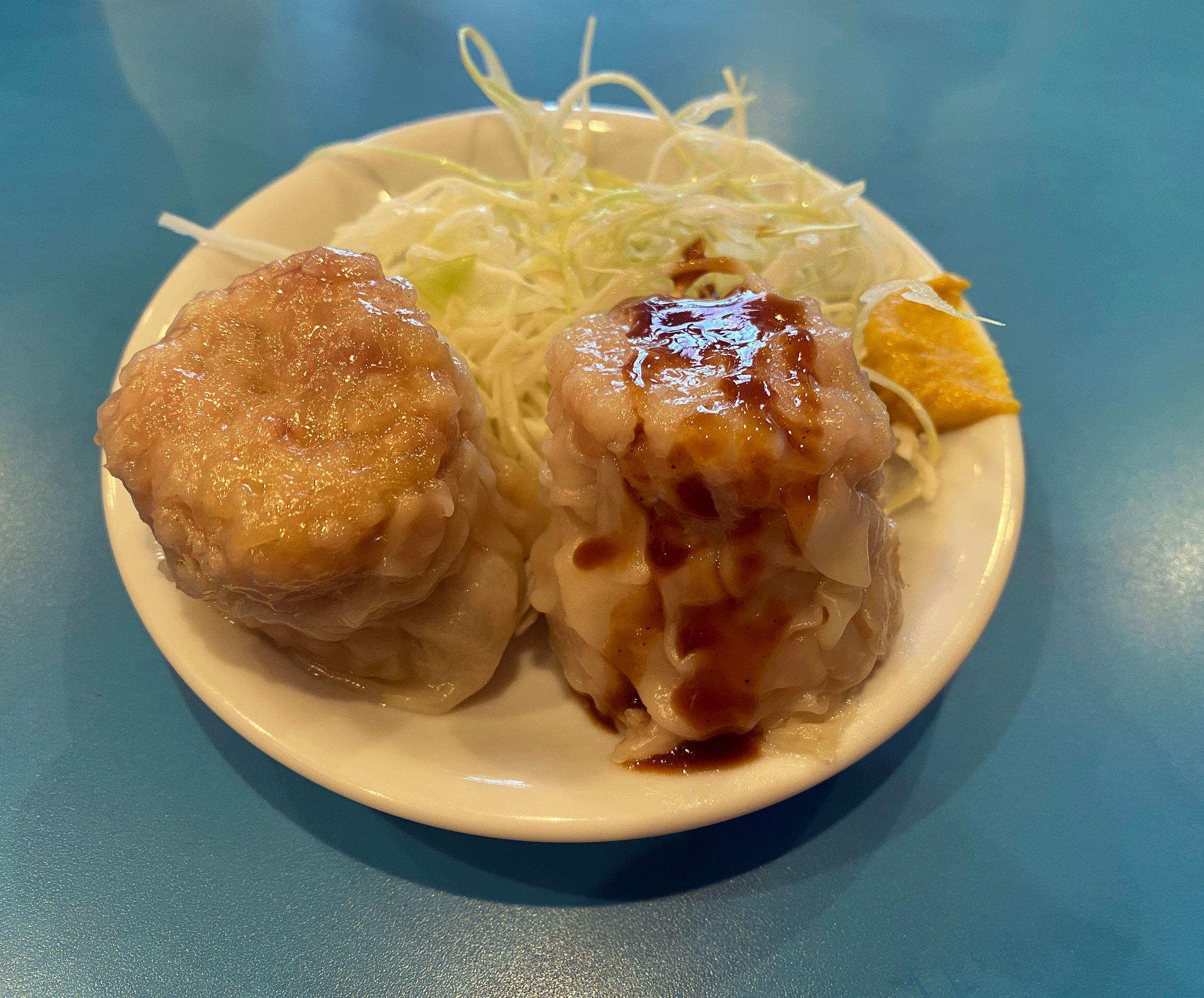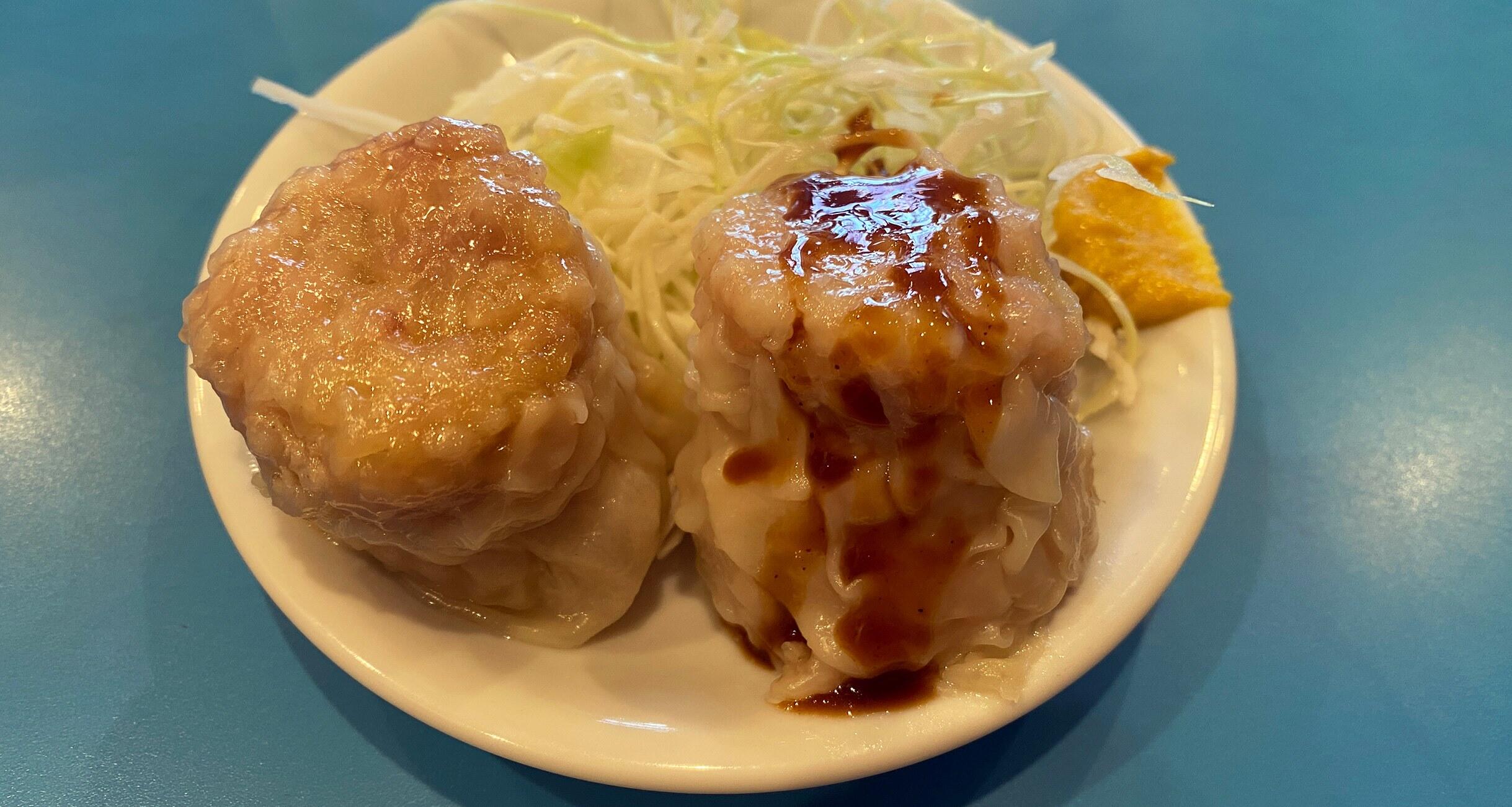 僕はたまにしか行けないので、今日はポークライスにしようか、麻婆丼かな。ソース焼きそばもいいな……と迷うのですが、結局いつも同じものを頼んでしまいます。それが「野菜そば、麺少なめ、ワンタントッピング。焼売半個」です。これはタンメン(なぜか「野菜そば」と呼ぶ人が多い)の麺を減らしてもらい、ワンタンを入れてもらうもの。そして、焼売半個は千切りキャベツとともに小皿に2個のったものです(焼売「一皿」には4個のっていて、でもみんなご飯や麺類と併せて頼むので、2個で頼む人が多い)。いつも同じものを頼んでいるから、いつしか椅子に座っただけで自動的に「焼売半個」が出てくるようになりました。この焼売が大ぶりで程よい食感の中にもしっかり肉を感じられて旨い。さらに、焼売にはソースをかけるのが市場のデフォルトで、僕も一個はなにもつけずに、もう一個にはソースをかけて。なにもつけない方は肉の旨味が、ソースをかけた方は肉の甘味が際立ちます。どちらも美味。