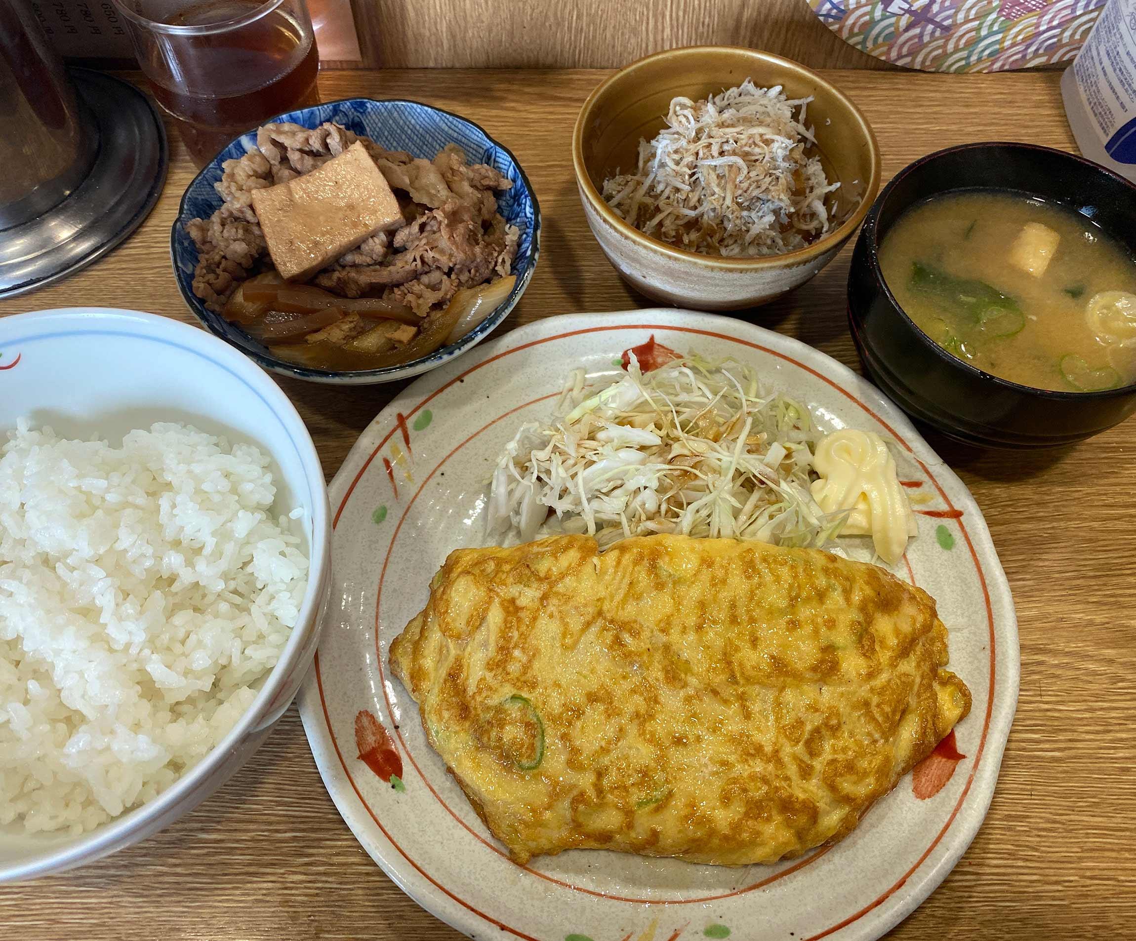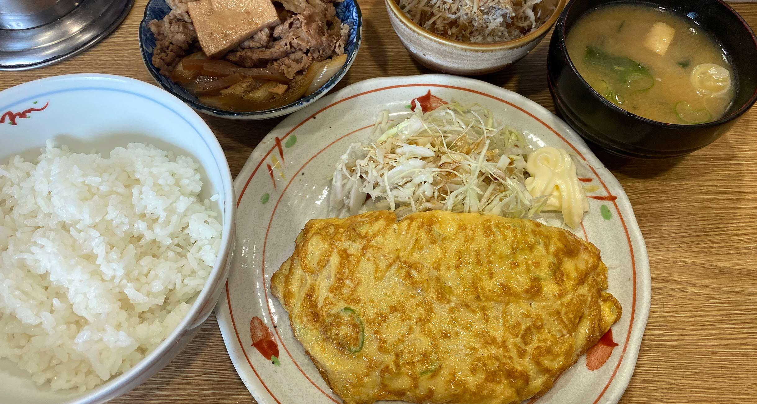 この日は玉子焼き定食を注文。でも、やはり牛丼の雰囲気も味わいたくて、小皿(牛皿の小)も追加、ちょっとさっぱりしたものも欲しくてしらすおろしも注文。