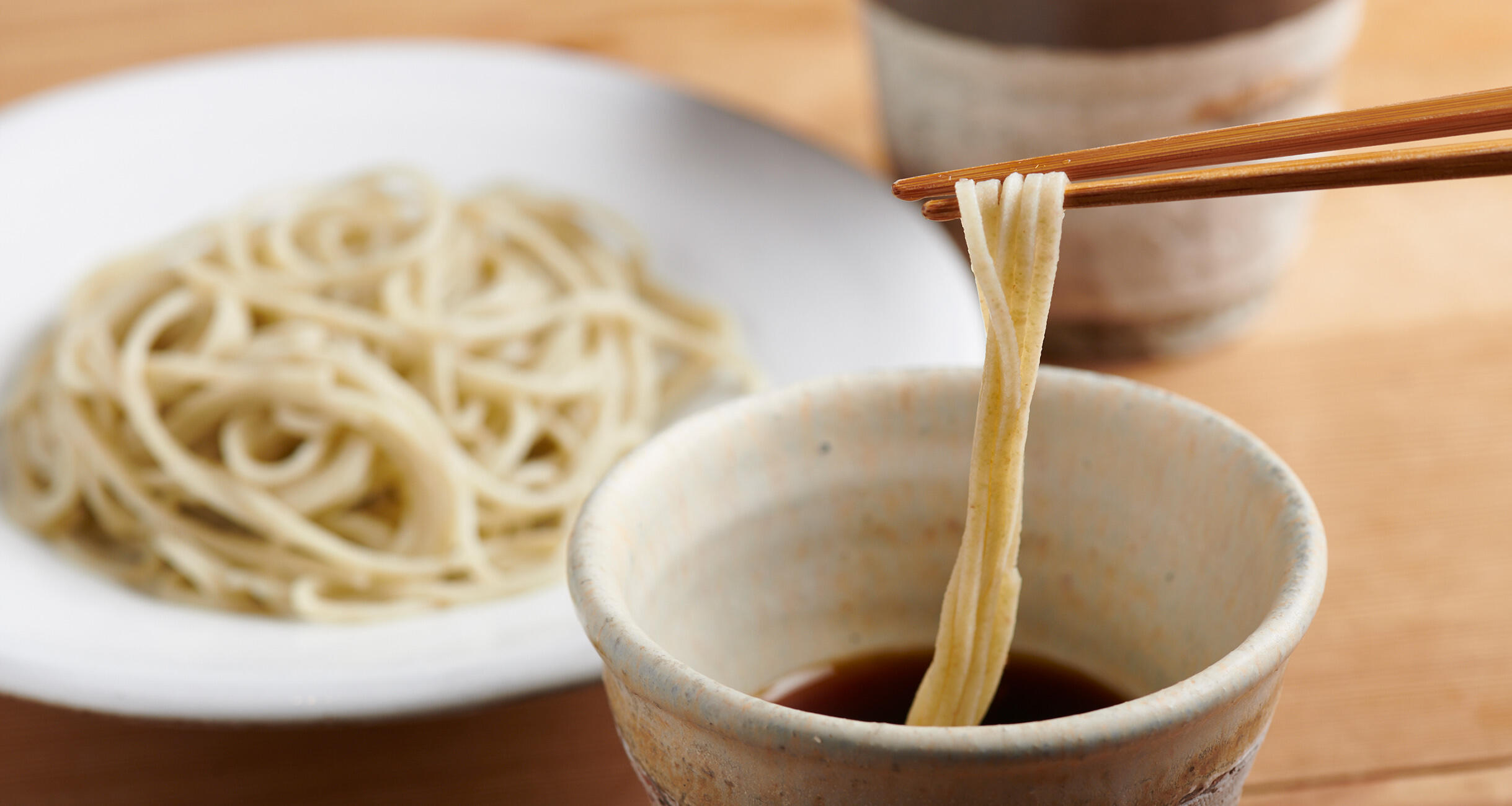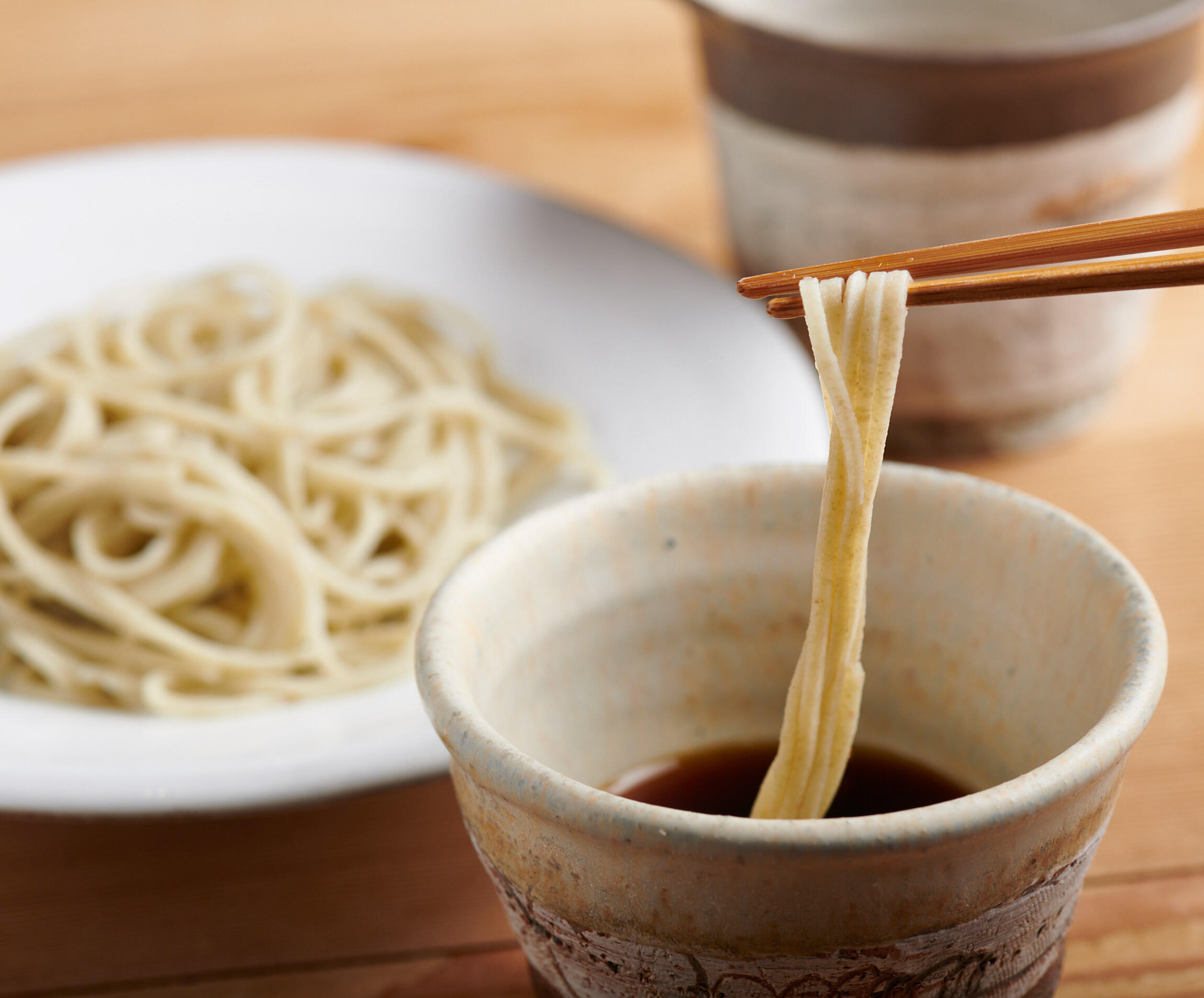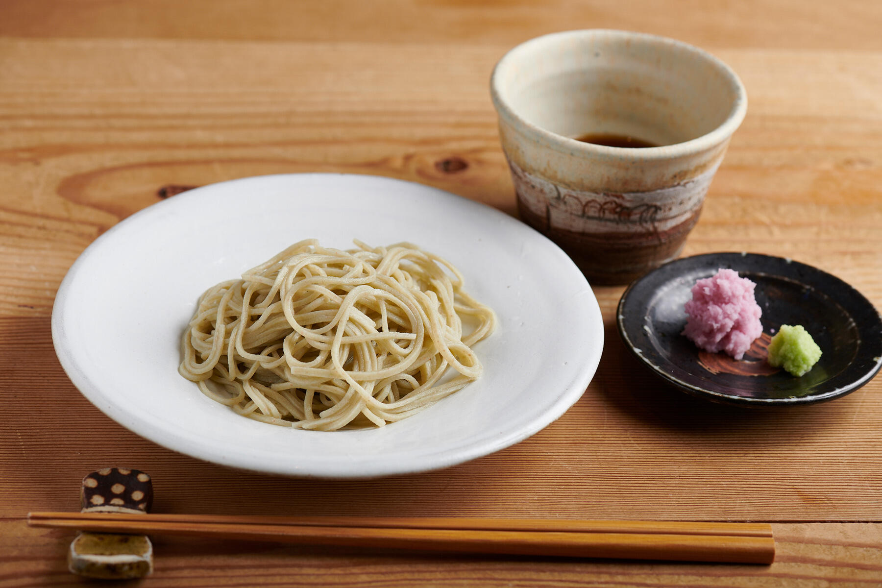 透明感のある繊細な蕎麦に粗い粒子が浮かぶ姿は、野趣と可憐さを兼備。もちっとした食感とともに素朴な甘味がじわじわと湧き上がり、滋味という言葉が浮かんでくる。炊き立てのご飯のような香りもあって、手繰るほどに引き込まれる。